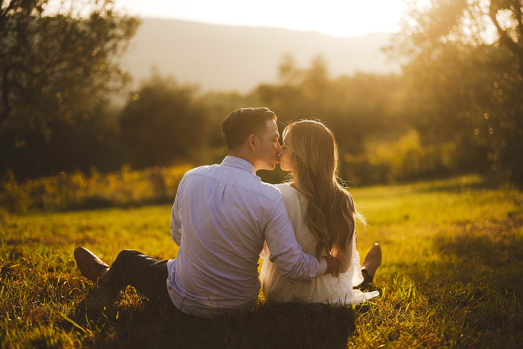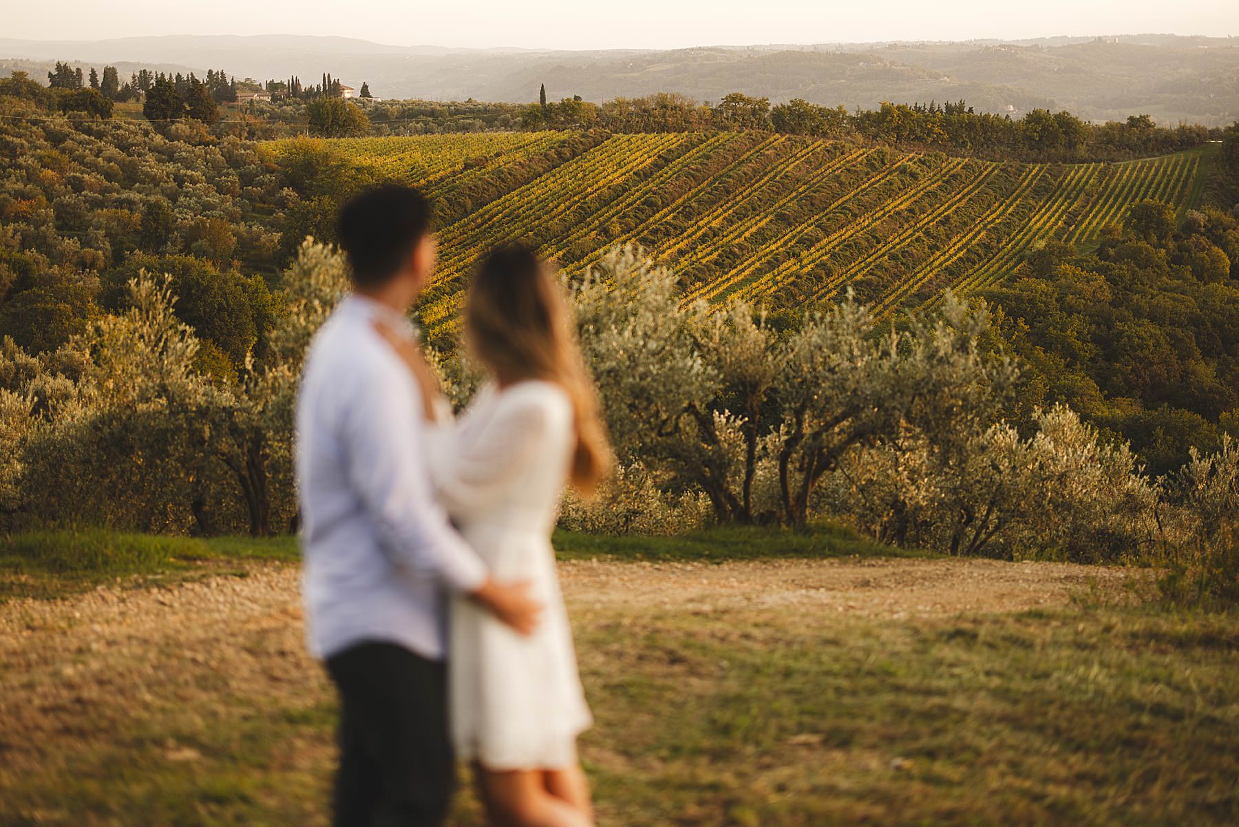 Enchanting prewedding photograph in Chianti countryside taken at golden hour. Photo by the Italian elegant engagement photographer in Tuscany based Florence Gabriele Fani