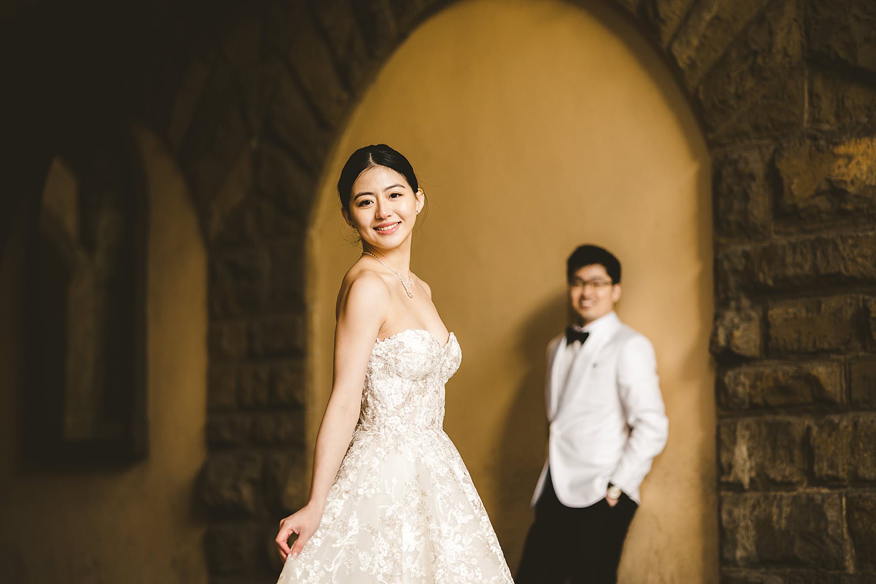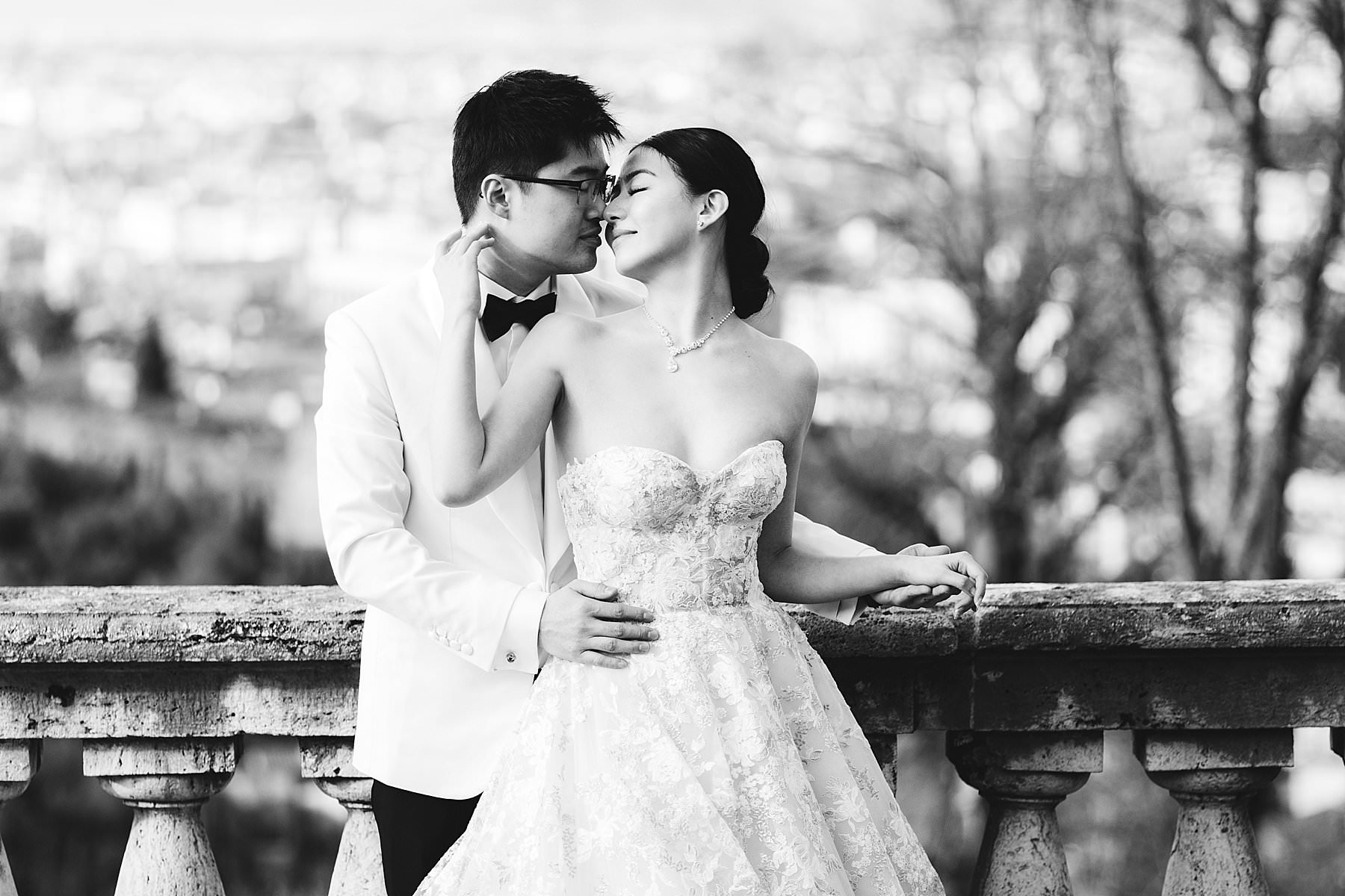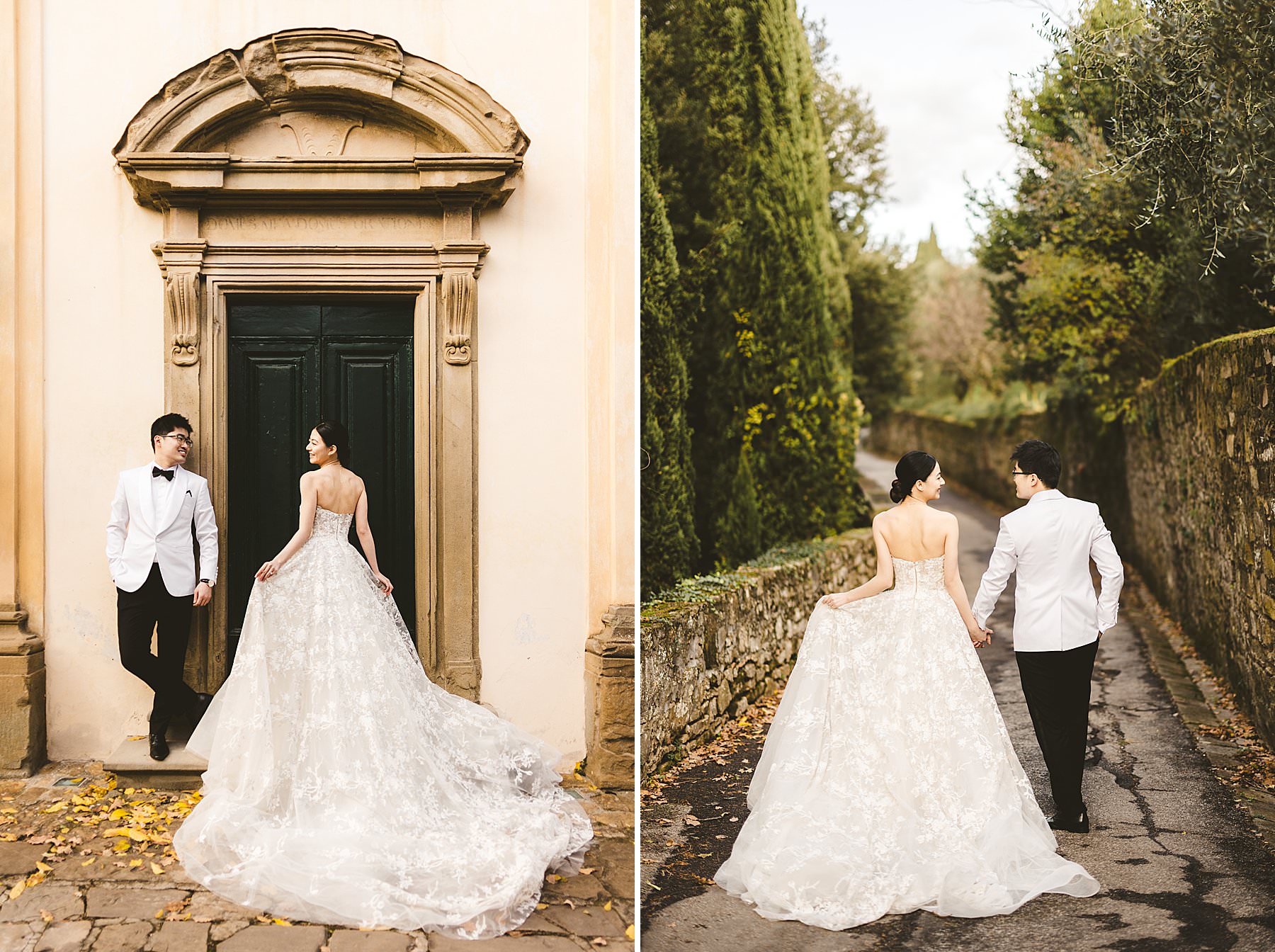This 4-hours long pre-wedding shooting started at Villa Le Piazzole, a charming estate right out of Florence. Carmen and Yang chose this accommodation on purpose, because they fell in love with its amazing and very well-kept Italian garden. We took some extremely beautiful winter engagement pictures there, indeed! From the upper floors, the venue also offers a breathtaking view of the park and surrounding countryside – so we seized the chance to shoot some incredible photos from there too.