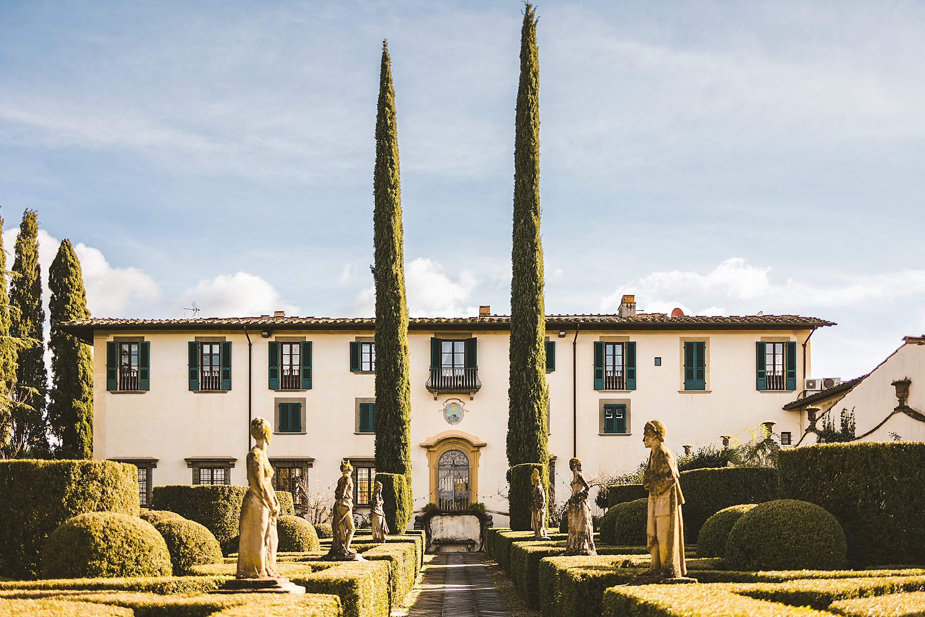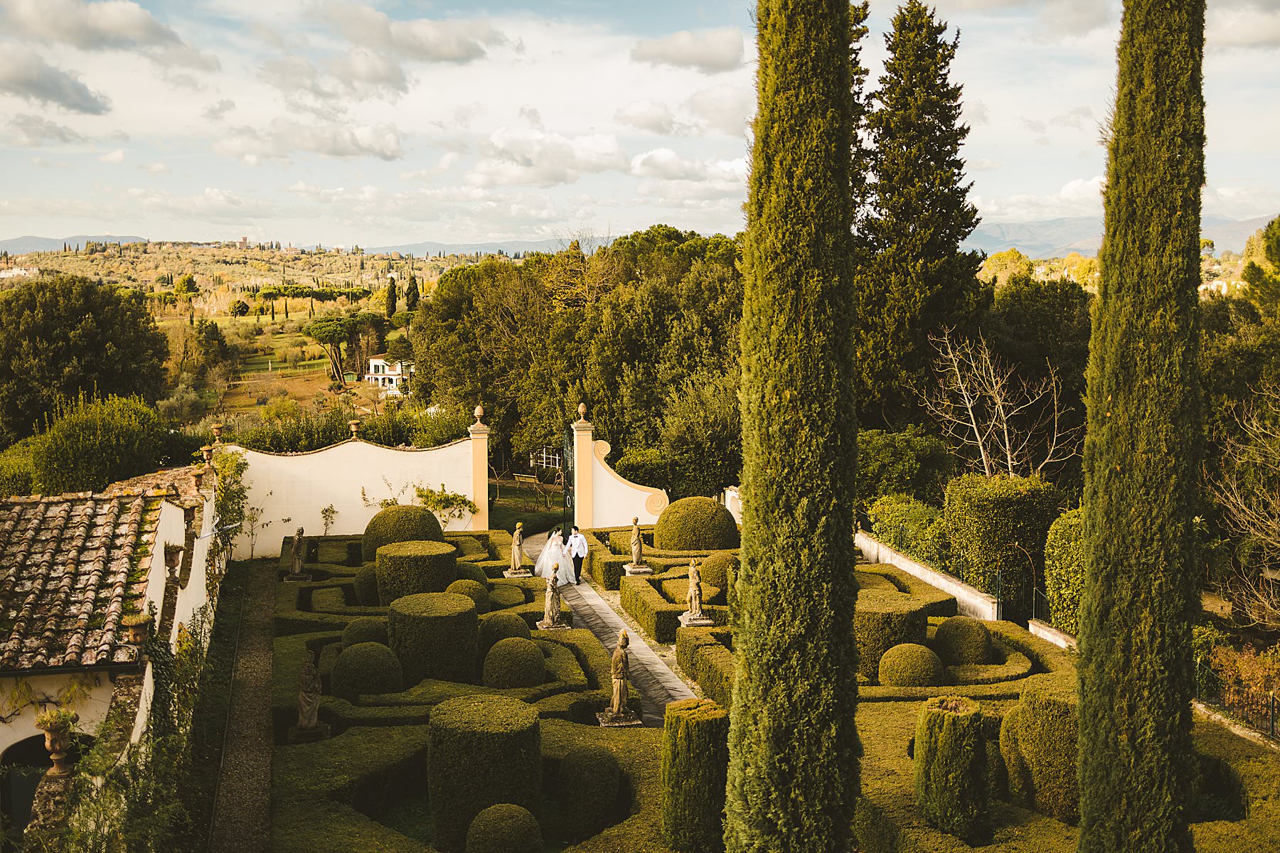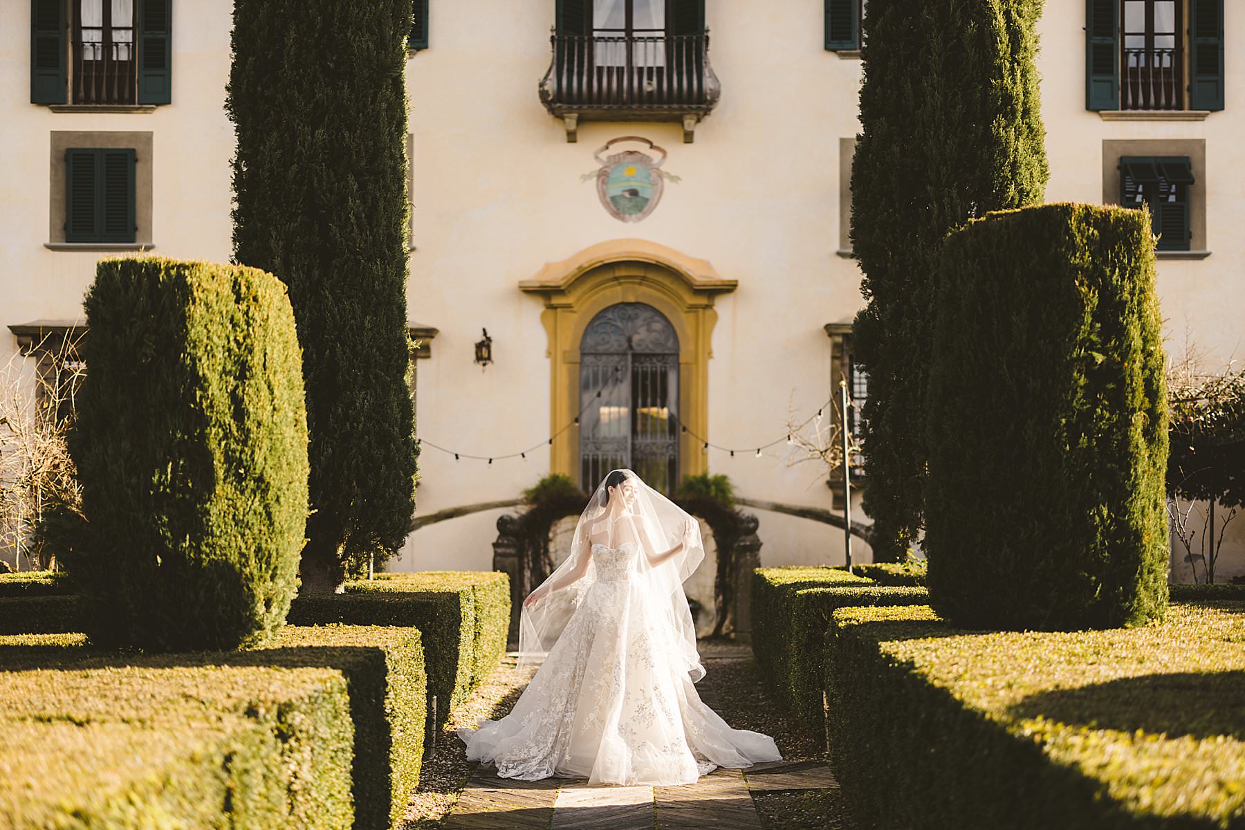 This 4-hours long pre-wedding shooting started at Villa Le Piazzole, a charming estate right out of Florence. Carmen and Yang chose this accommodation on purpose, because they fell in love with its amazing and very well-kept Italian garden. We took some extremely beautiful winter engagement pictures there, indeed! From the upper floors, the venue also offers a breathtaking view of the park and surrounding countryside – so we seized the chance to shoot some incredible photos from there too.