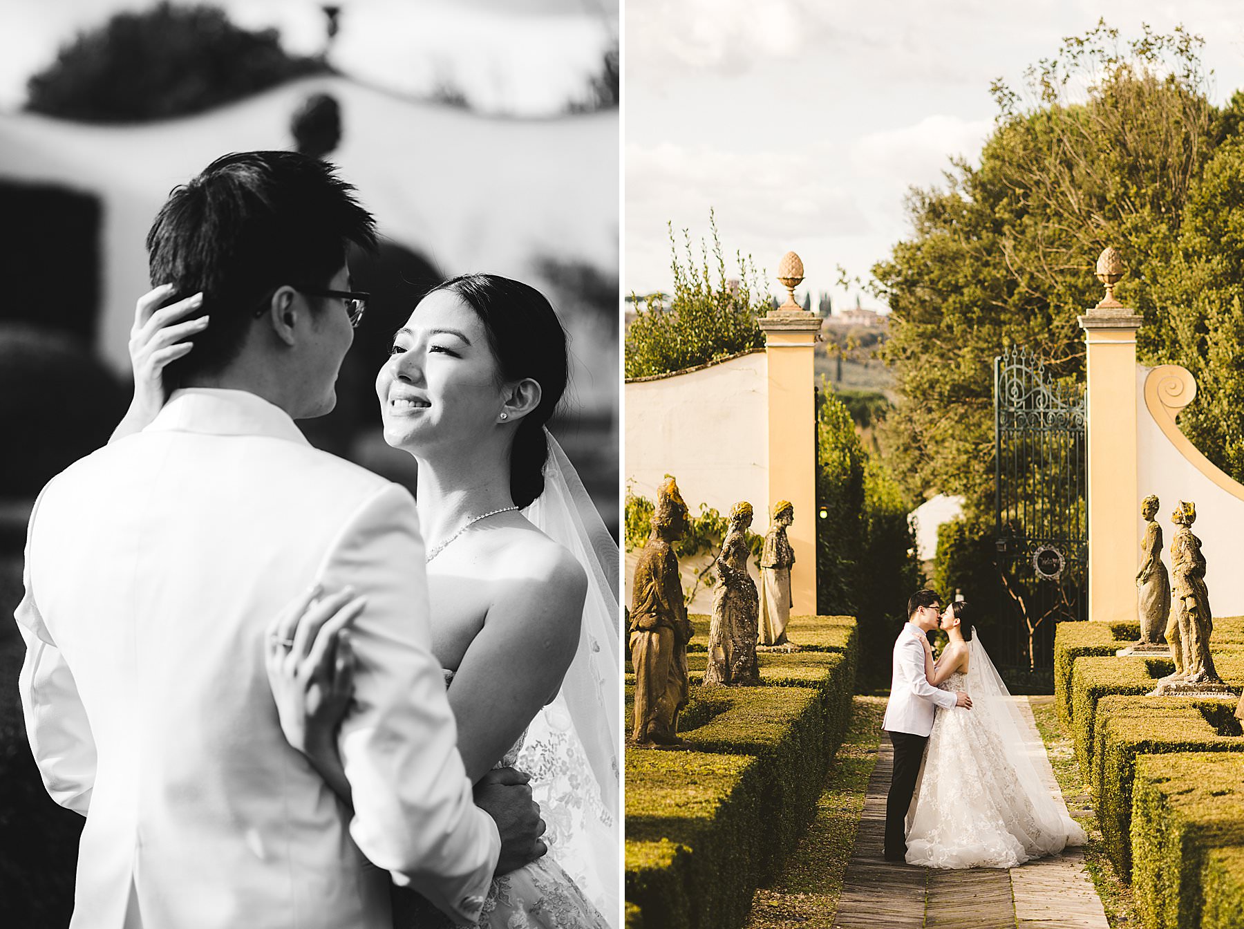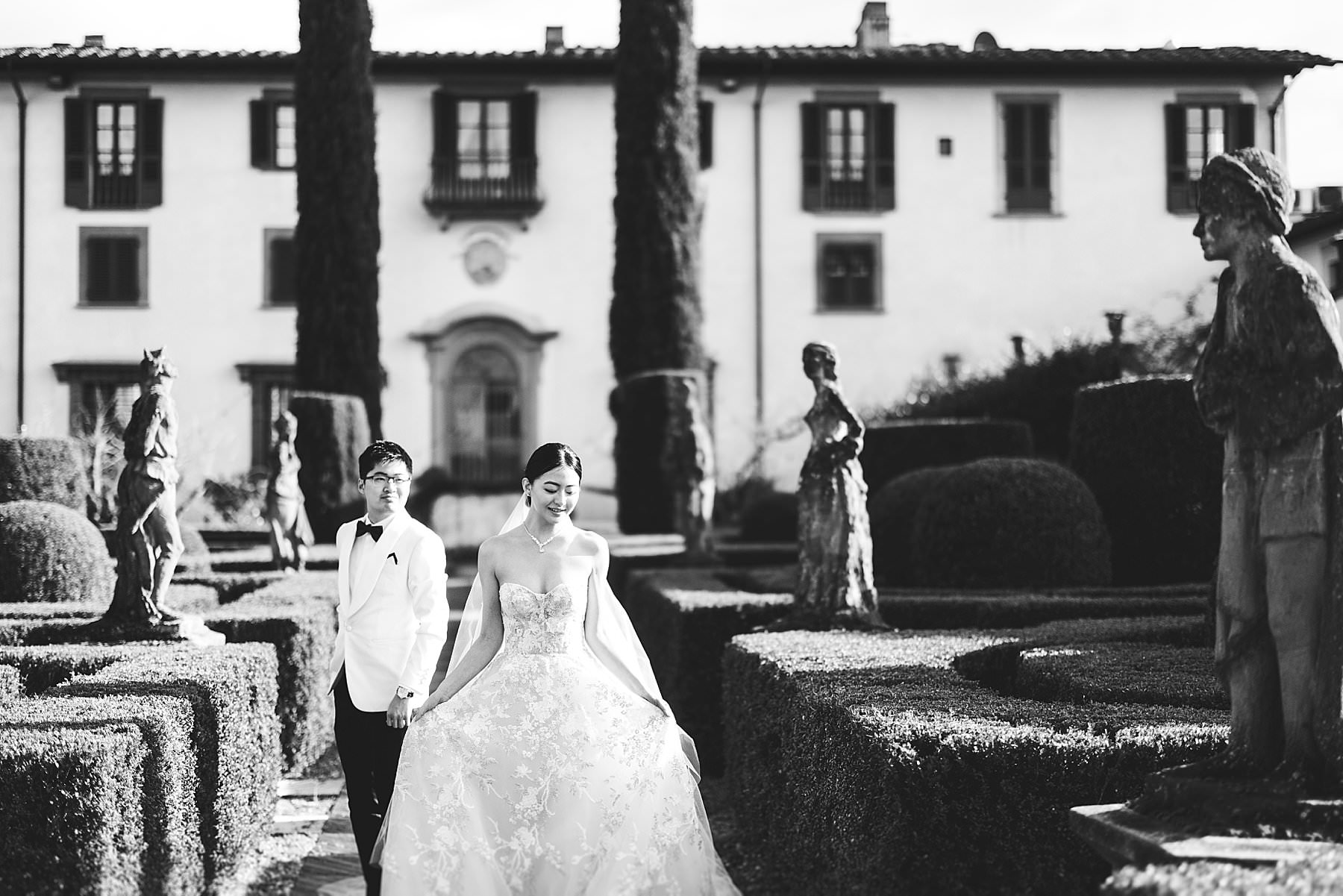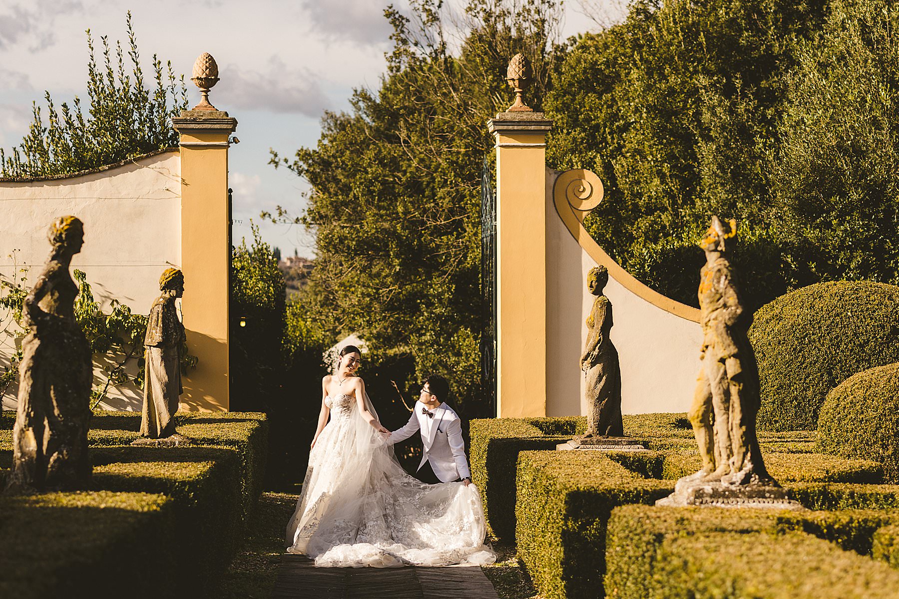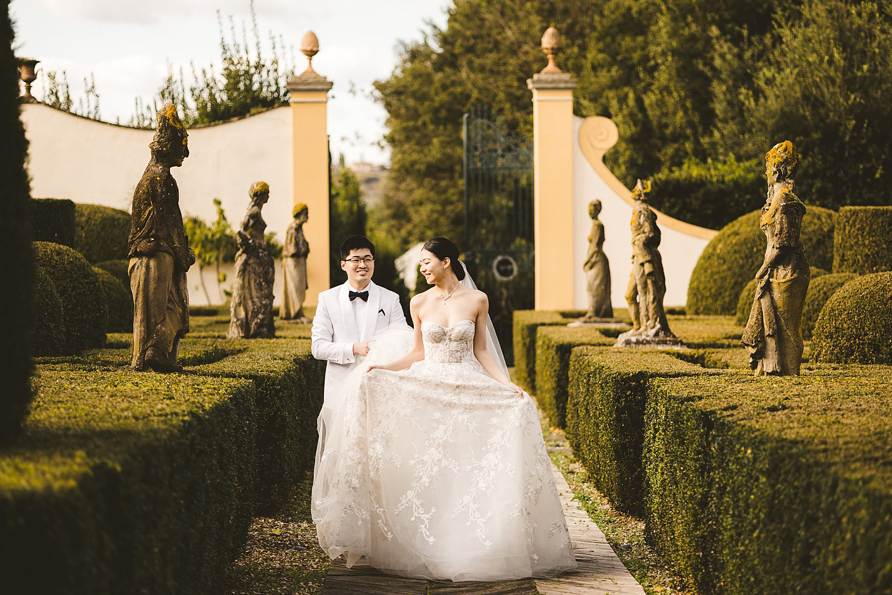 Elegant asian couple pre-wedding photo shoot in Florence at Villa Le Piazzole in the Italian garden. Photo by the Italian classic and elegant engagement photographer in Tuscany based Florence Gabriele Fani