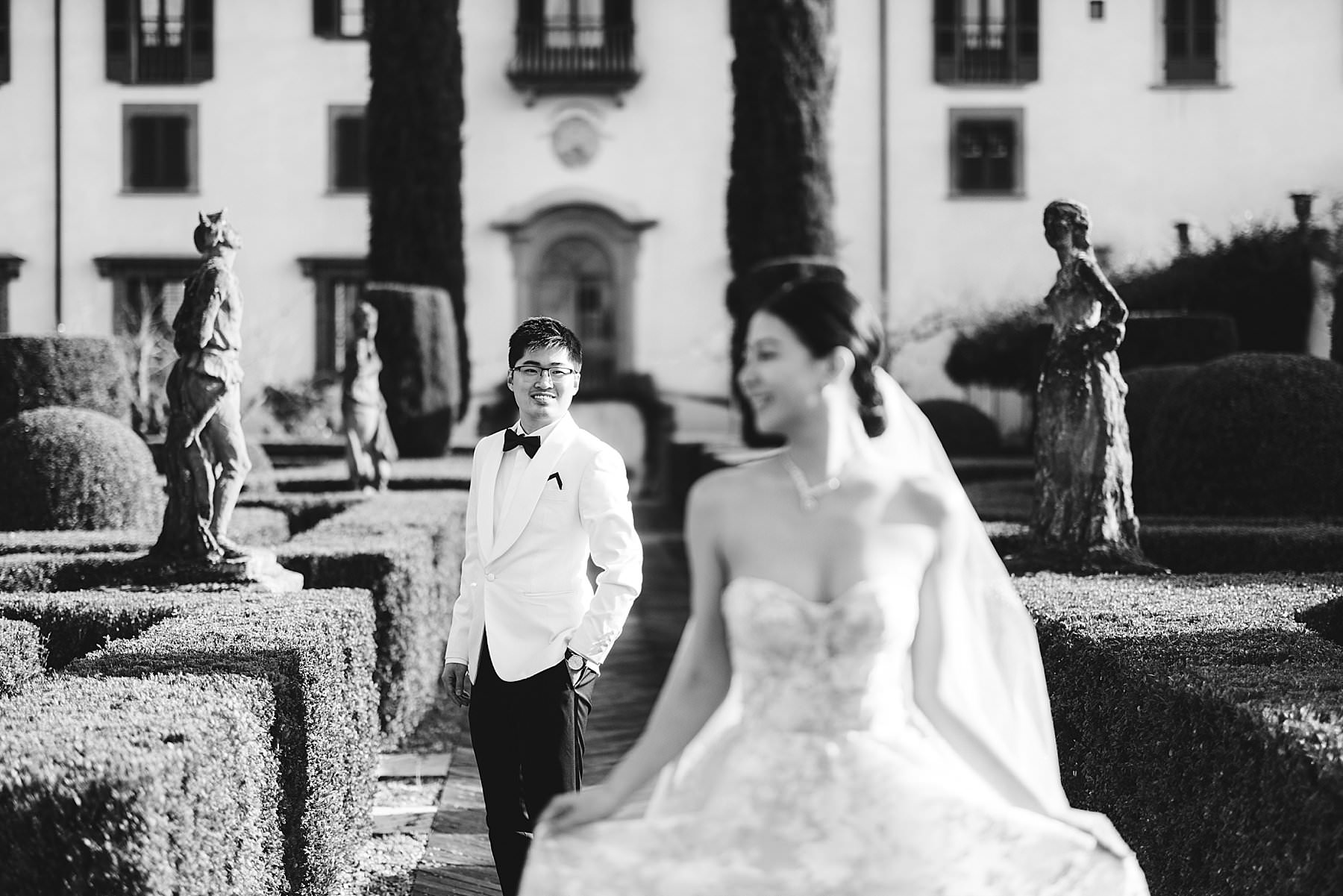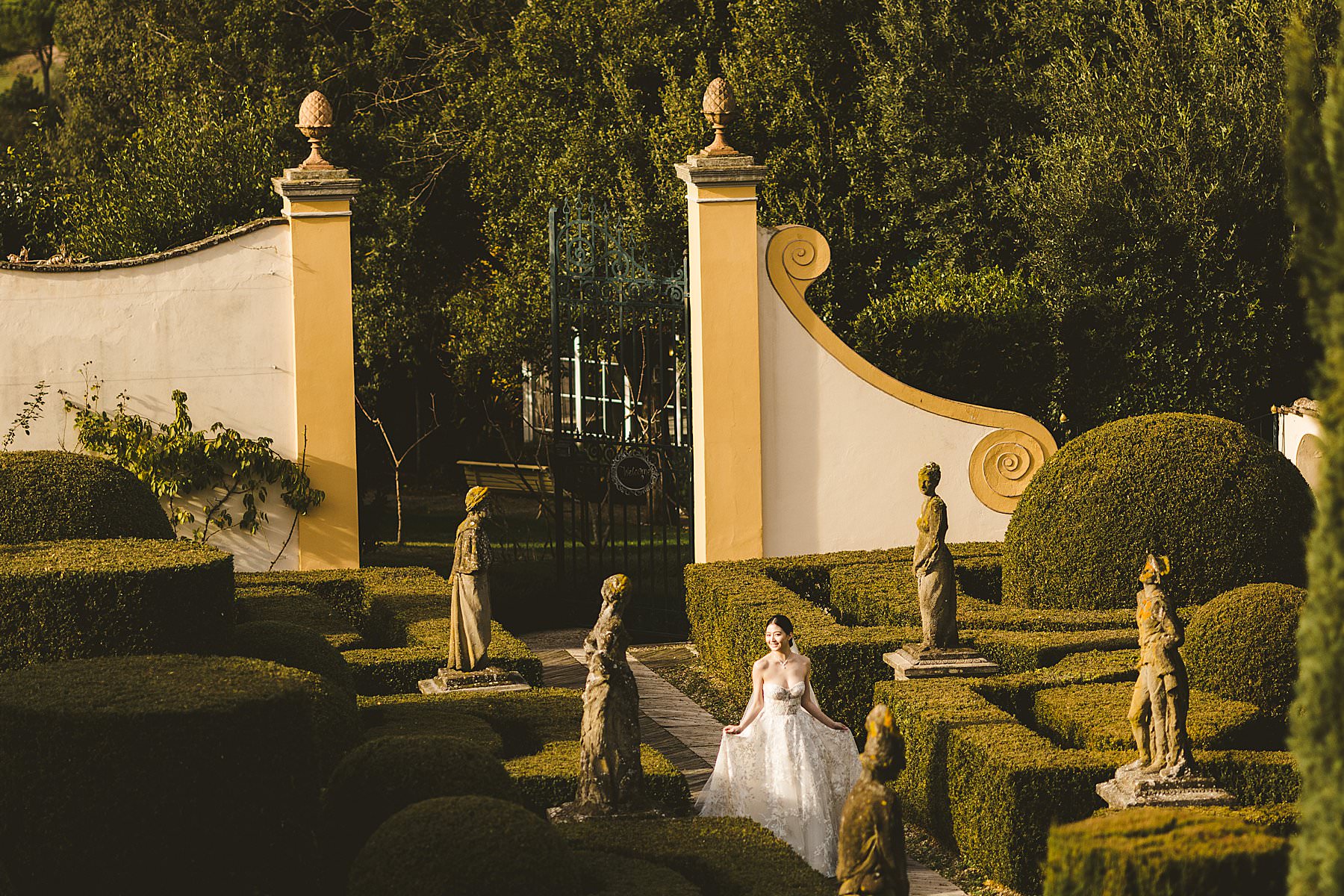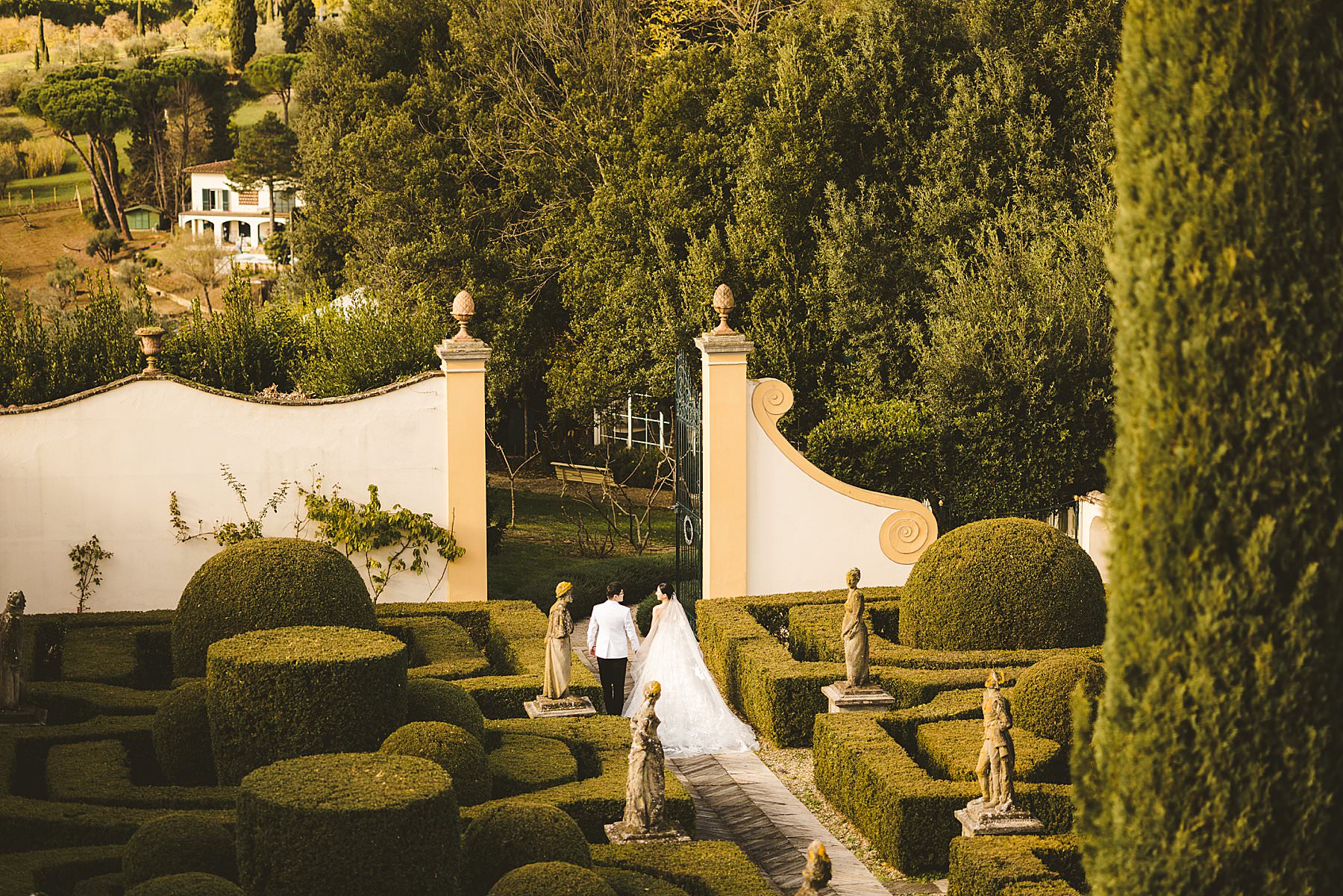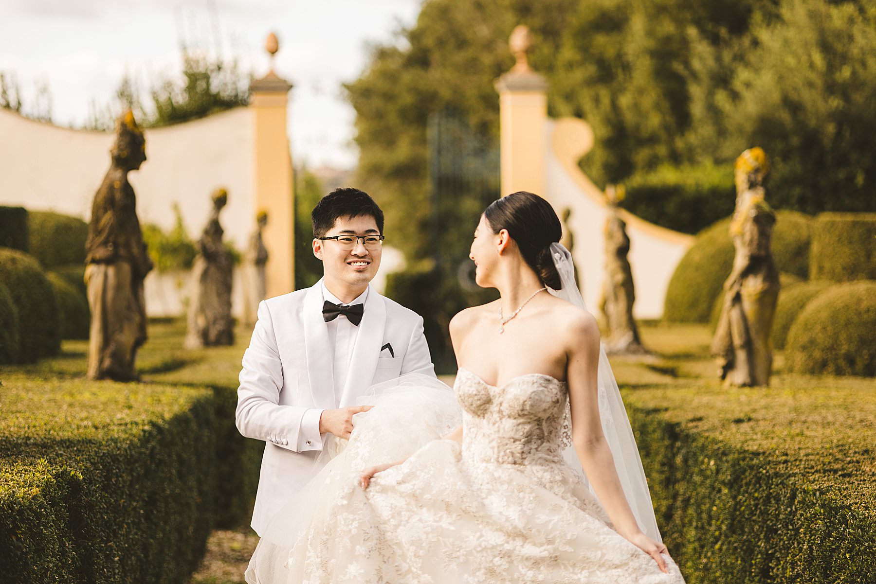 Elegant asian couple pre-wedding photo shoot in Florence at Villa Le Piazzole in the Italian garden. Photo by the Italian classic and elegant engagement photographer in Tuscany based Florence Gabriele Fani
