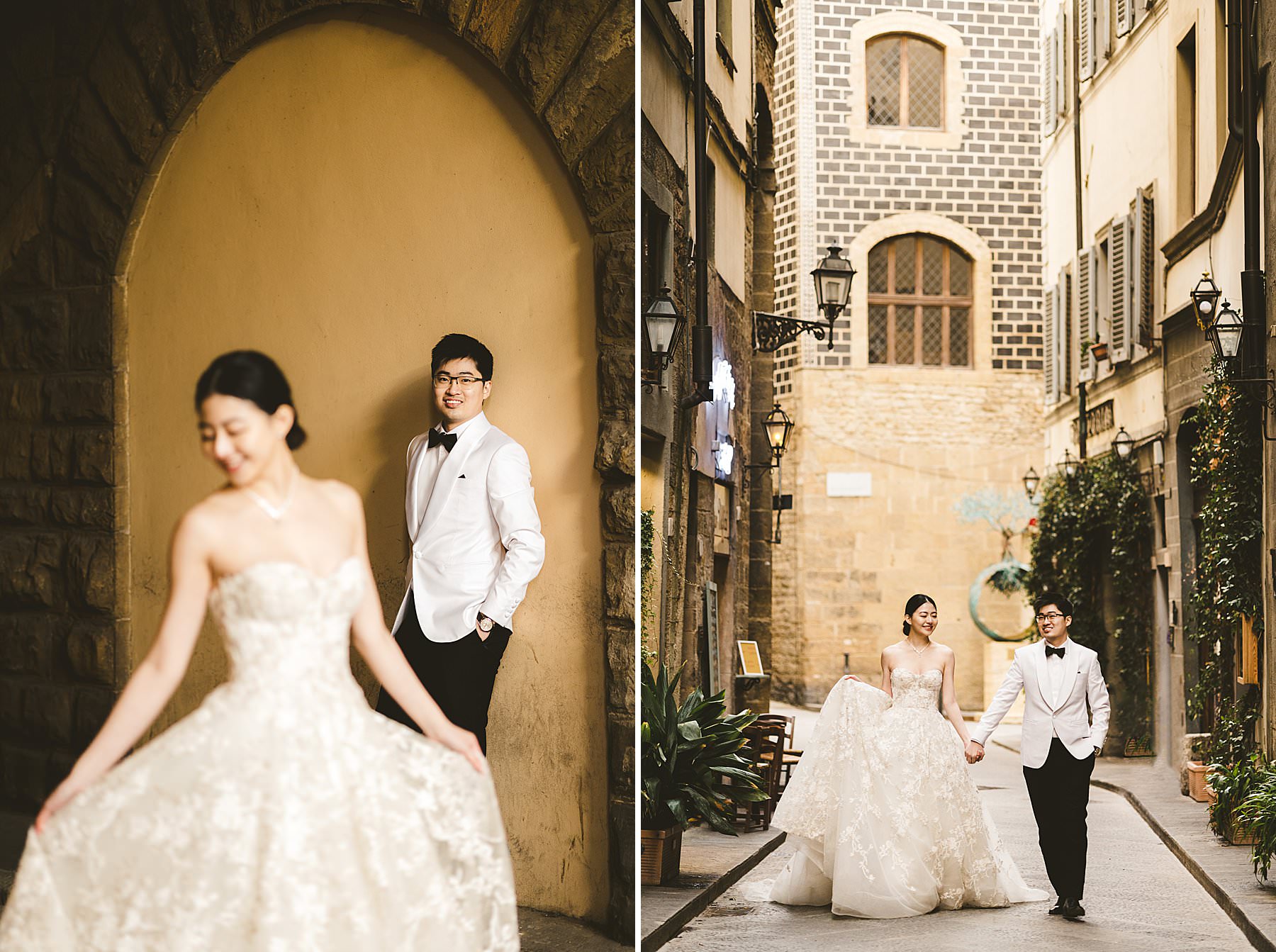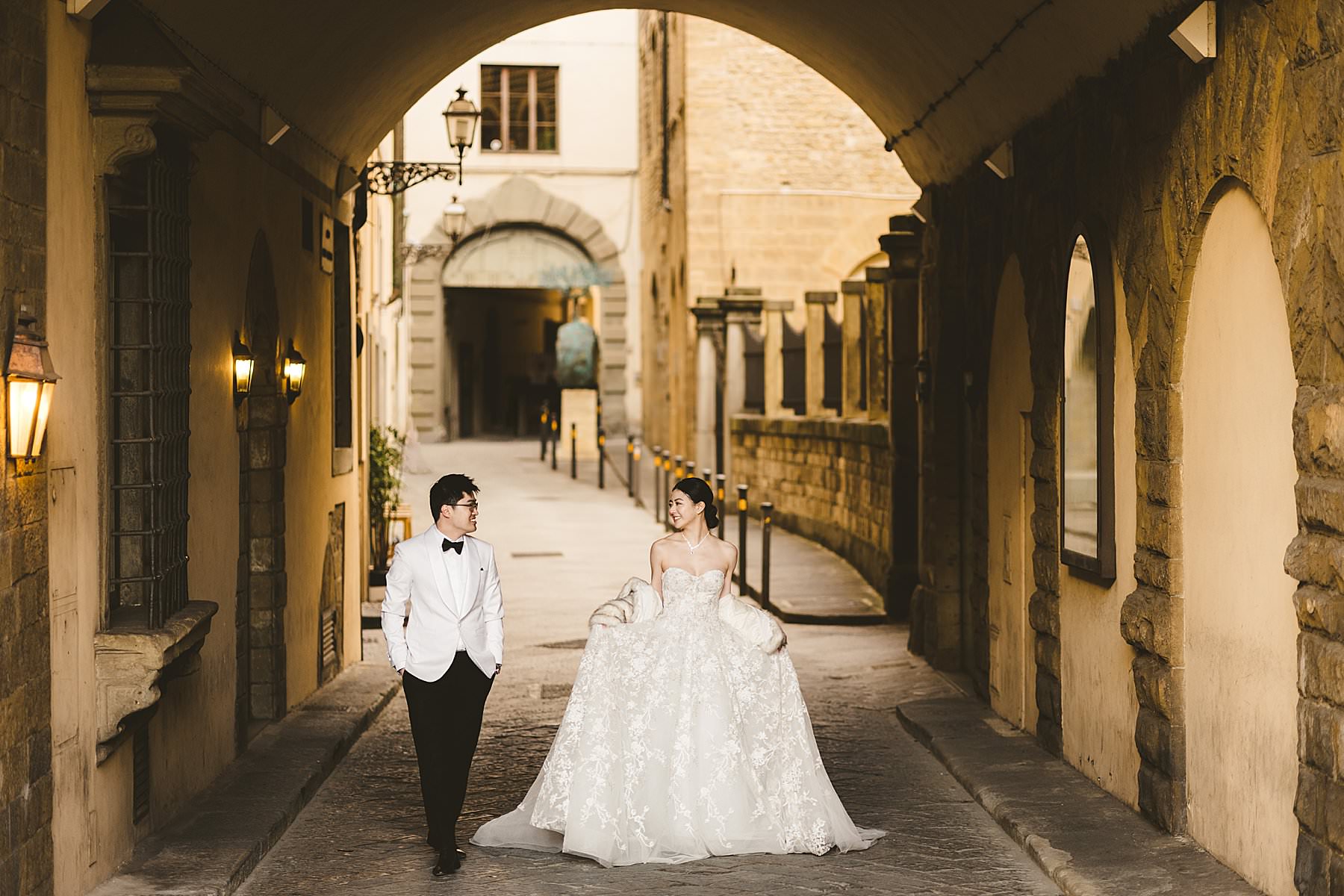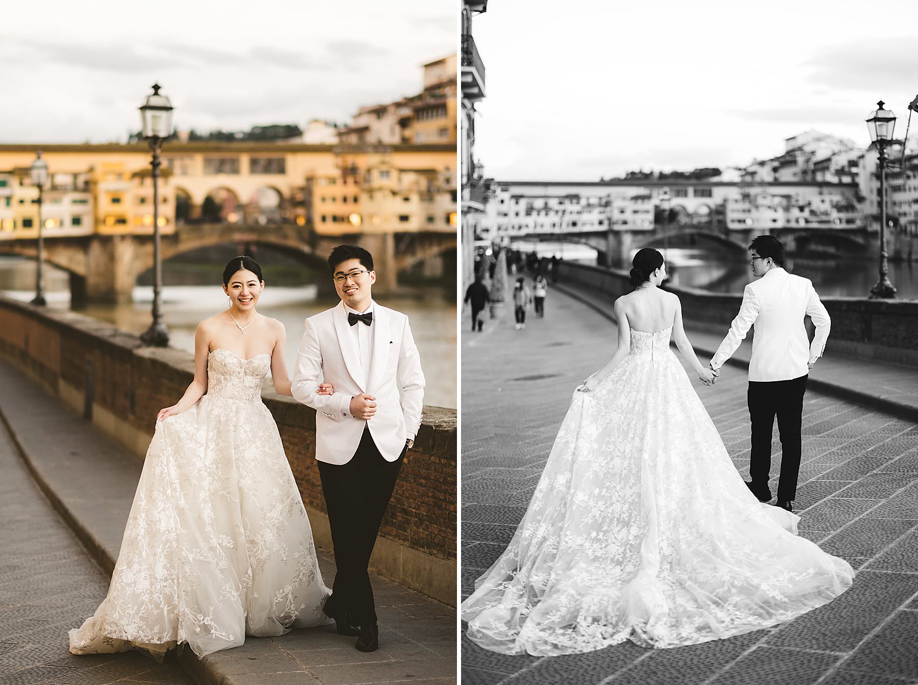 Elegant pre-wedding walk tour photo shoot in the streets of Florence with wedding outfits. Photo by the Italian classic and elegant engagement photographer in Tuscany based Florence Gabriele Fani
