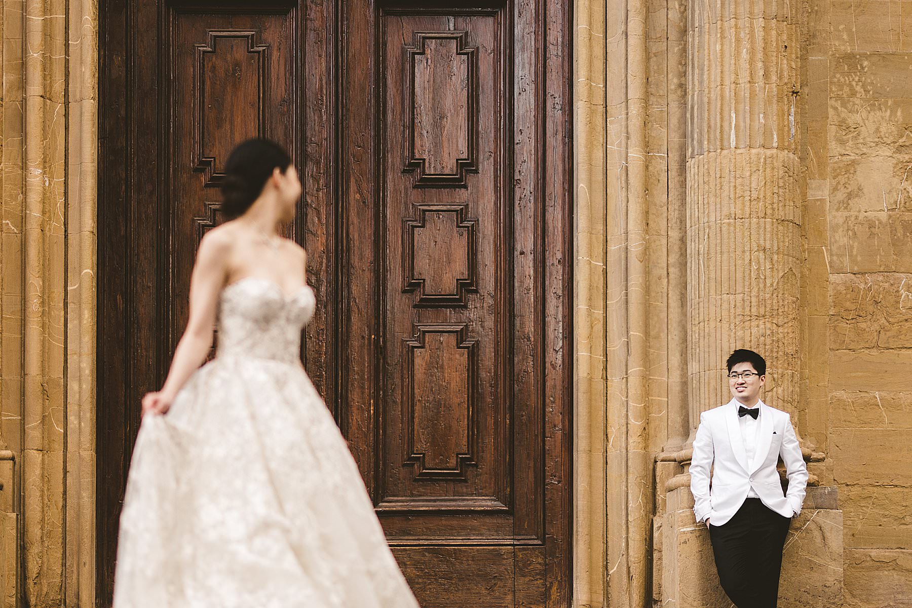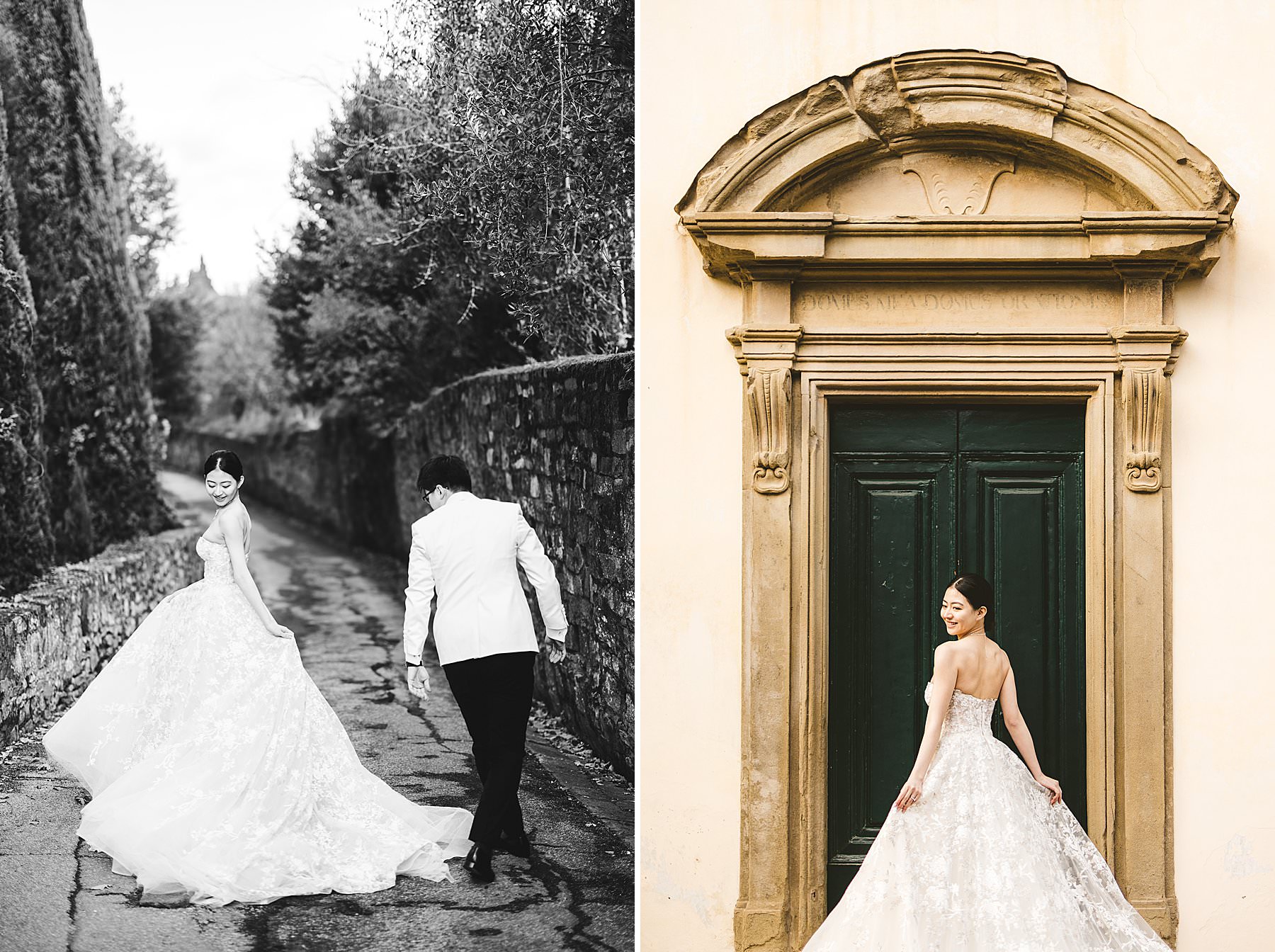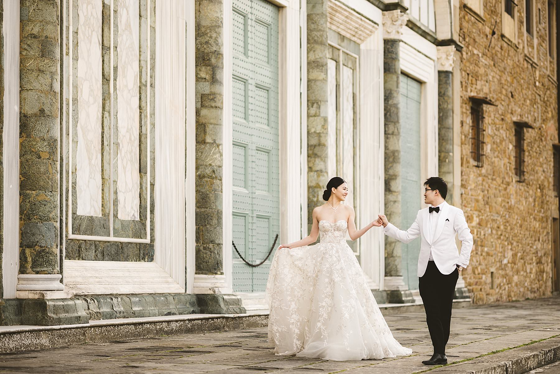 Elegant pre-wedding walk tour photo shoot in the streets of Florence with wedding outfits. Photo by the Italian classic and elegant engagement photographer in Tuscany based Florence Gabriele Fani