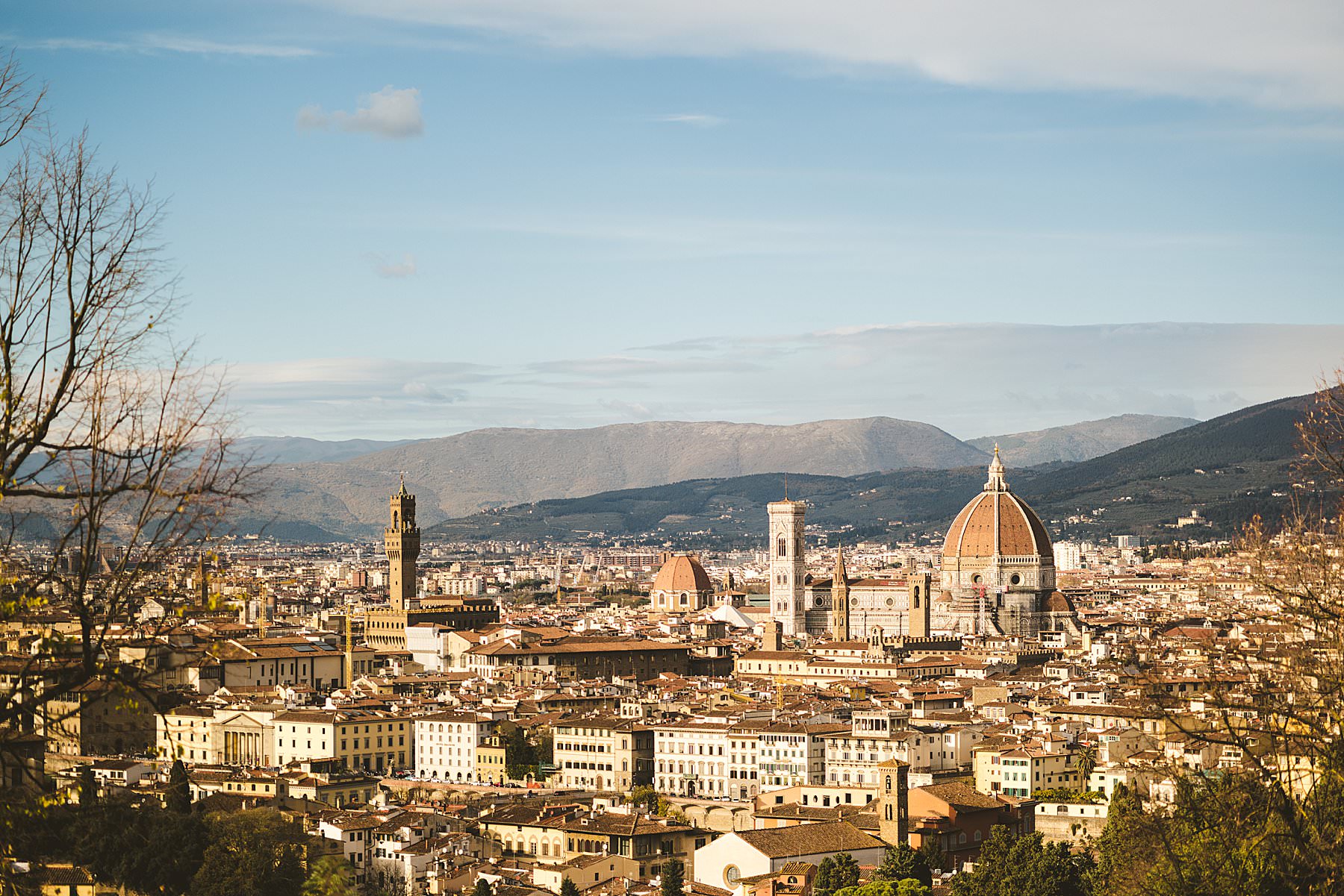 Romantic and elegant winter pre-wedding engagement photo session in the most iconic panoramic spot of Florence. Photo by the Italian classic and elegant engagement photographer in Tuscany based Florence Gabriele Fani