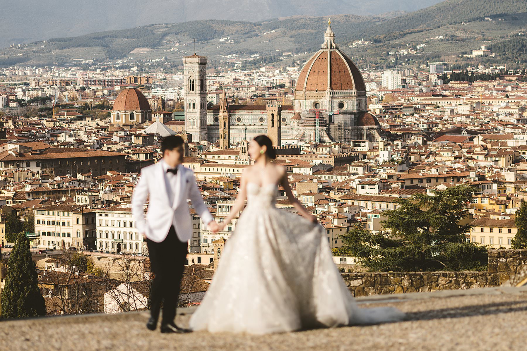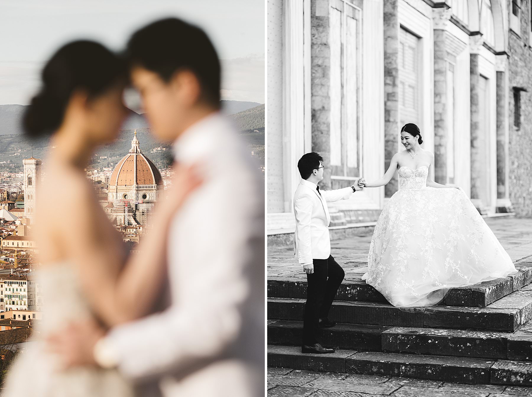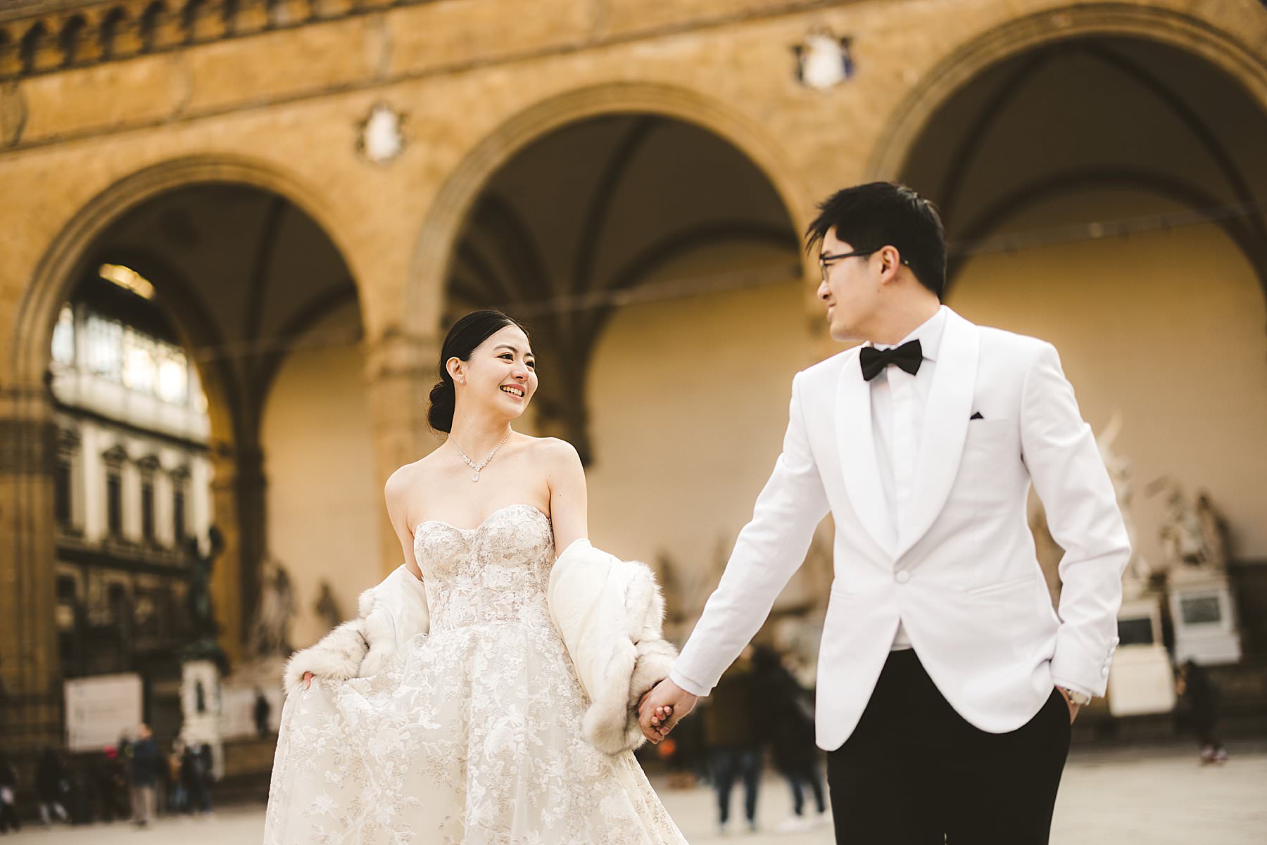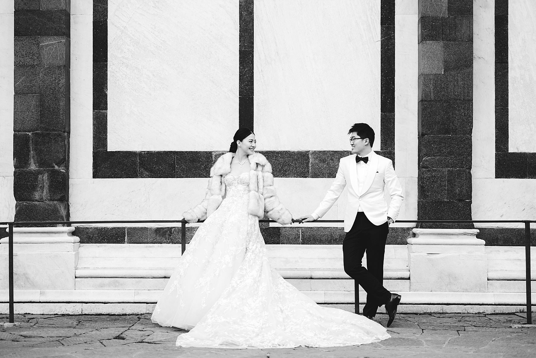 The second part of the engagement session took place in the city: even though tourists usually come in the summer, Florence in winter has a magic allure. From San Miniato al Monte to the historic heart of town, I pictured Carmen and Yang in all of the most iconic spots. I loved their wedding outfits, both white: they convey to each photo a touch of undisputable grace and sophistication.
