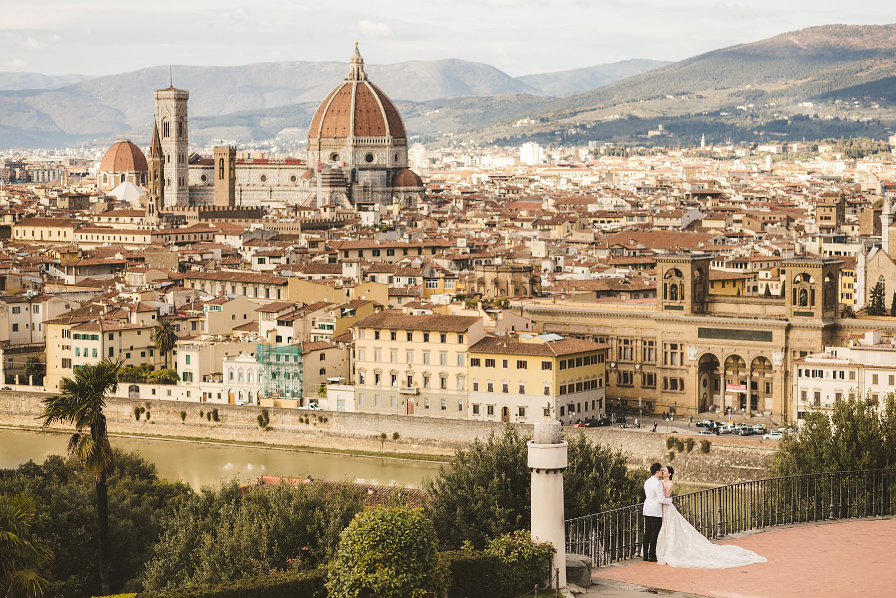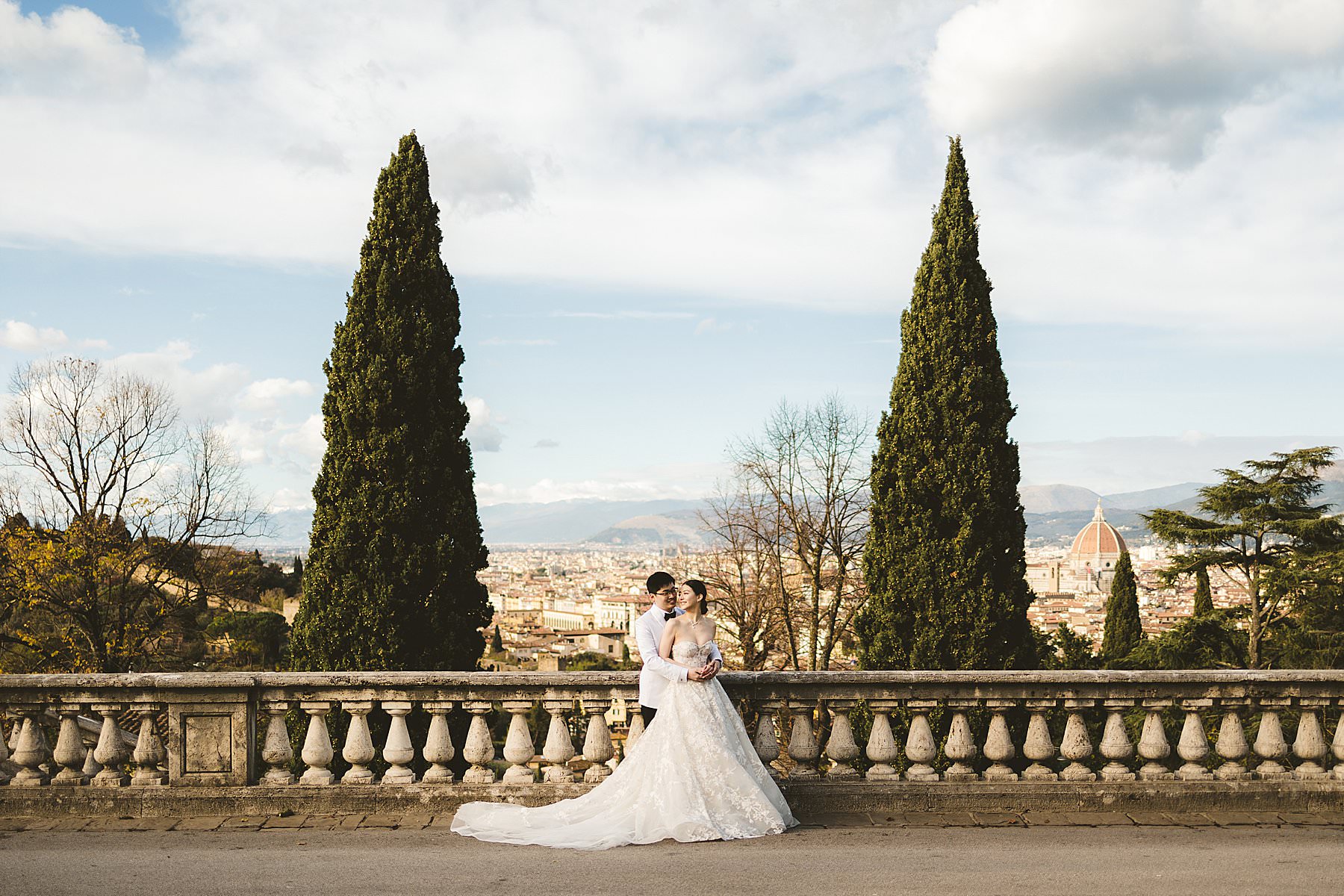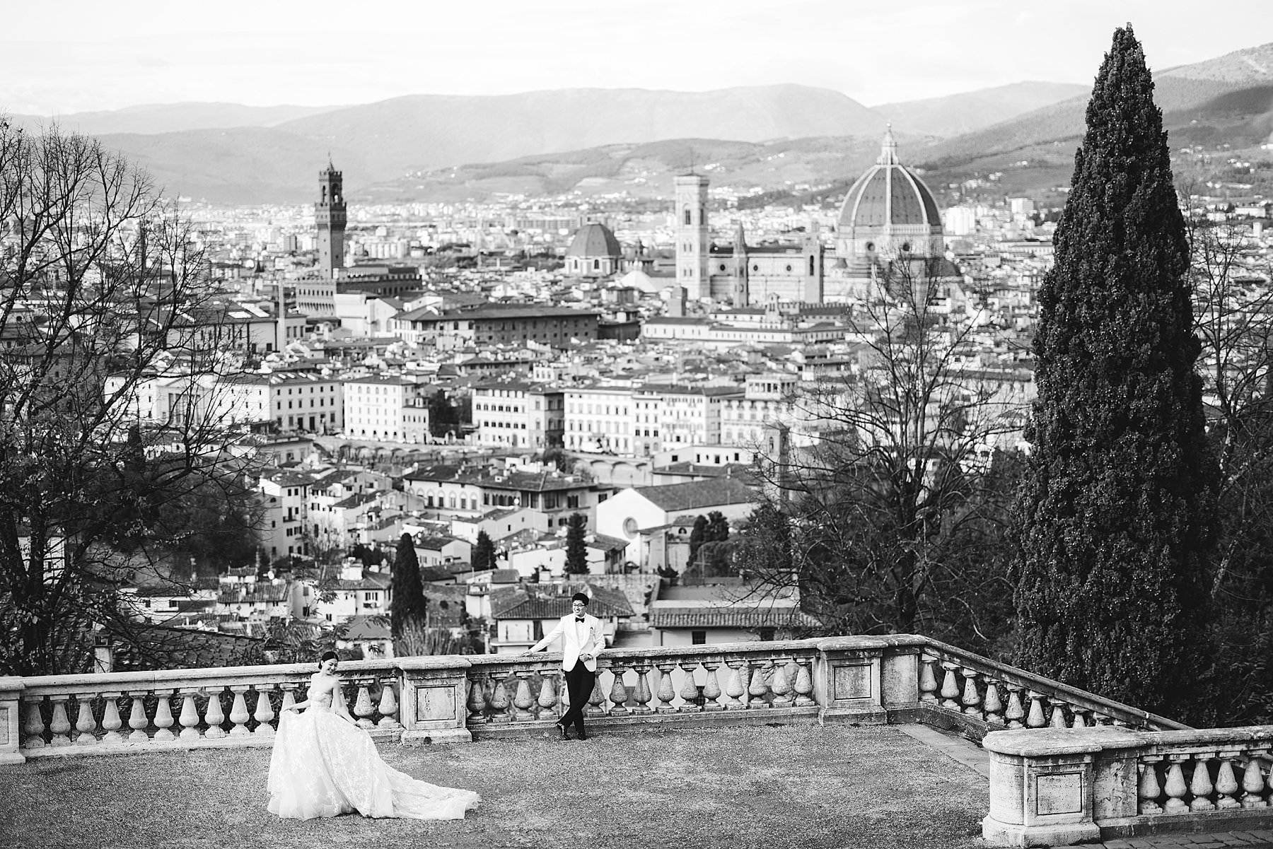 Unforgettable and romantic winter pre-wedding couple portrait photo shoot with wedding dresses in the most iconic panoramic location of Florence. Photo by the Italian classic and elegant engagement photographer in Tuscany based Florence Gabriele Fani
