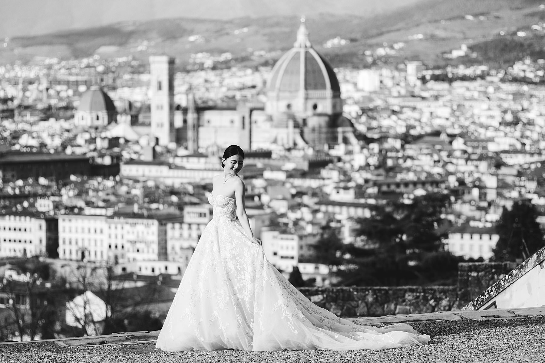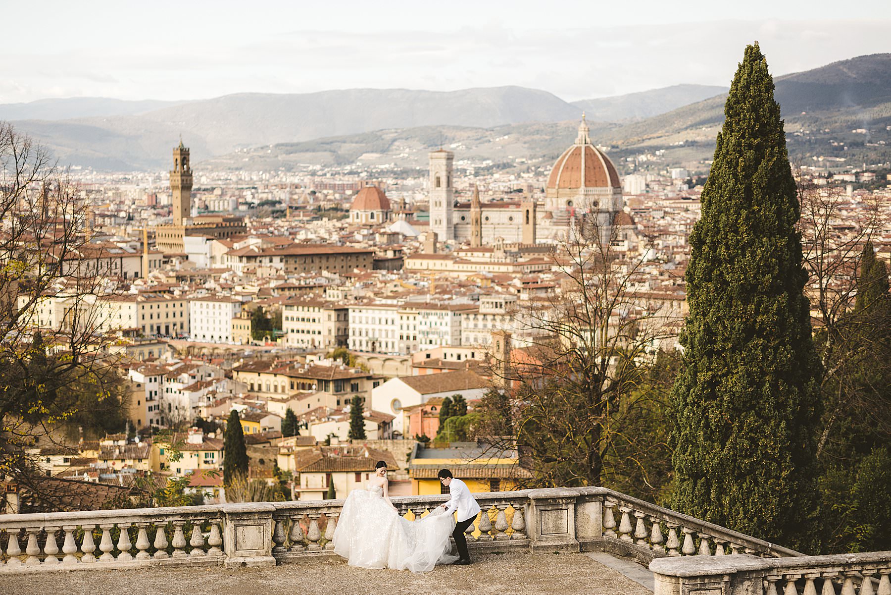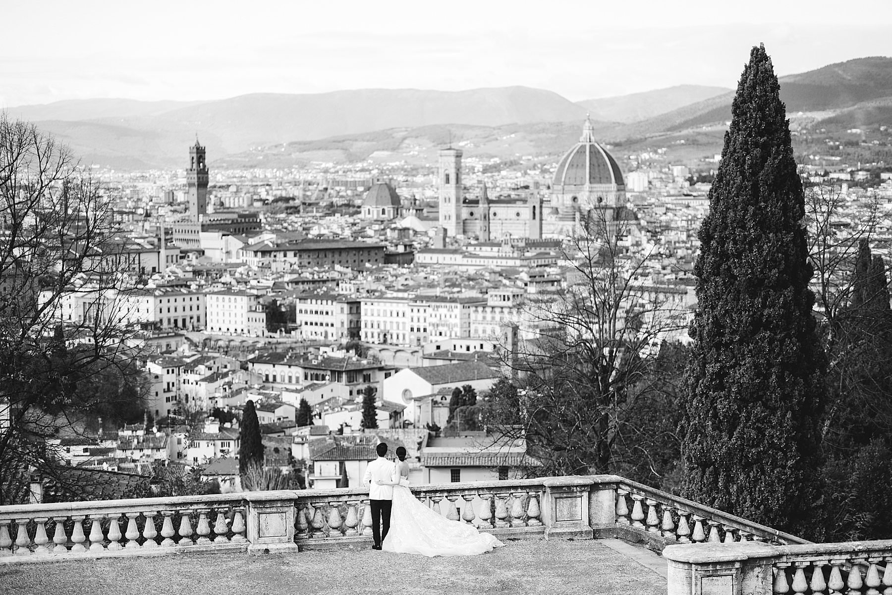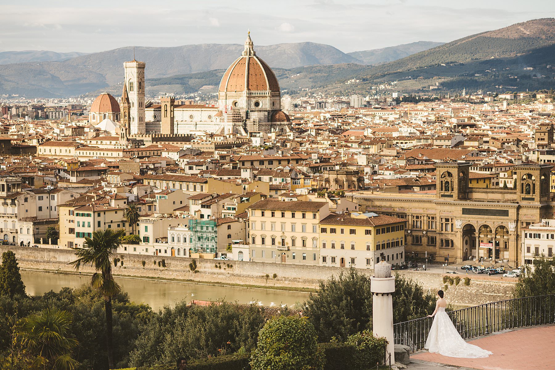 Unforgettable and romantic winter pre-wedding couple portrait photo shoot with wedding dresses in the most iconic panoramic location of Florence. Photo by the Italian classic and elegant engagement photographer in Tuscany based Florence Gabriele Fani