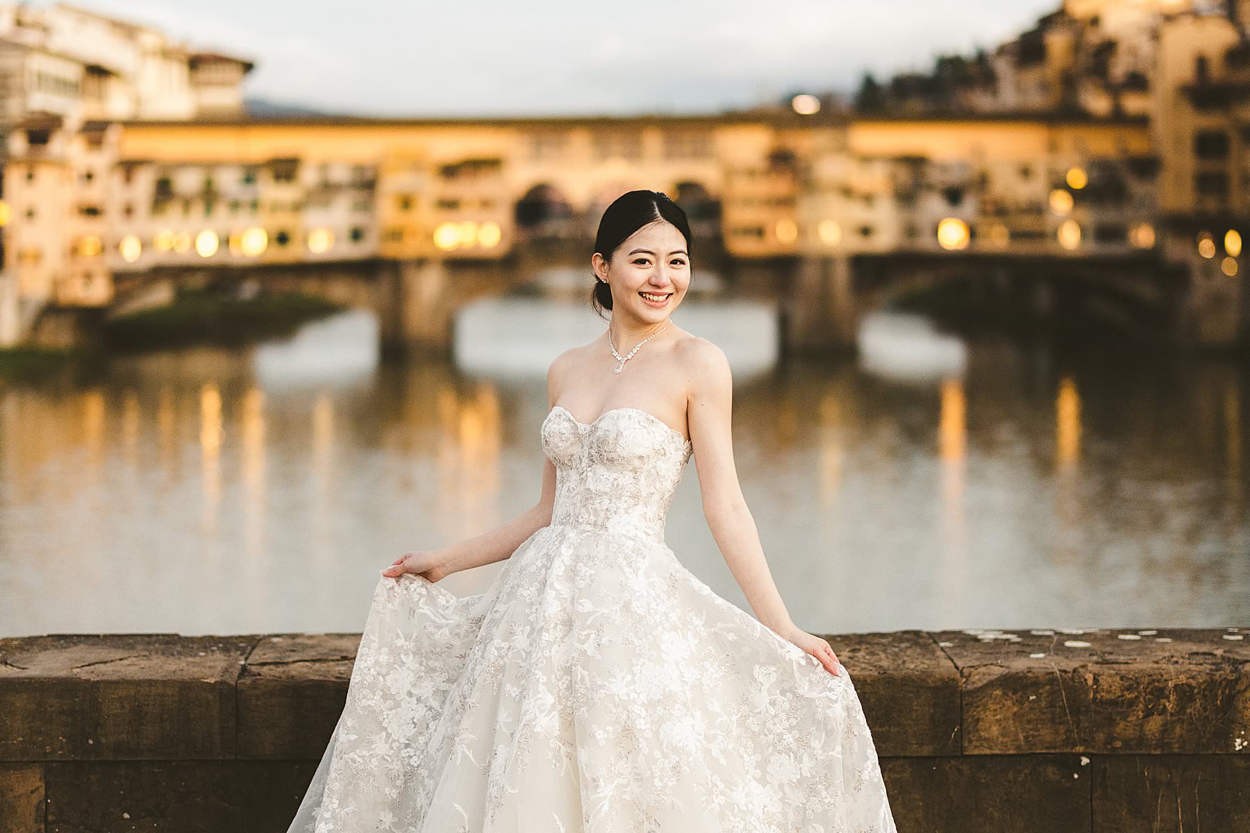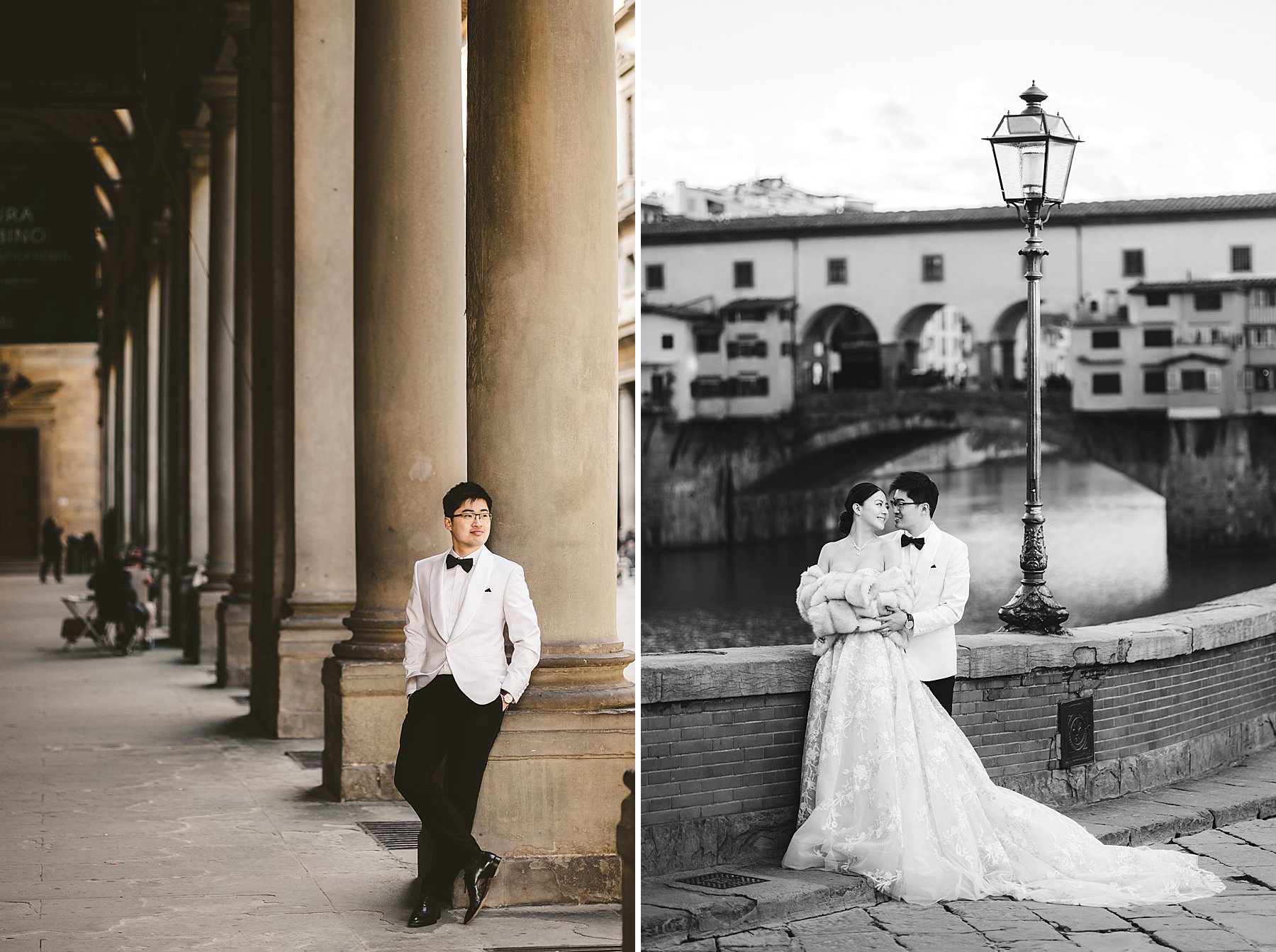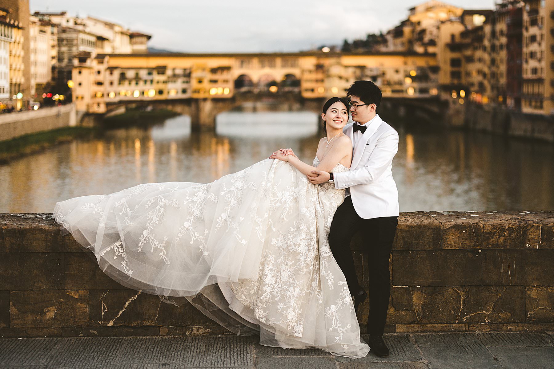 Beautiful winter pre-wedding photo session in Florence near the Ponte Vecchio with white wedding outfits. Photo by the Italian classic and elegant engagement photographer in Tuscany based Florence Gabriele Fani
