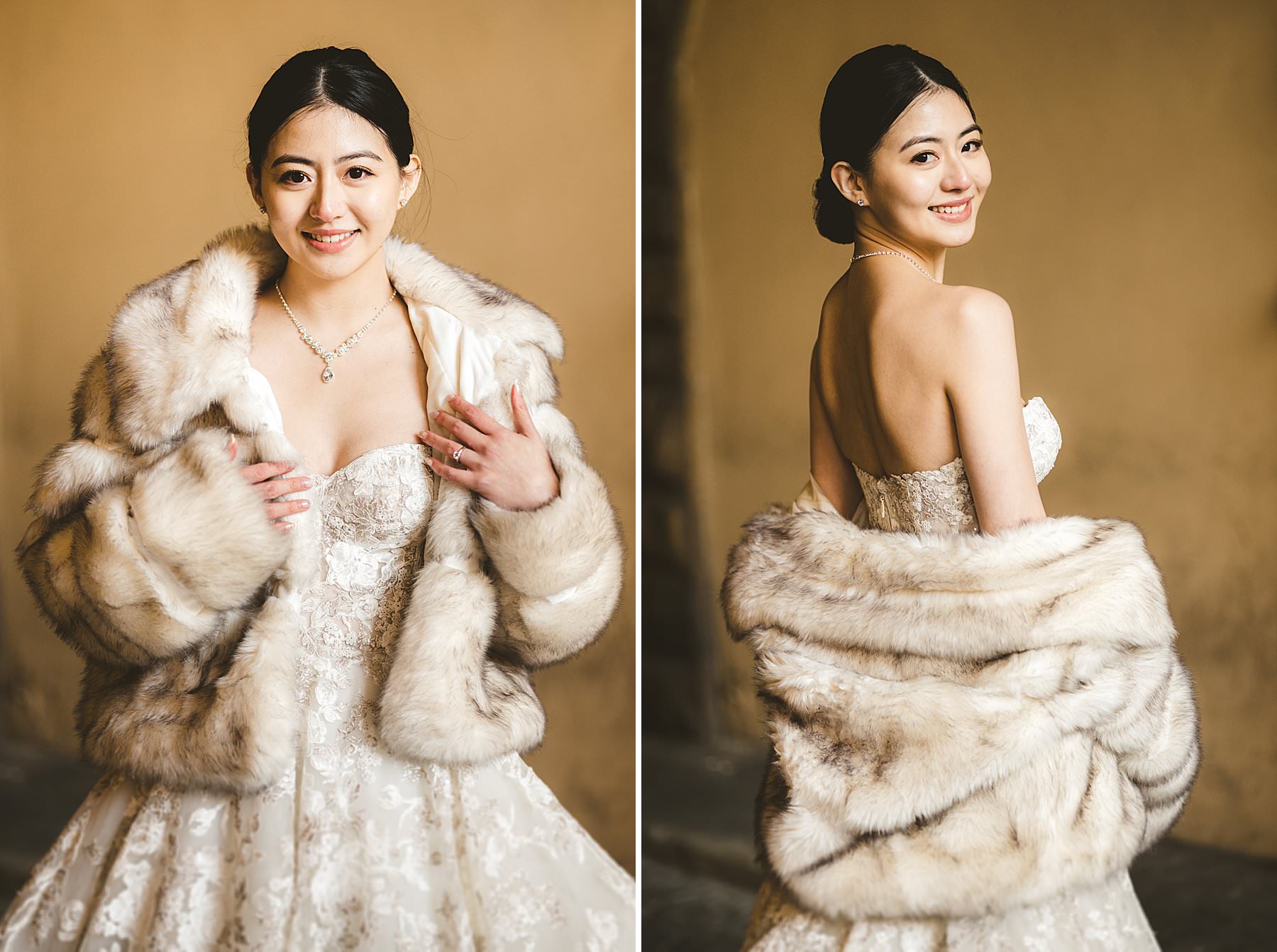 Lovely and elegant winter bridal portrait in the streets of Florence. Photo by the Italian classic and elegant engagement photographer in Tuscany based Florence Gabriele Fani