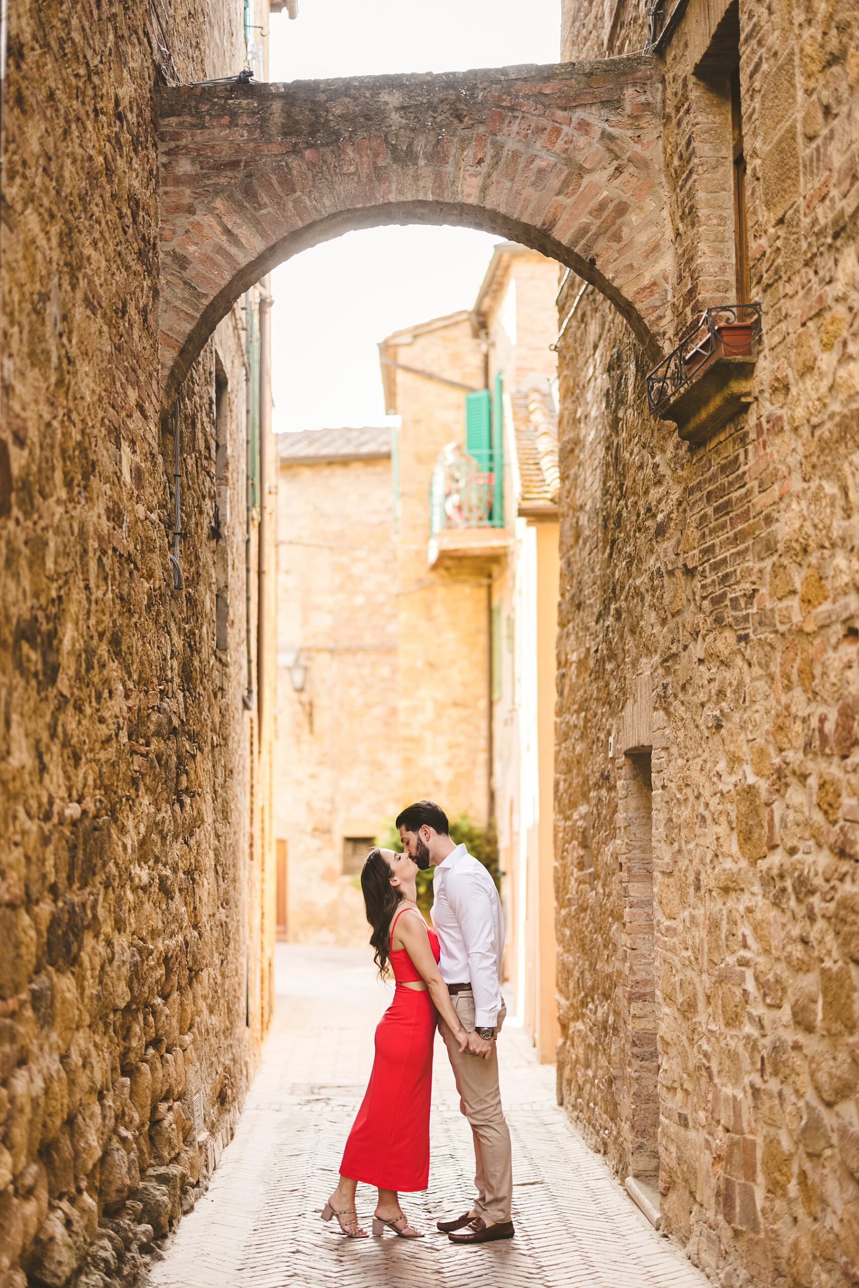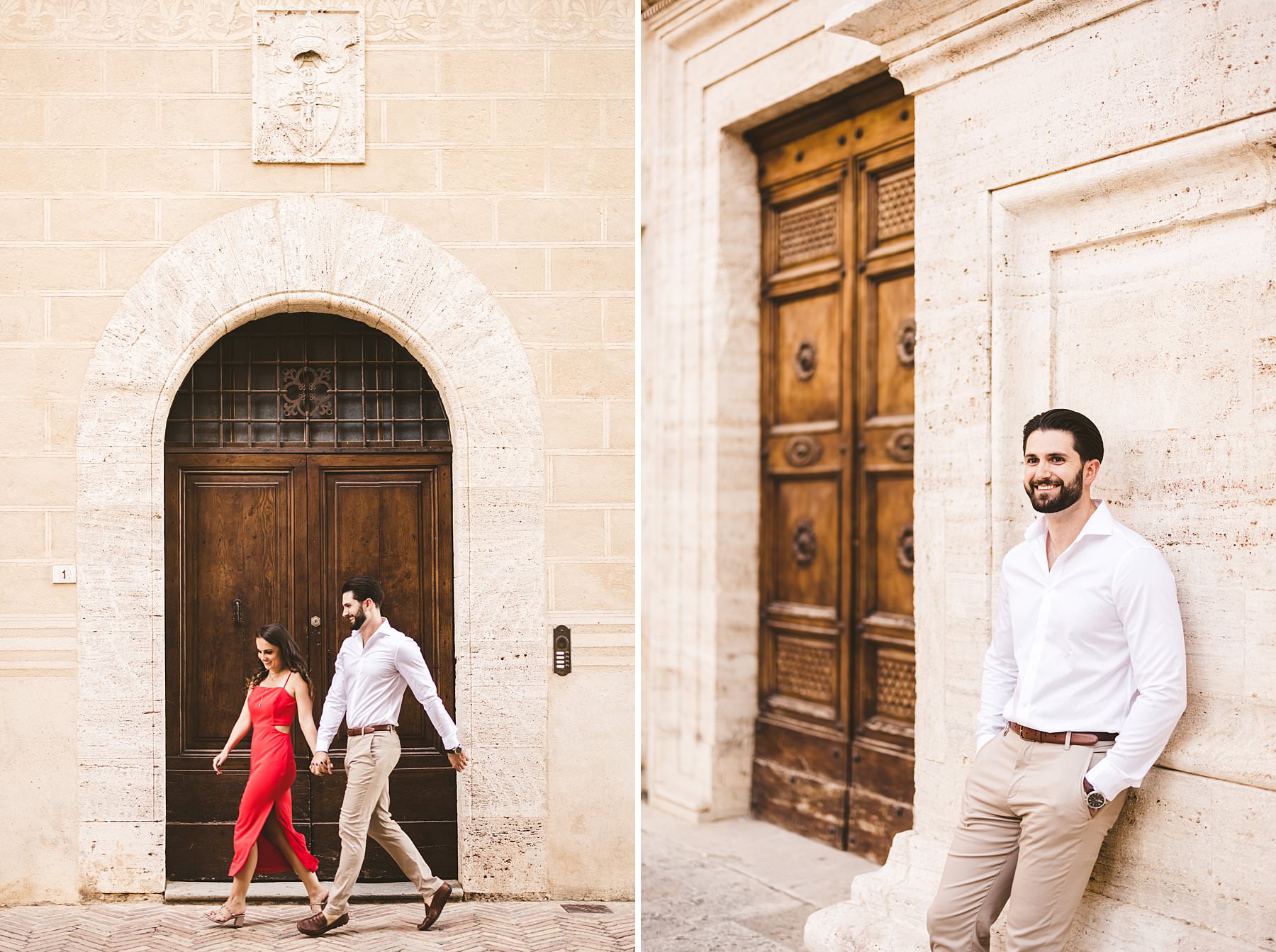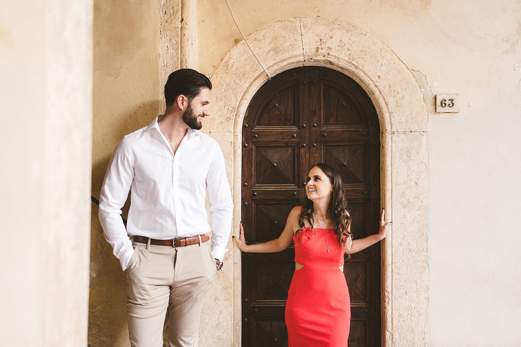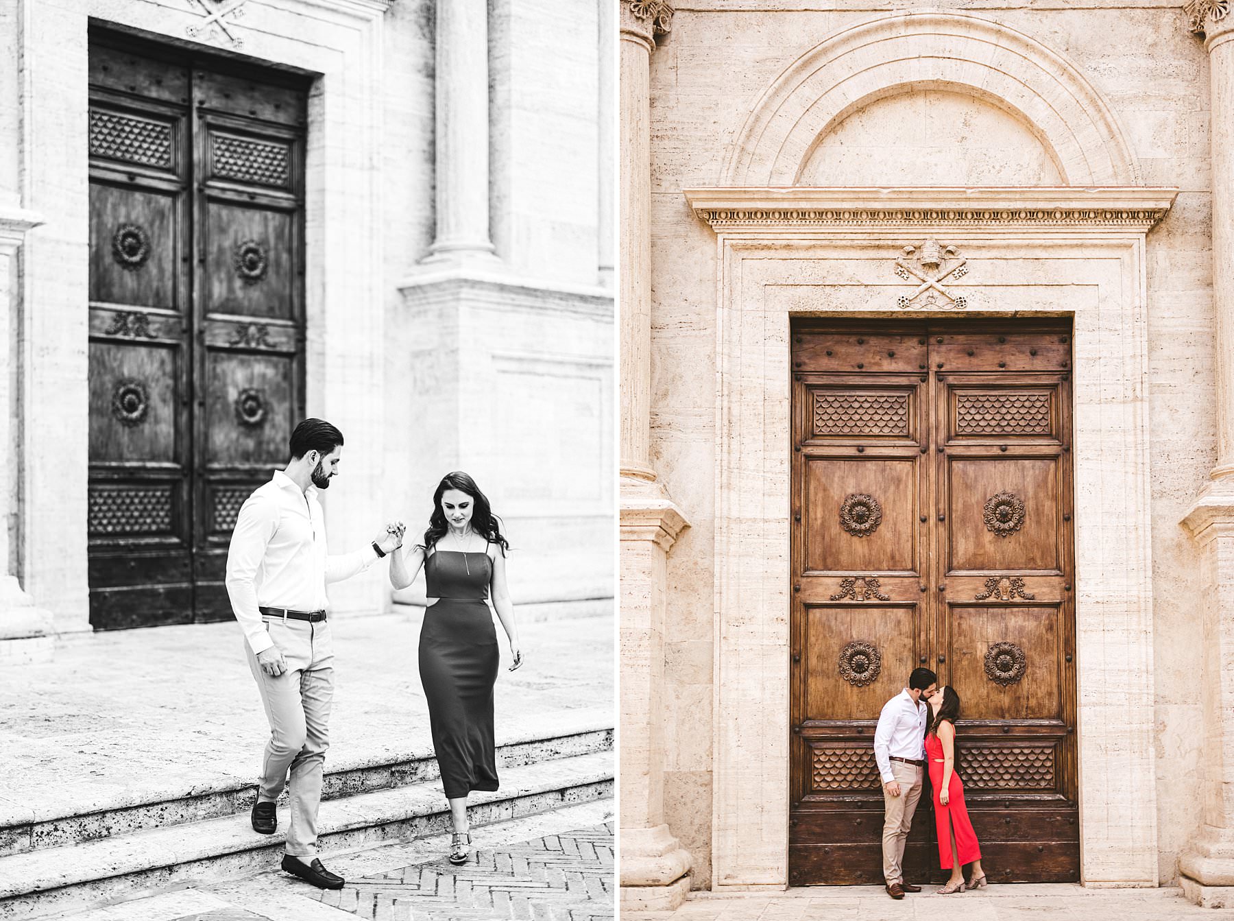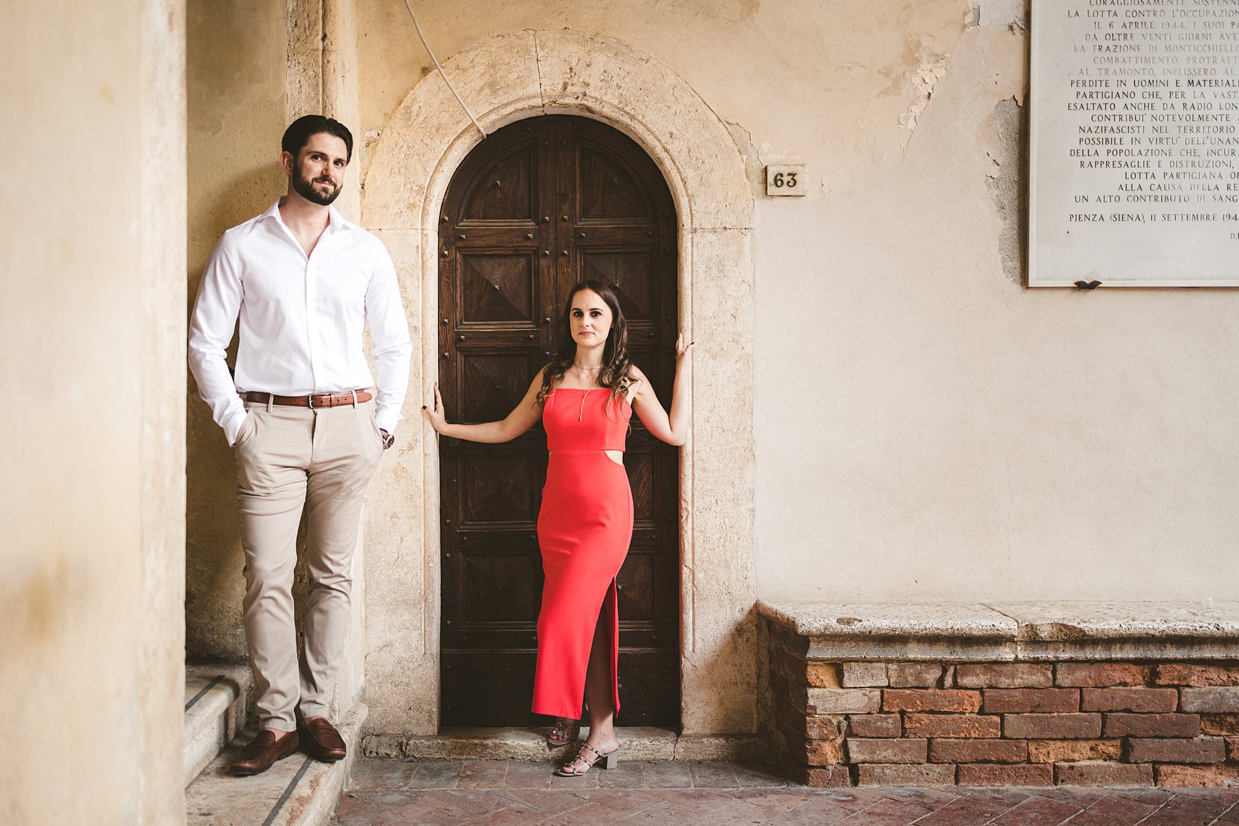 I took their natural couple photos all around Val d’Orcia, one of the most picturesque areas of the region, starting from the hamlet of Pienza. We walked around the alleys of this ancient, little town and we stopped at the most evocative spots. Cheyenne’s red dress created a wonderful contrast with the stone walls and wooden doors!