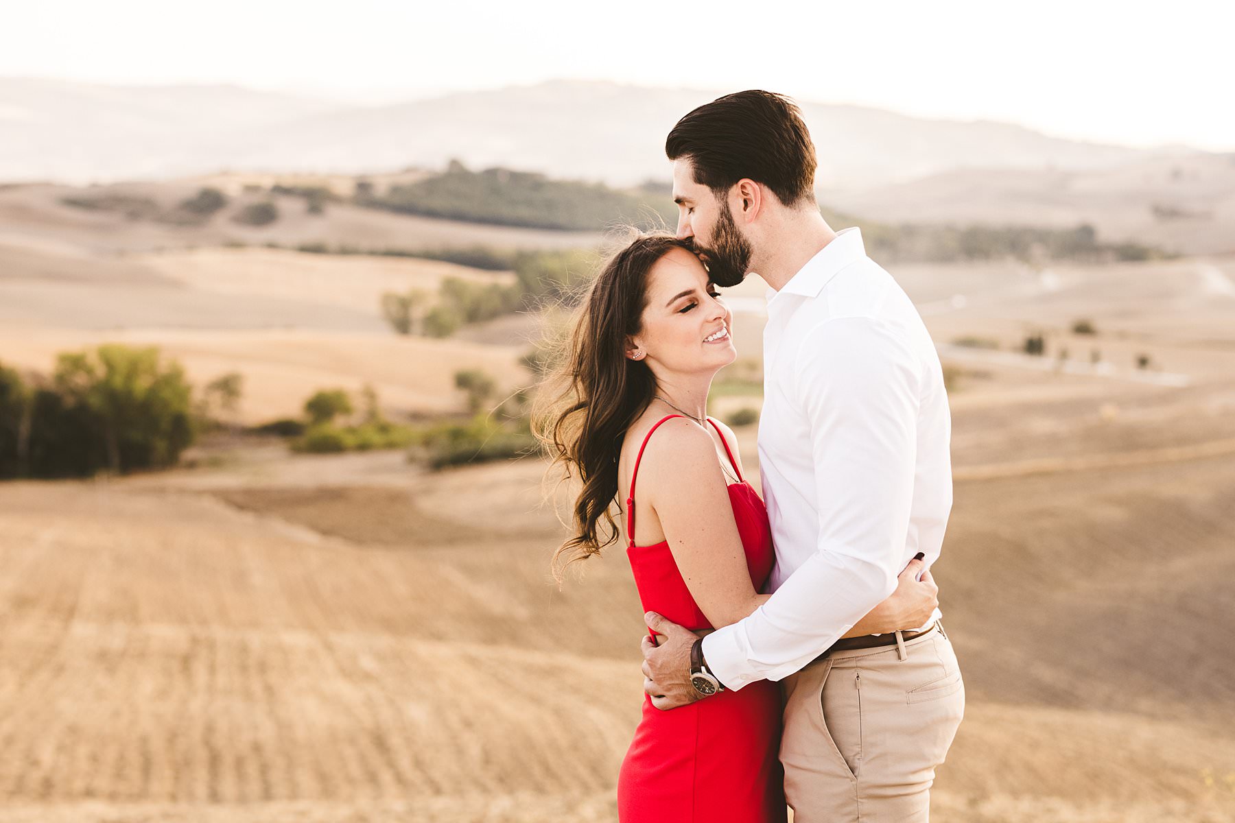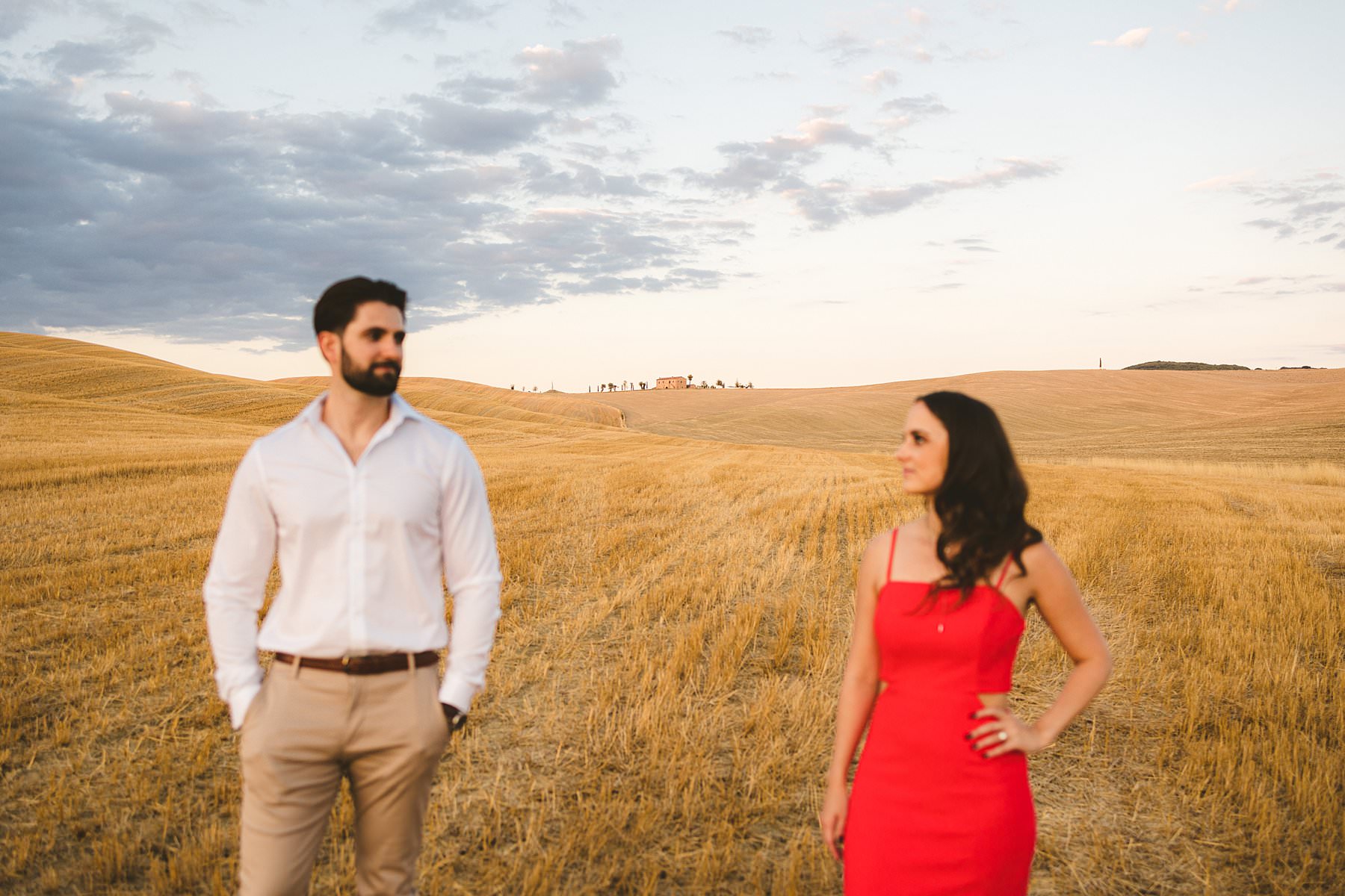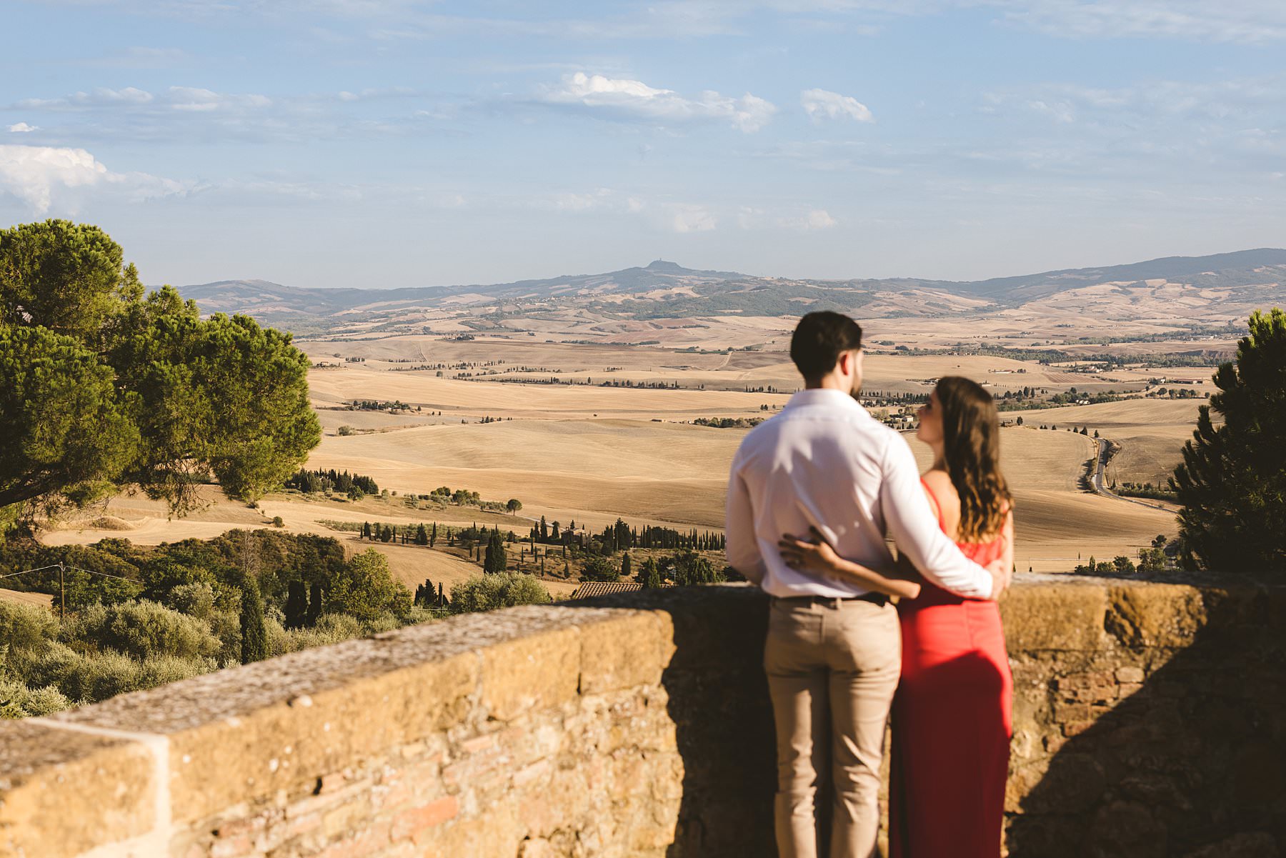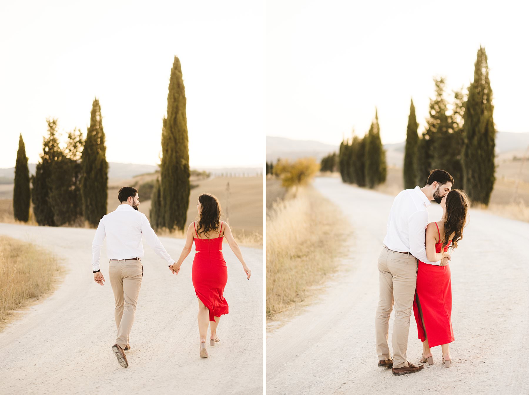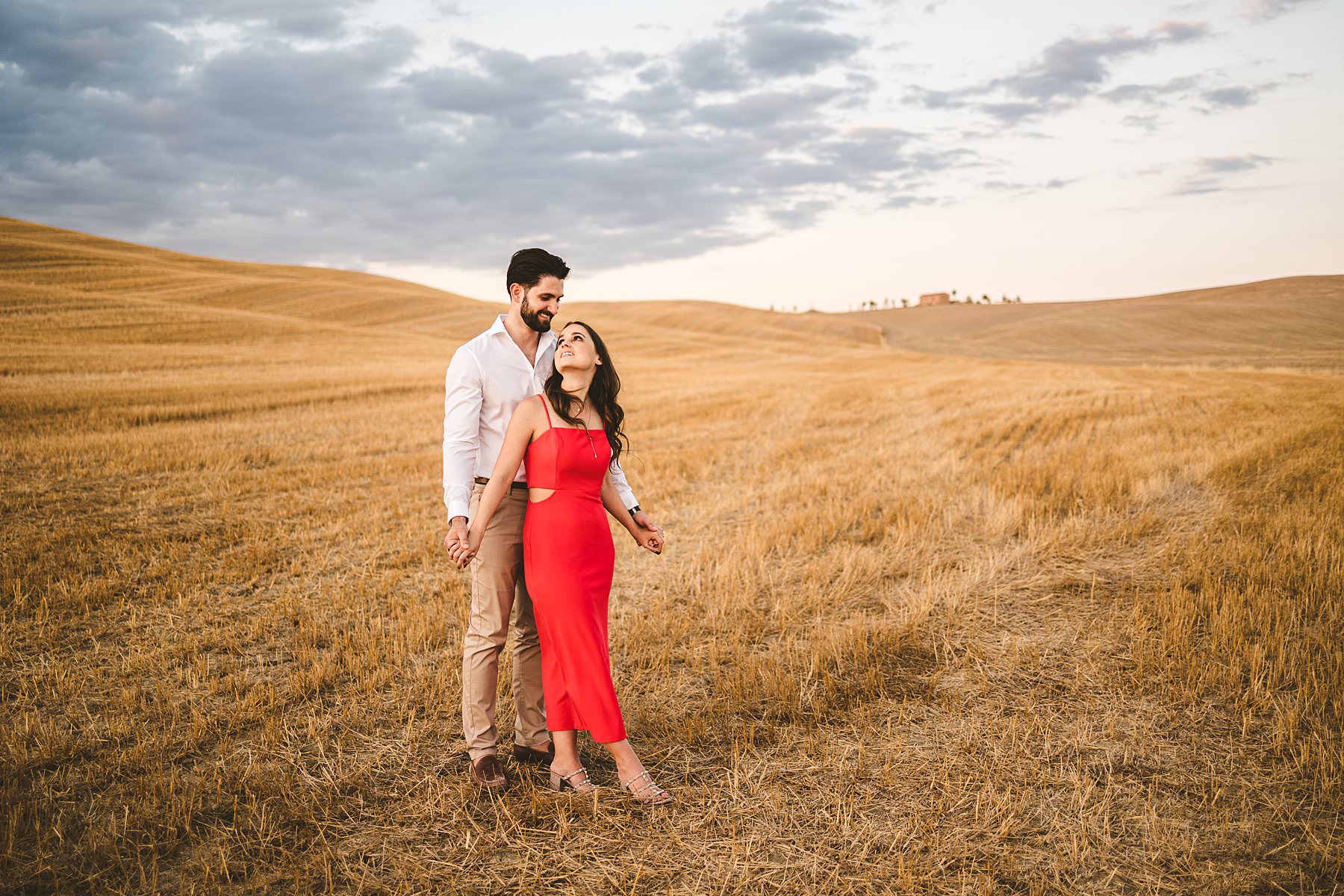 I took their natural couple photos all around Val d’Orcia, one of the most picturesque areas of the region, starting from the hamlet of Pienza. We walked around the alleys of this ancient, little town and we stopped at the most evocative spots. Cheyenne’s red dress created a wonderful contrast with the stone walls and wooden doors!