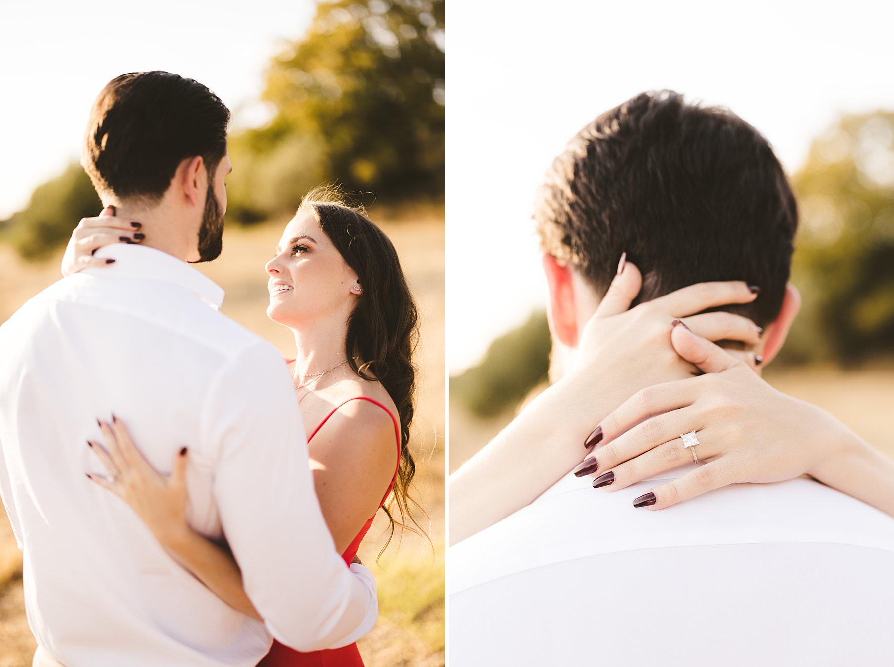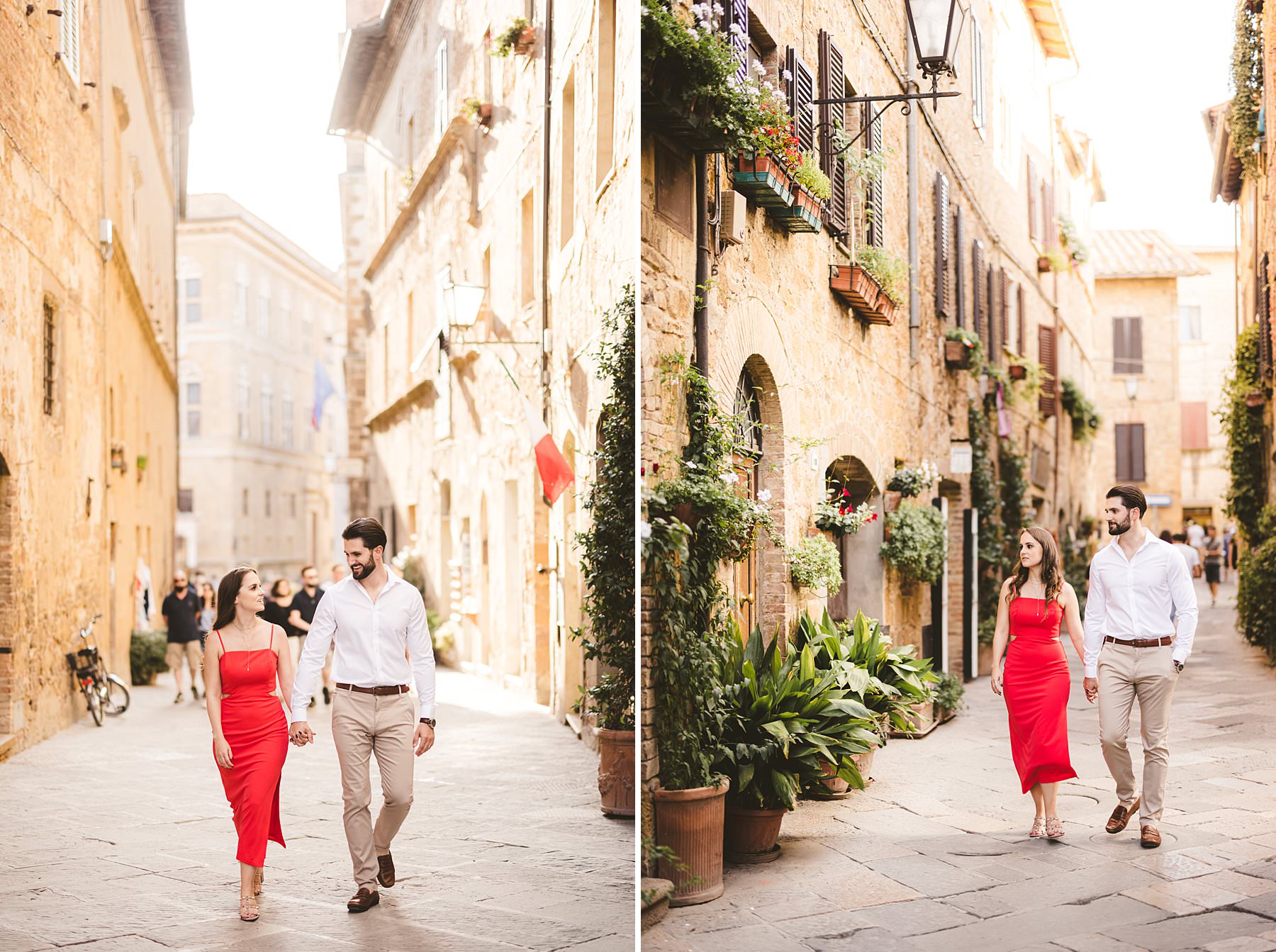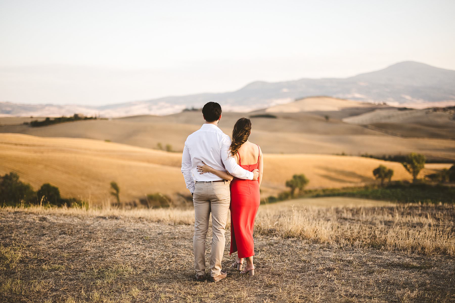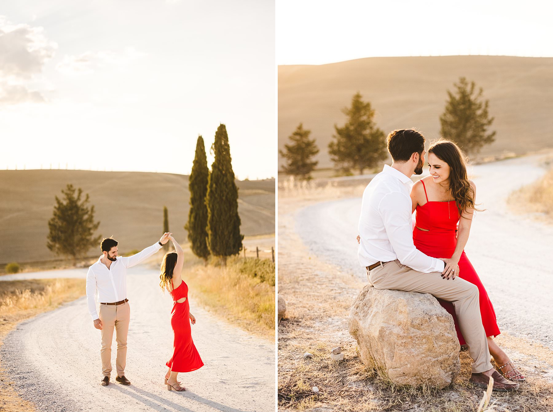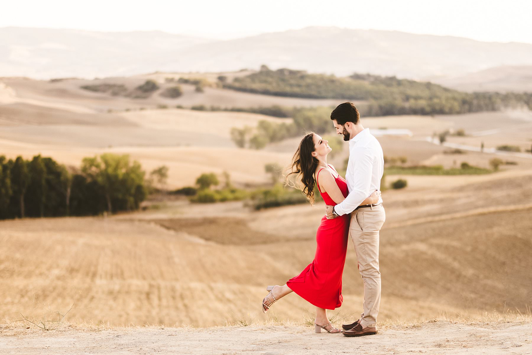 I took their natural couple photos all around Val d’Orcia, one of the most picturesque areas of the region, starting from the hamlet of Pienza. We walked around the alleys of this ancient, little town and we stopped at the most evocative spots. Cheyenne’s red dress created a wonderful contrast with the stone walls and wooden doors!