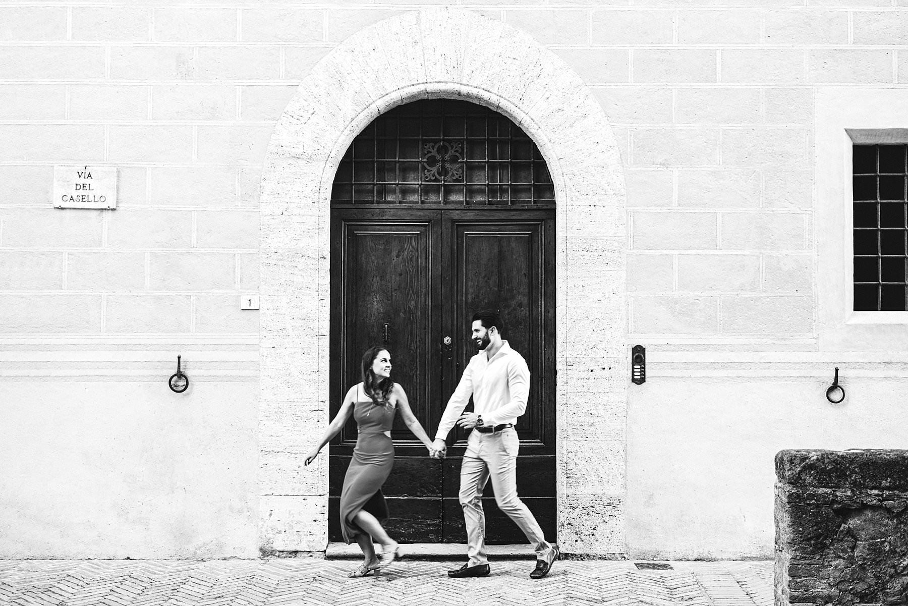 Exciting and authentic moment captured during a couple photo session with American people during their vacation in Pienza, Tuscany. Photo by the Italian creative elegant and modern engagement photographer in Tuscany Gabriele Fani.