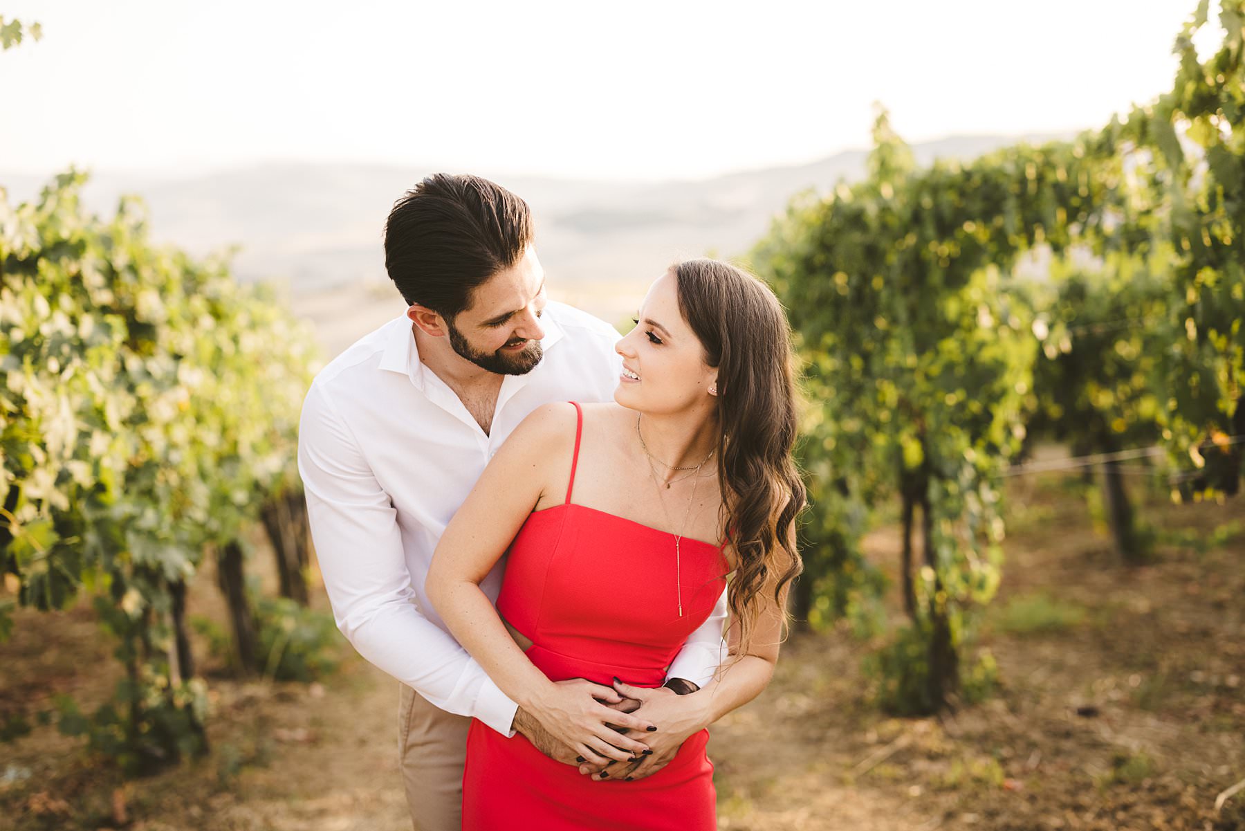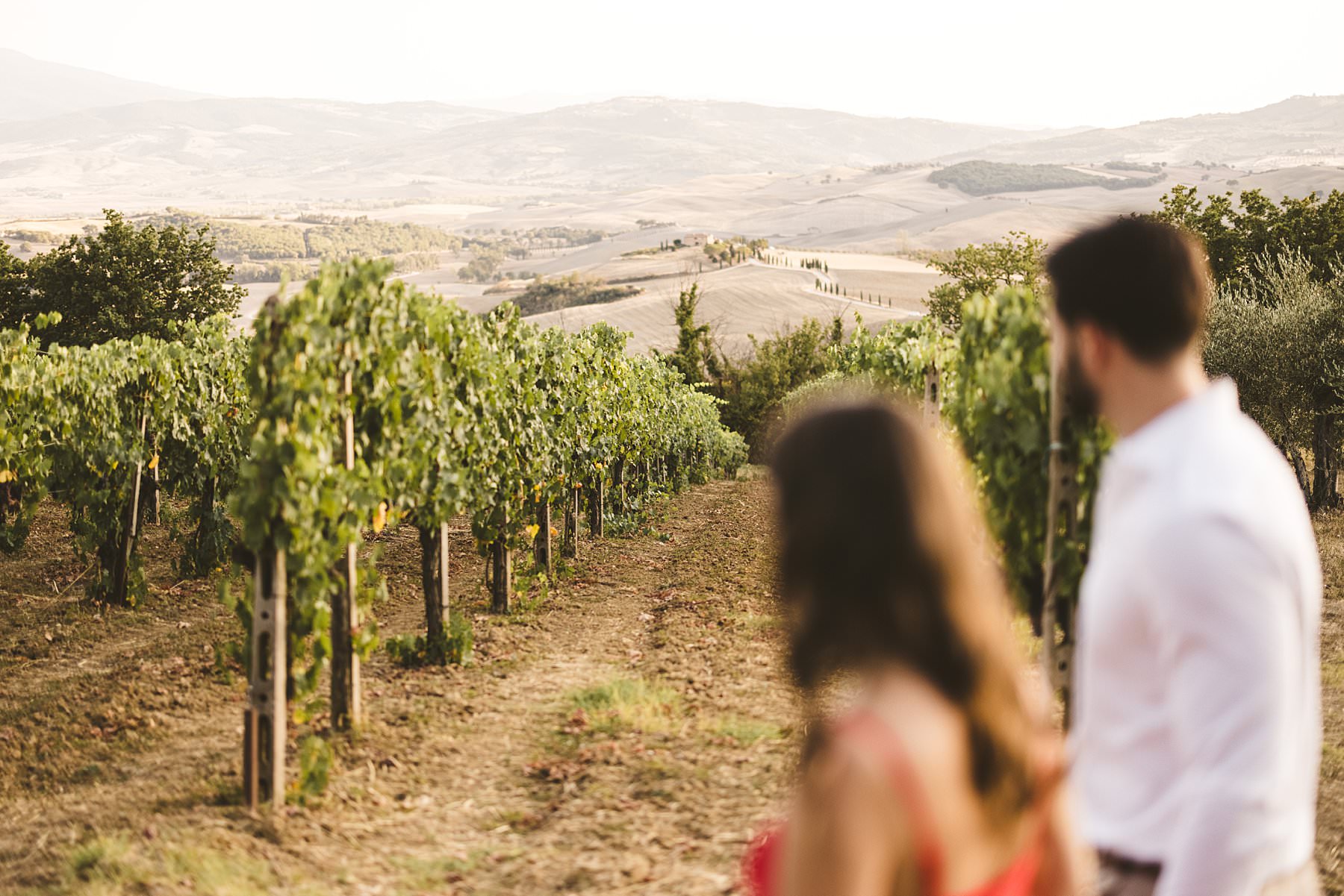 Lovely American couple photo session in the typical Tuscan countryside vineyard near Pienza in the region of the Val D’Orcia. Photo by the Italian creative elegant and modern engagement photographer in Tuscany Gabriele Fani.