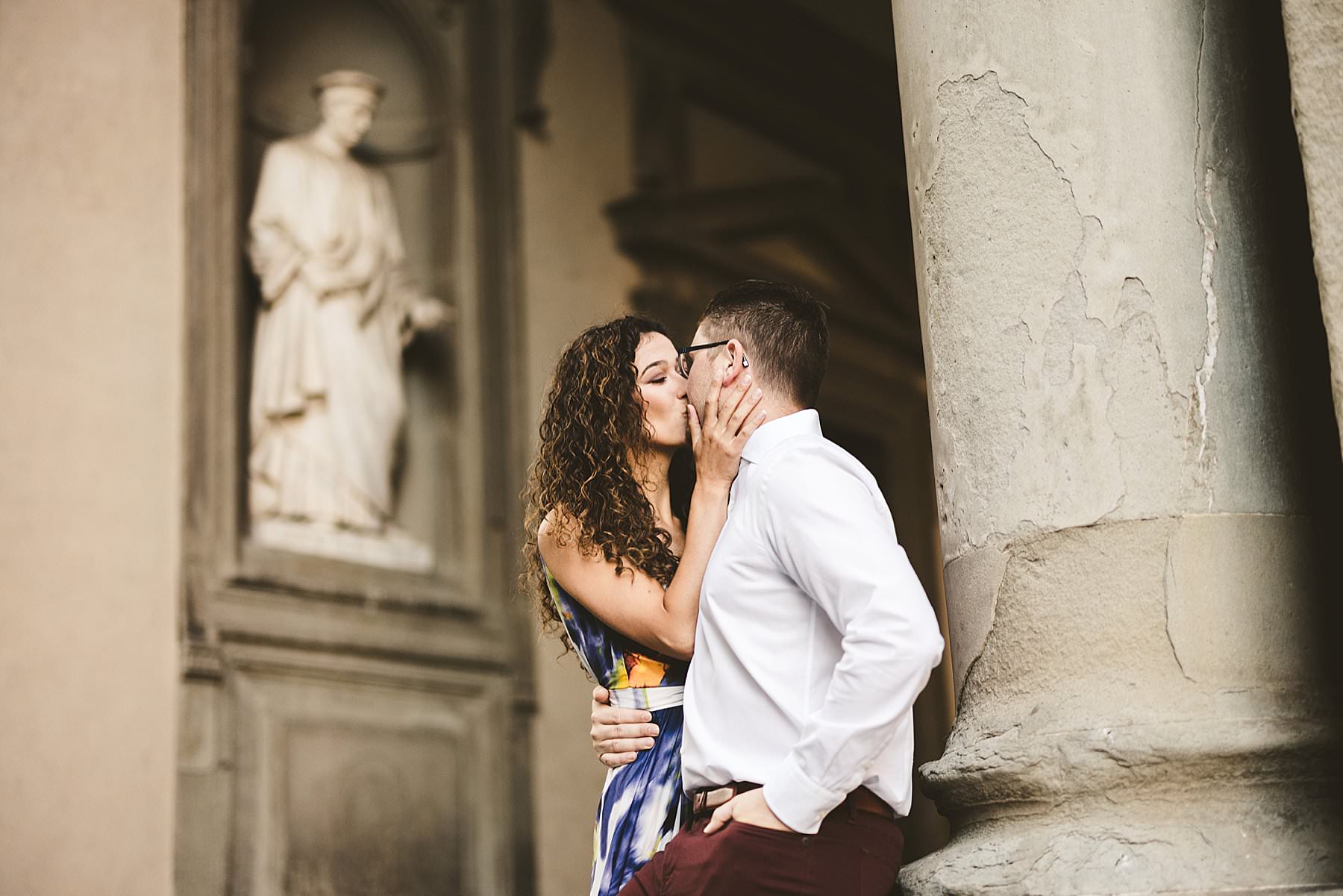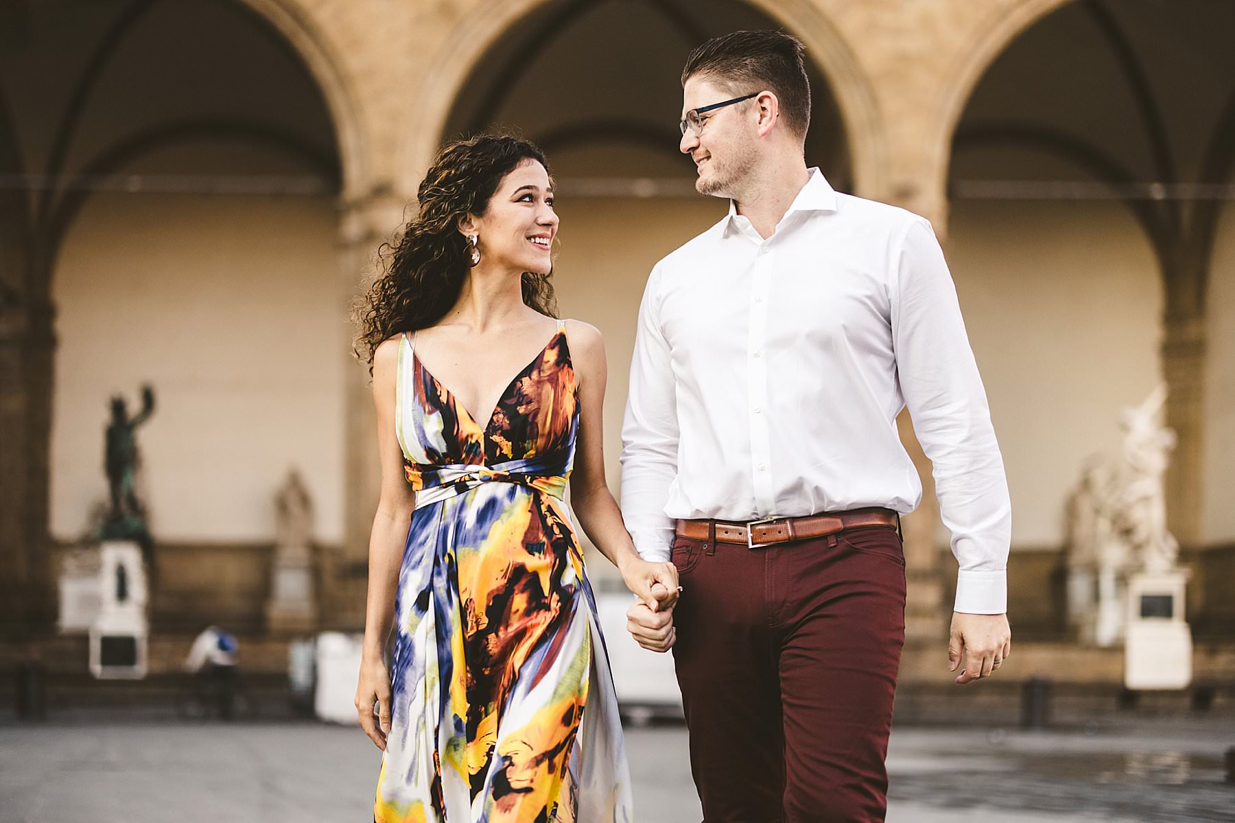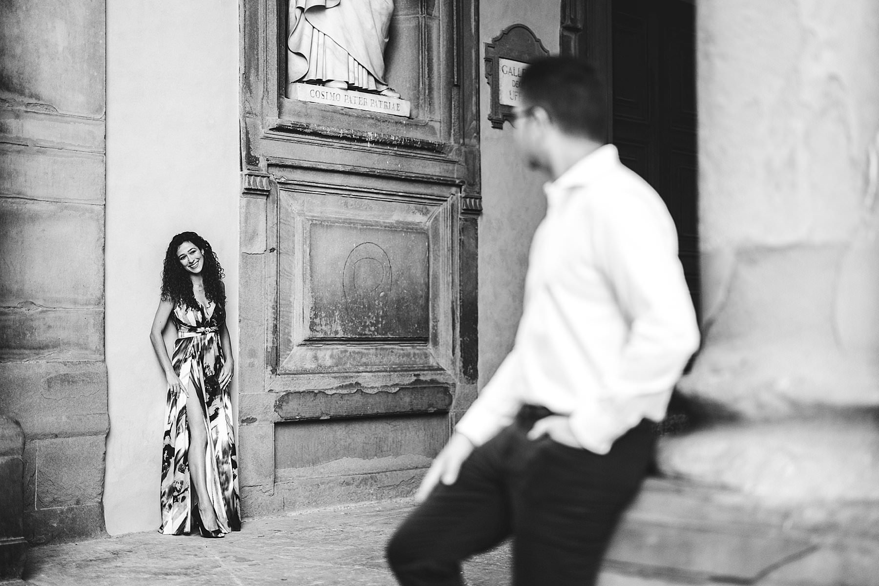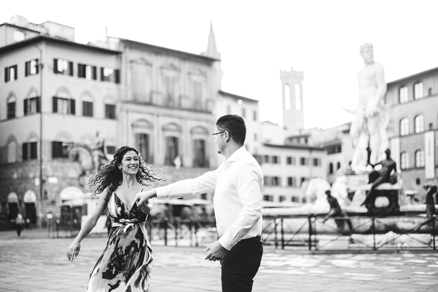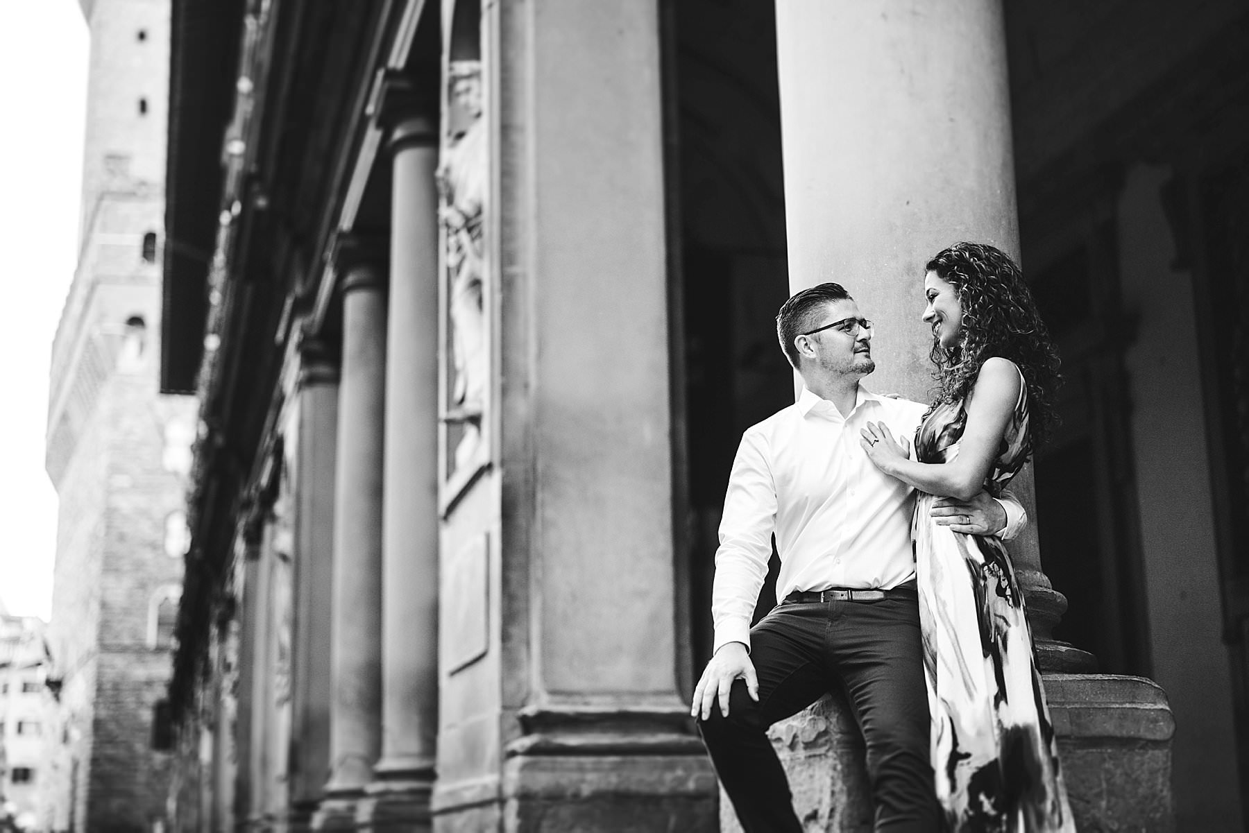 Exciting and fun honeymoon couple photo session in Florence near Uffizi Art Museum. Photo by the Italian elegant creative and modern engagement photographer in Tuscany based in Florence Gabriele Fani