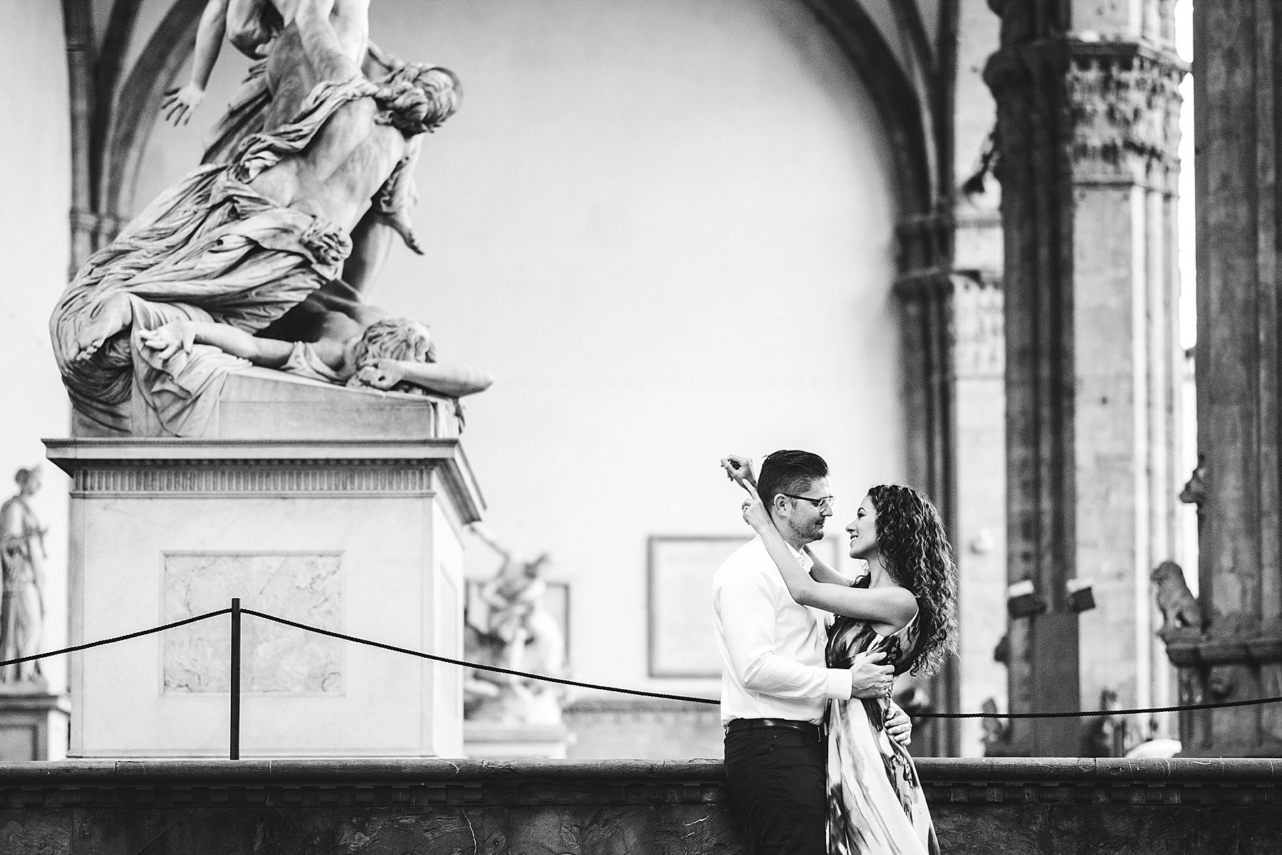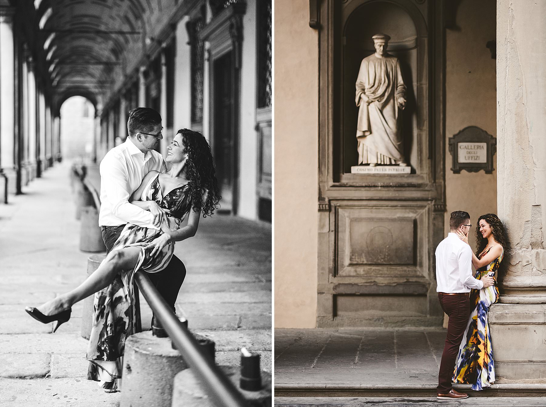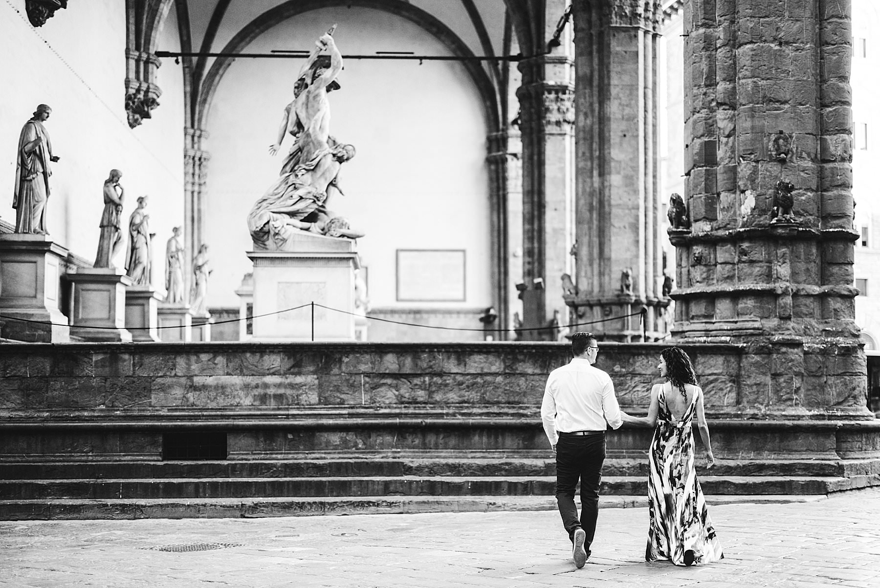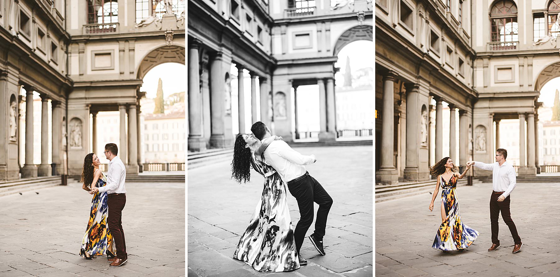 Exciting and fun honeymoon couple photo session in Florence near Uffizi Art Museum. Photo by the Italian elegant creative and modern engagement photographer in Tuscany based in Florence Gabriele Fani