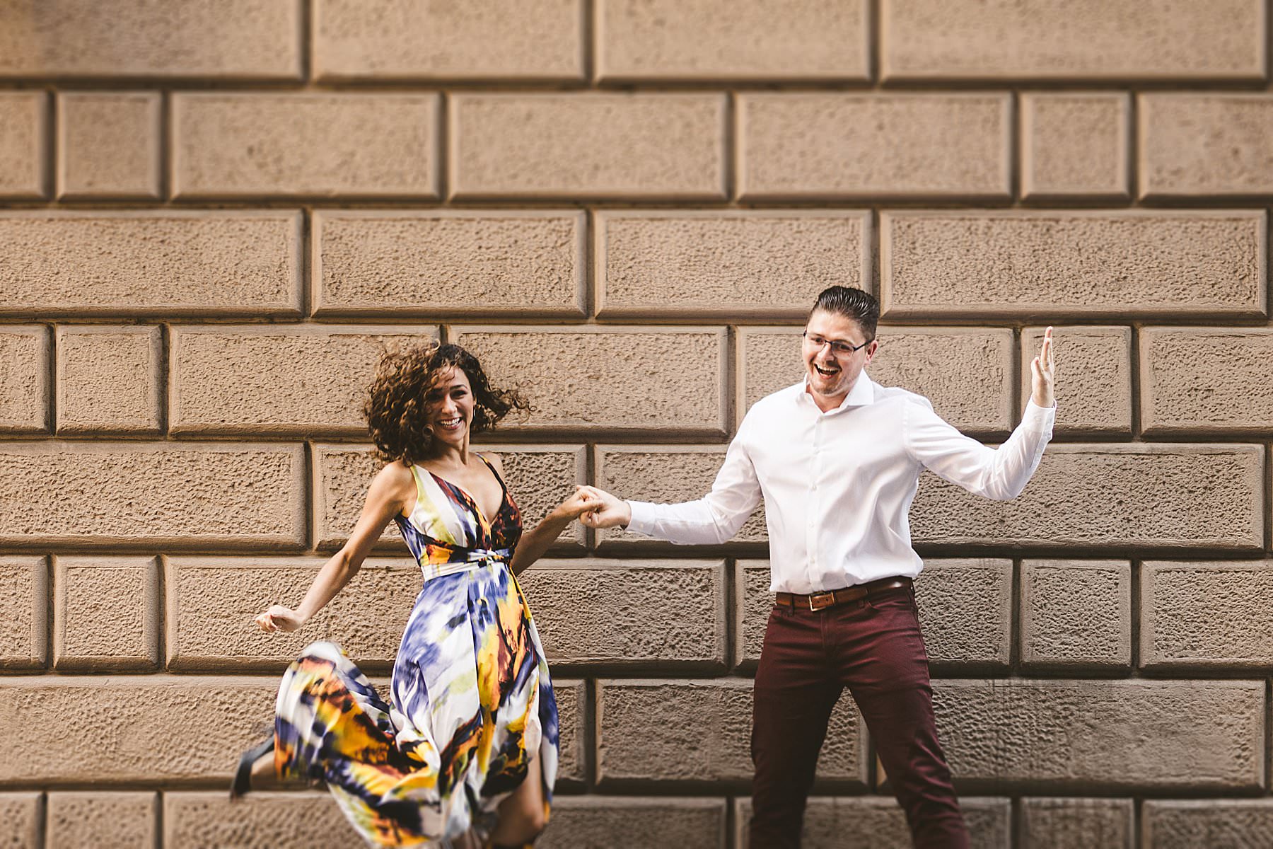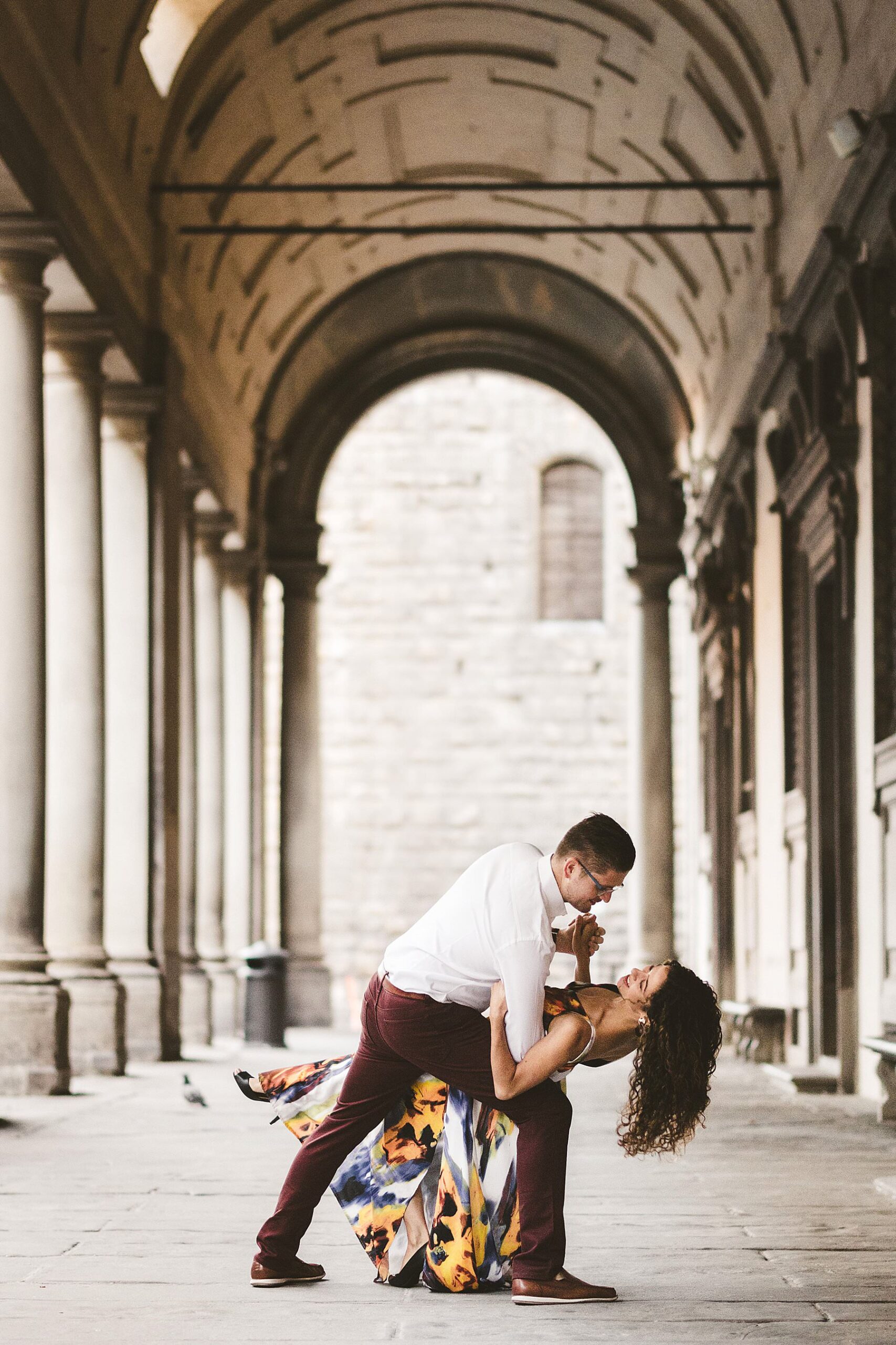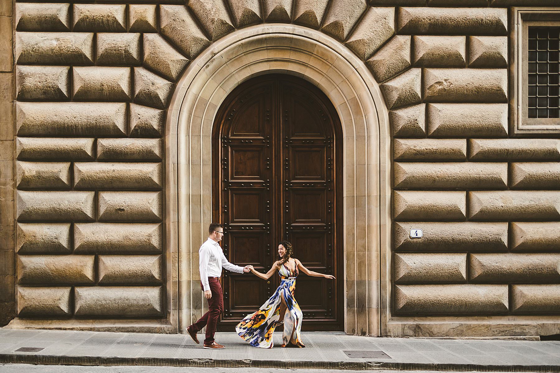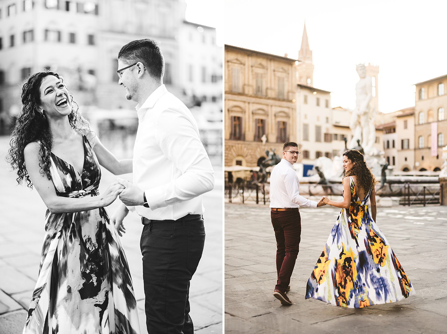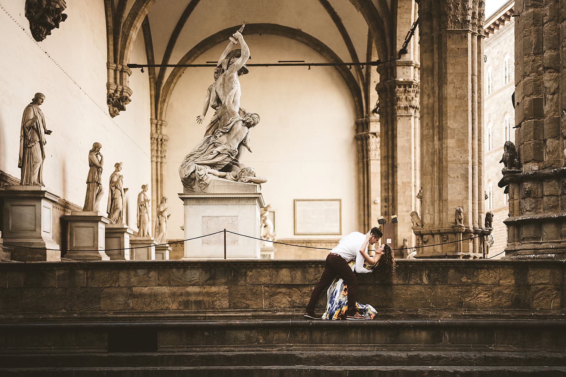 Exciting and fun honeymoon couple photo session in Florence near Uffizi Art Museum. Photo by the Italian elegant creative and modern engagement photographer in Tuscany based in Florence Gabriele Fani