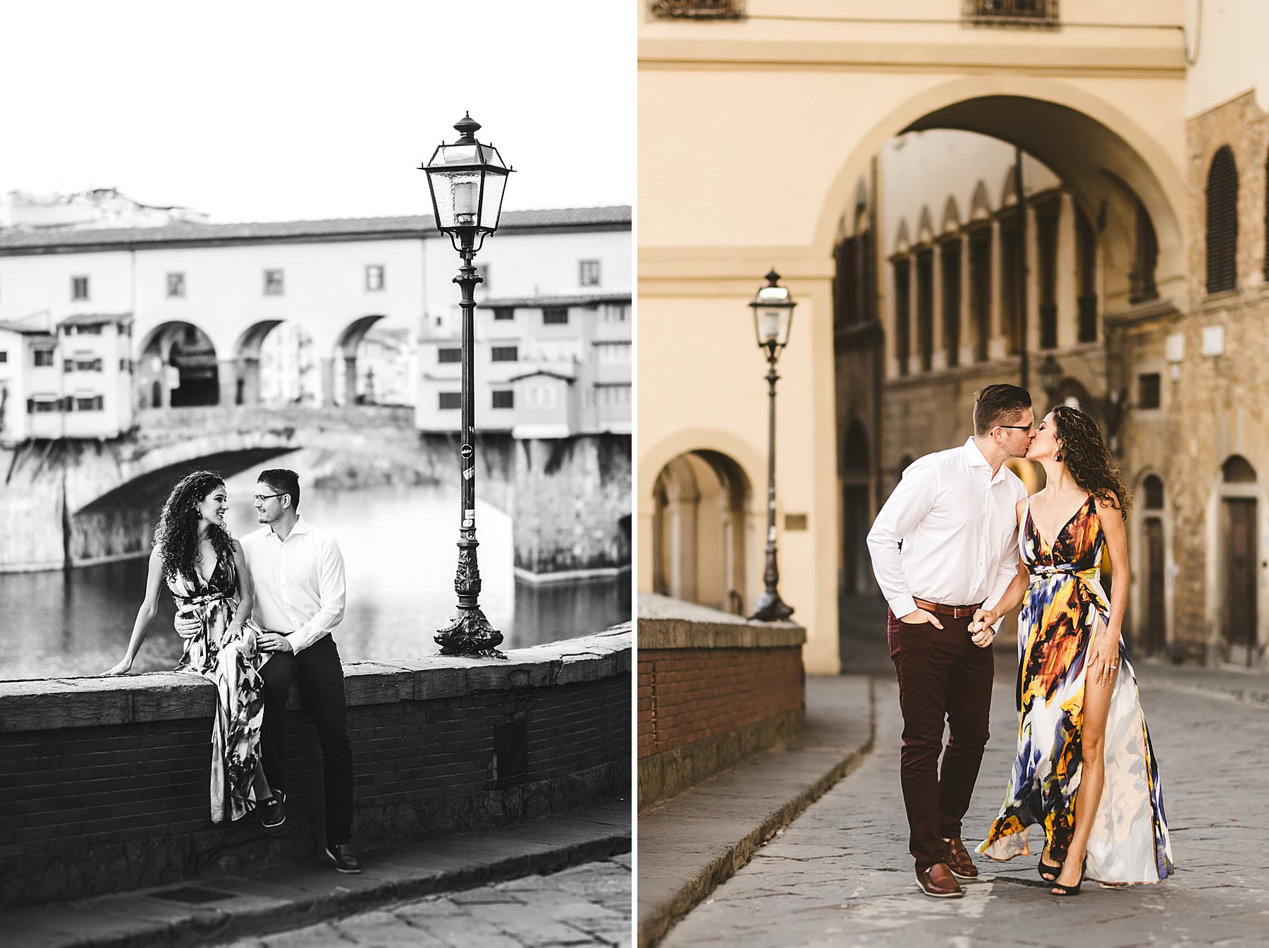 Elegant honeymoon couple portrait photo session in the heart of Florence near Ponte Vecchio at sunrise. Photo by the Italian elegant creative and modern engagement photographer in Tuscany based in Florence Gabriele Fani