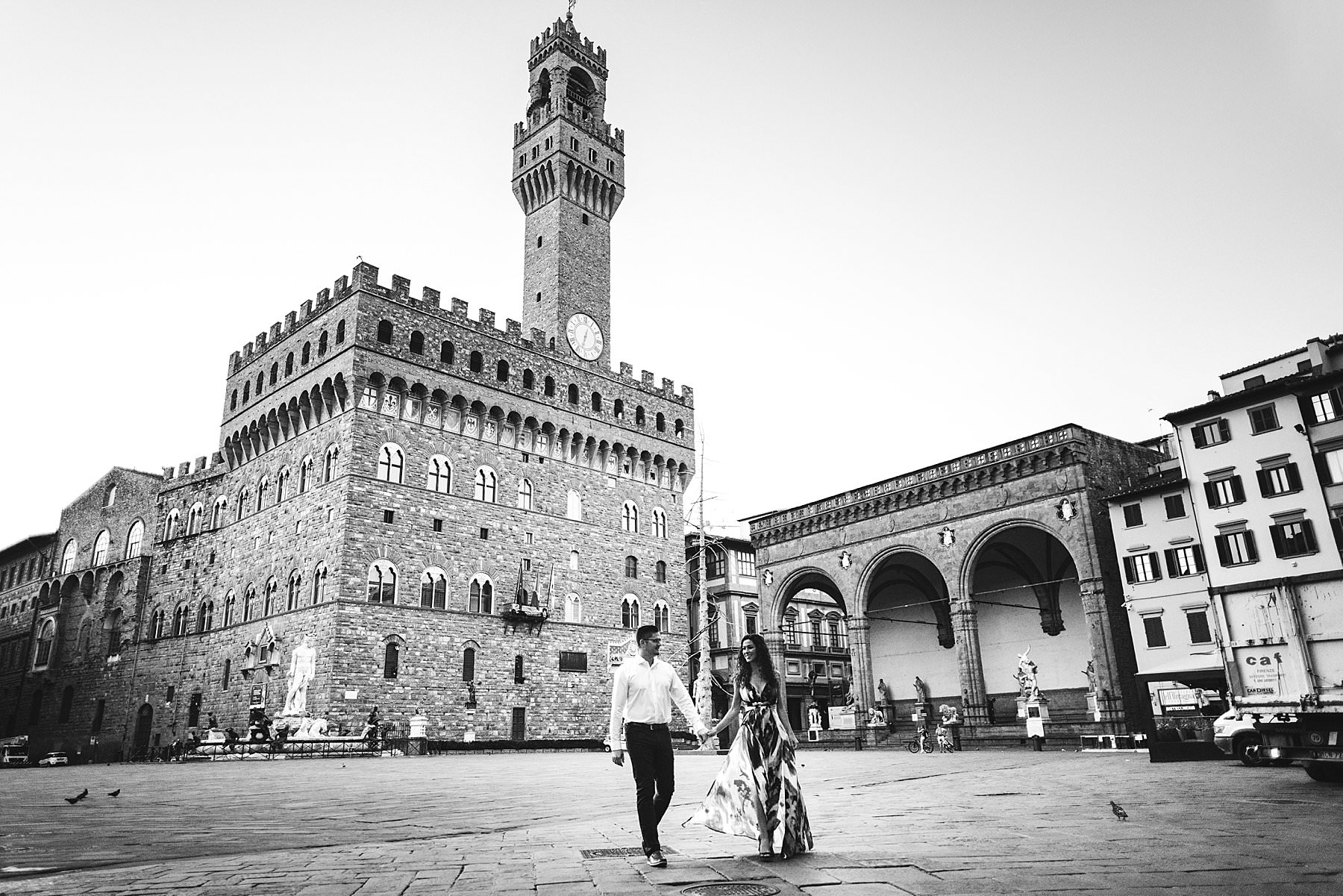 Couple portrait honeymoon photo session in the heart of Florence near Palazzo Vecchio. Photo by the Italian elegant creative and modern engagement photographer in Tuscany based in Florence Gabriele Fani