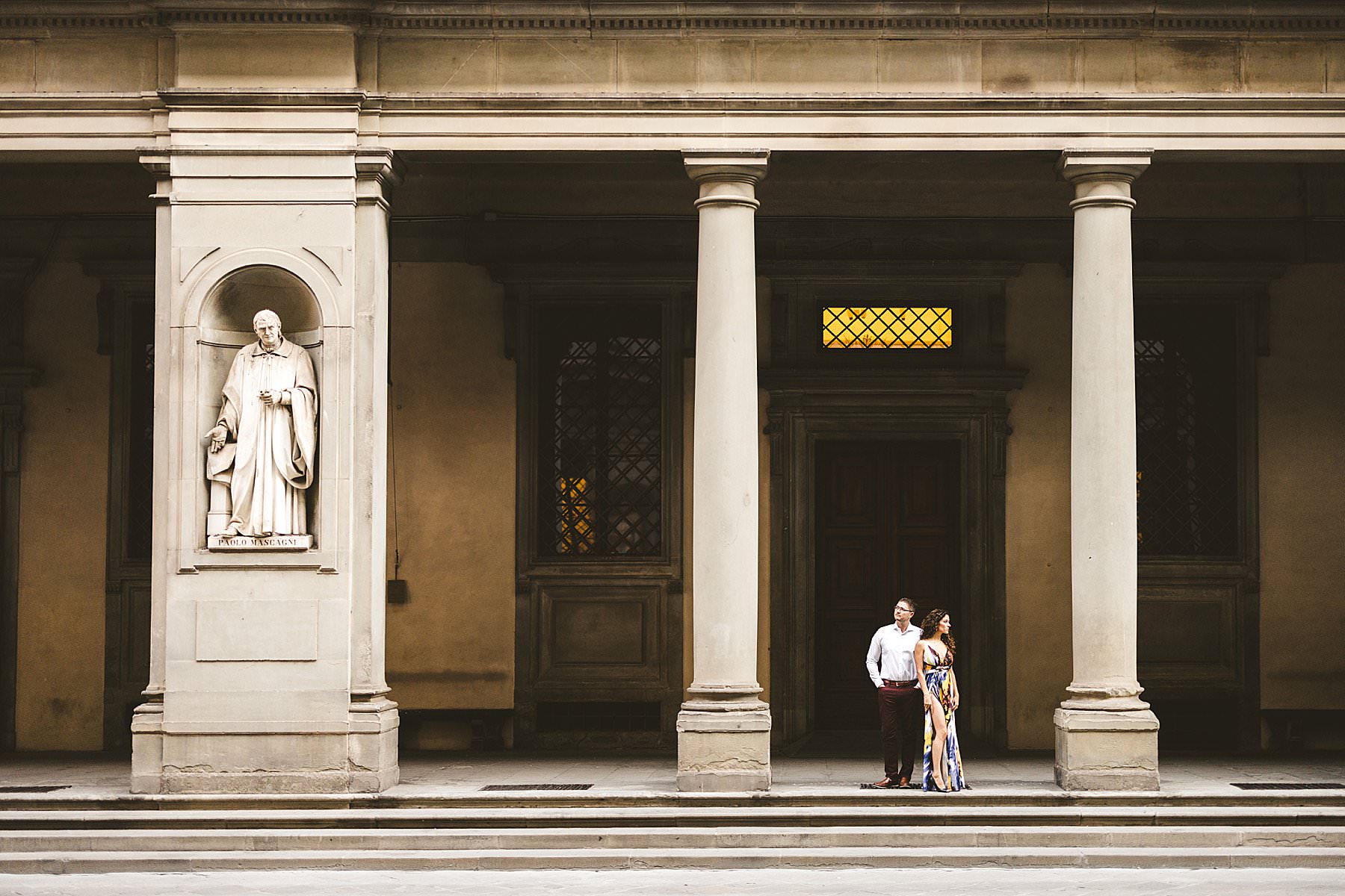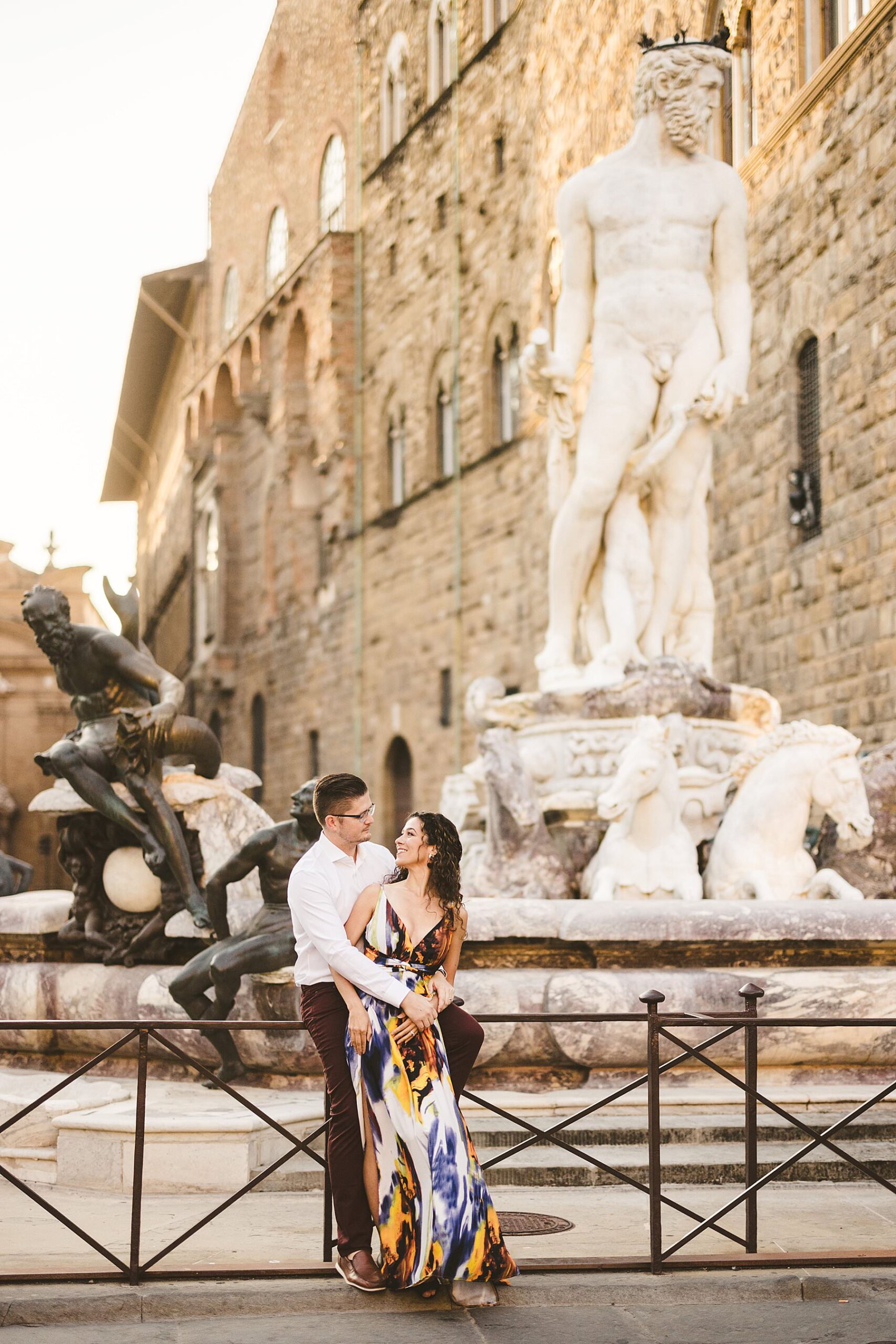 Toni and Brian’s sunrise photoshoot started in Piazza della Signoria, close to Loggia dei Lanzi and Palazzo Vecchio, then we moved to the Uffizi Gallery and the Arno river, with its picturesque Ponte Vecchio. The photos we took are elegant and delicate, with a colorful touch provided by Toni’s beautiful dress.