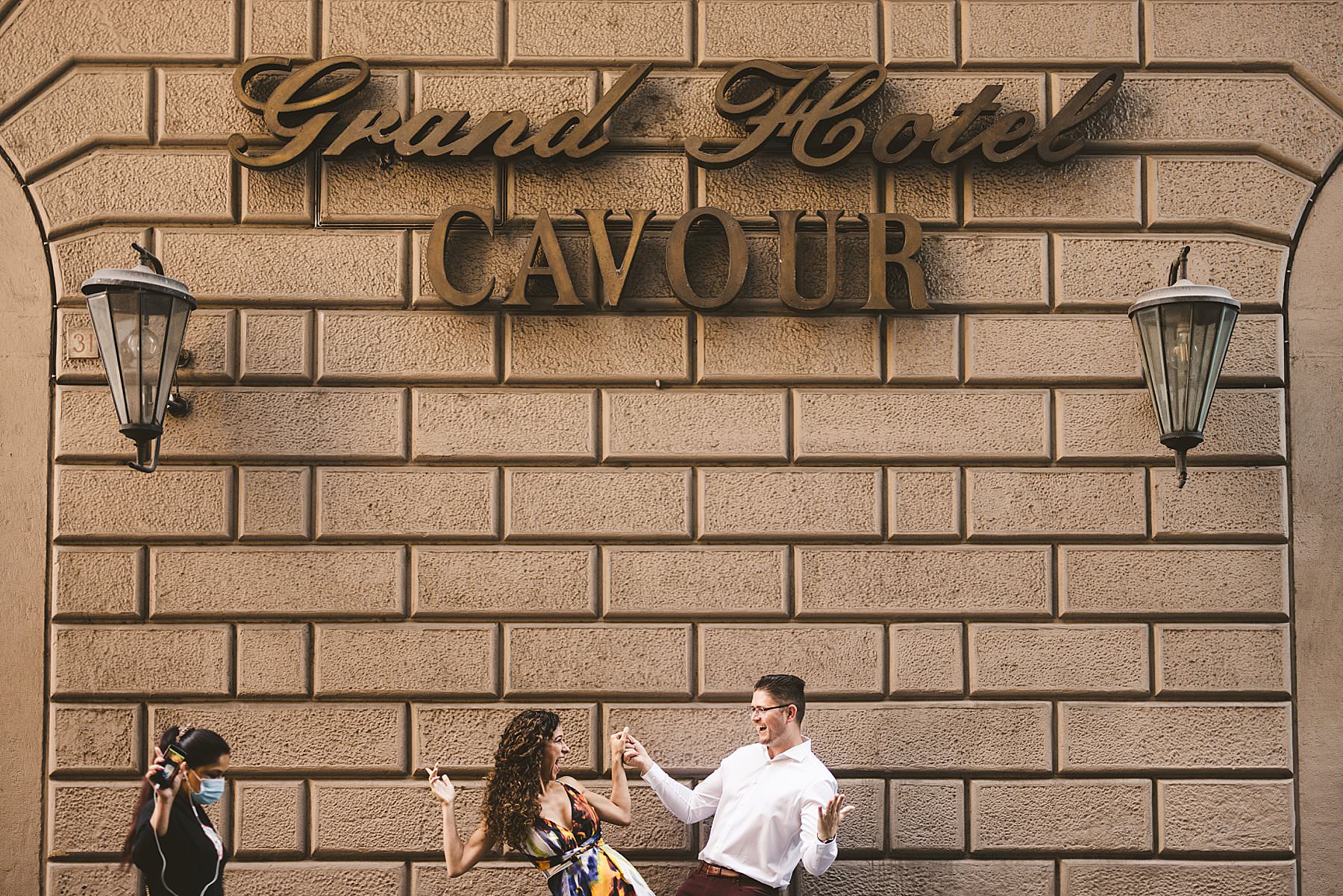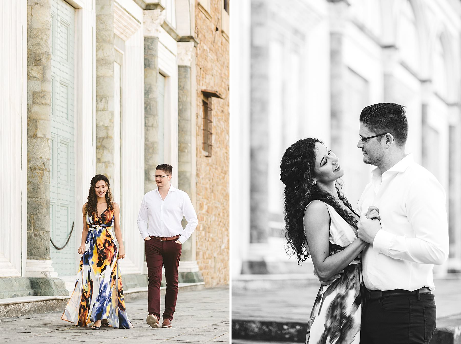 Exciting and fun couple portrait photo session in Florence near Grand Hotel Cavour. Photo by the Italian elegant creative and modern engagement photographer in Tuscany based in Florence Gabriele Fani