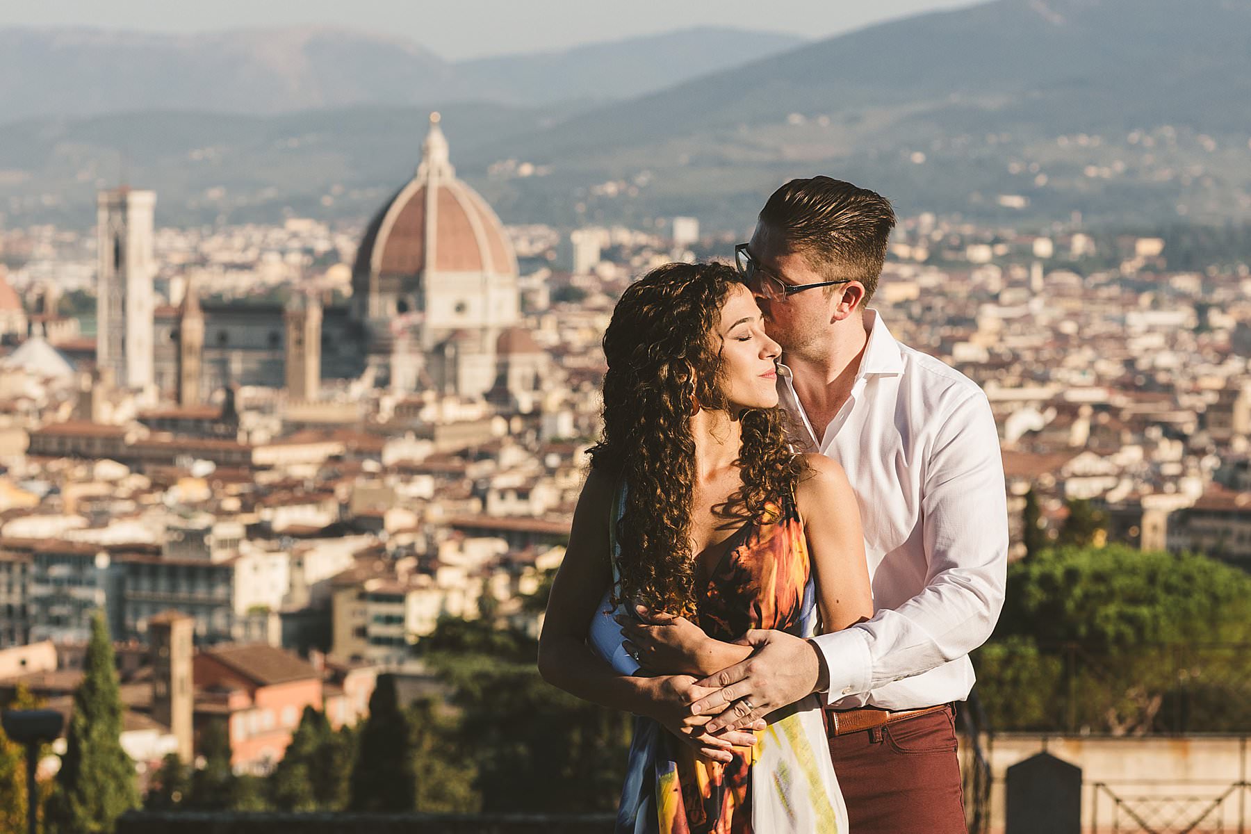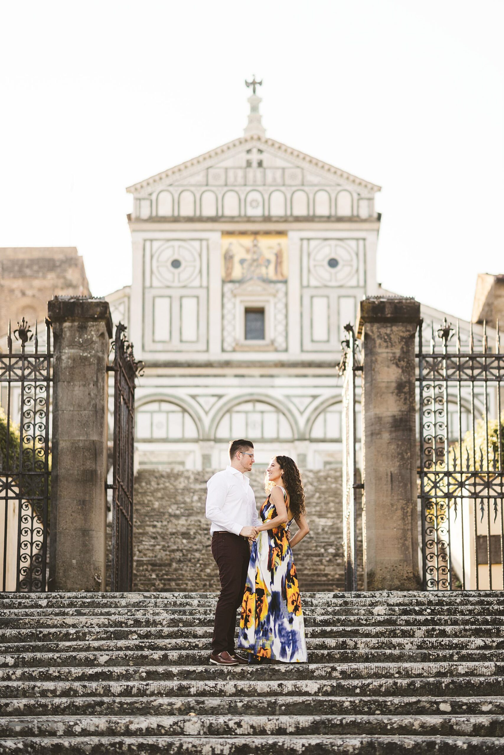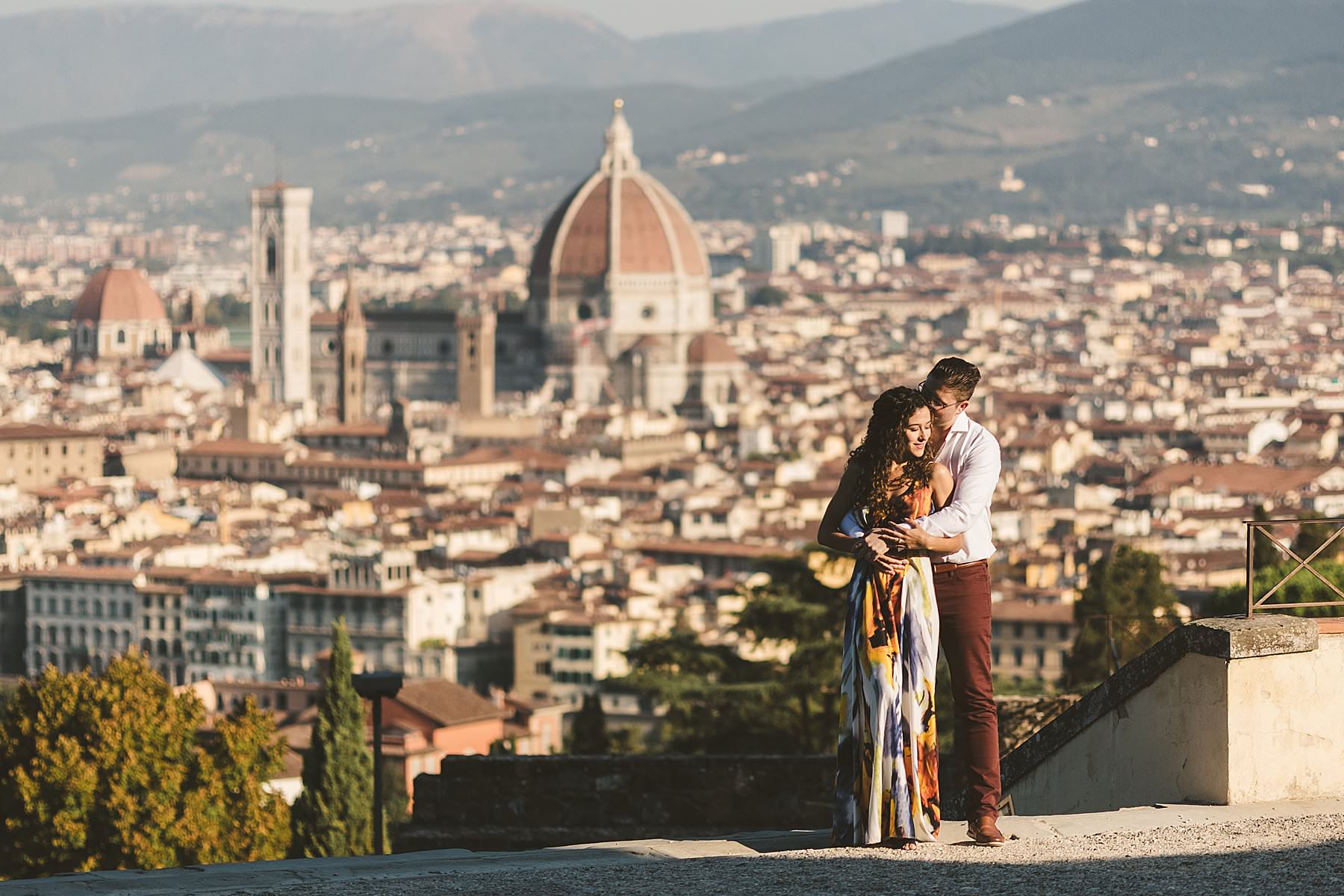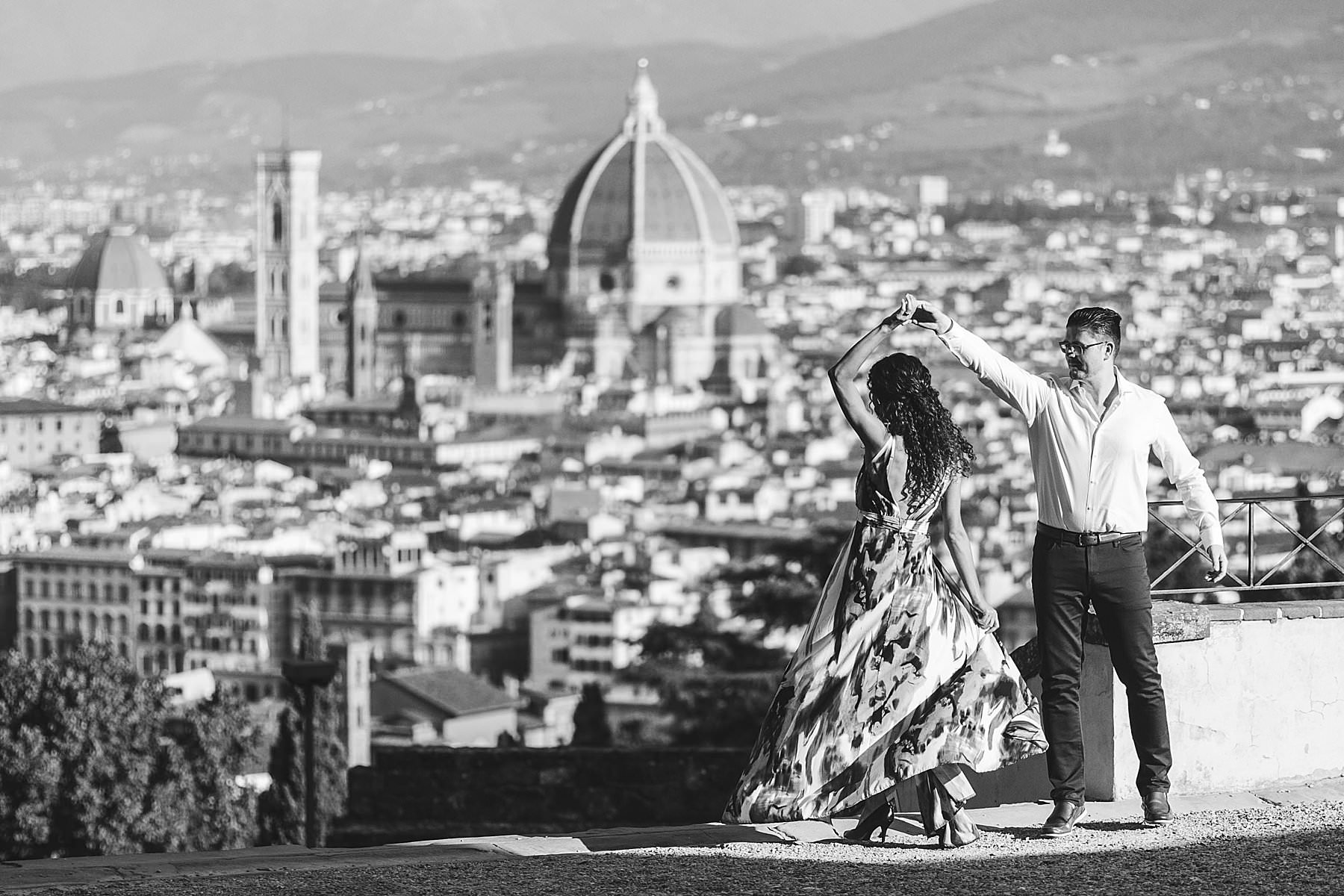 Exciting and fun honeymoon photo shoot in the most iconic panoramic spot of Florence near San Miniato al Monte and Piazzale Michelangelo at sunrise. Photo by the Italian elegant creative and modern engagement photographer in Tuscany based in Florence Gabriele Fani