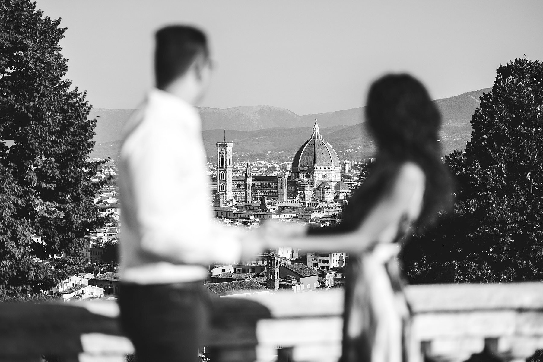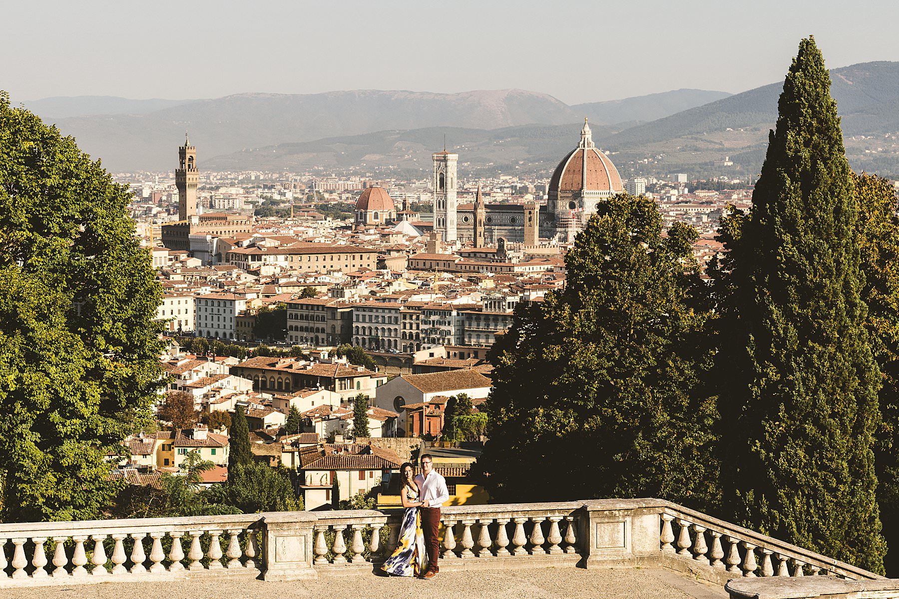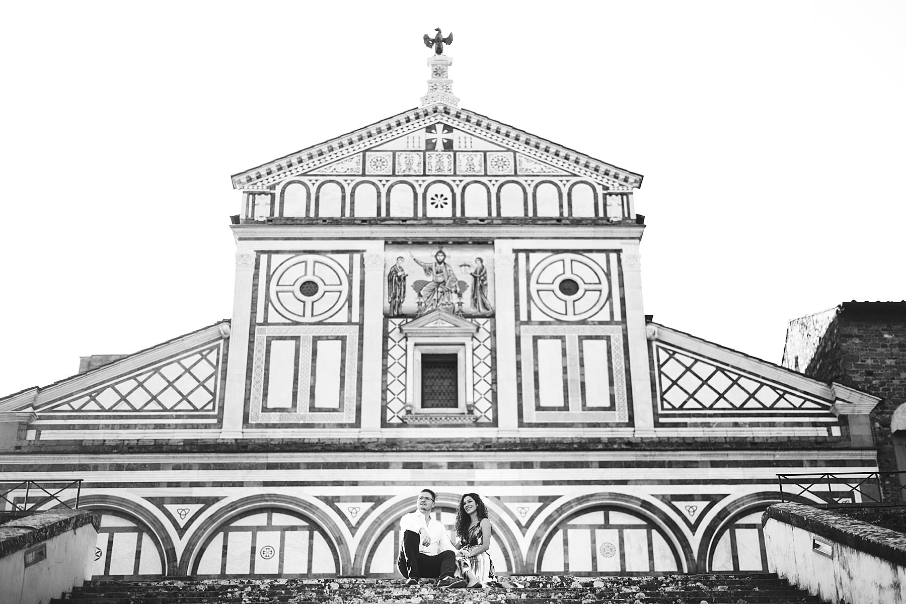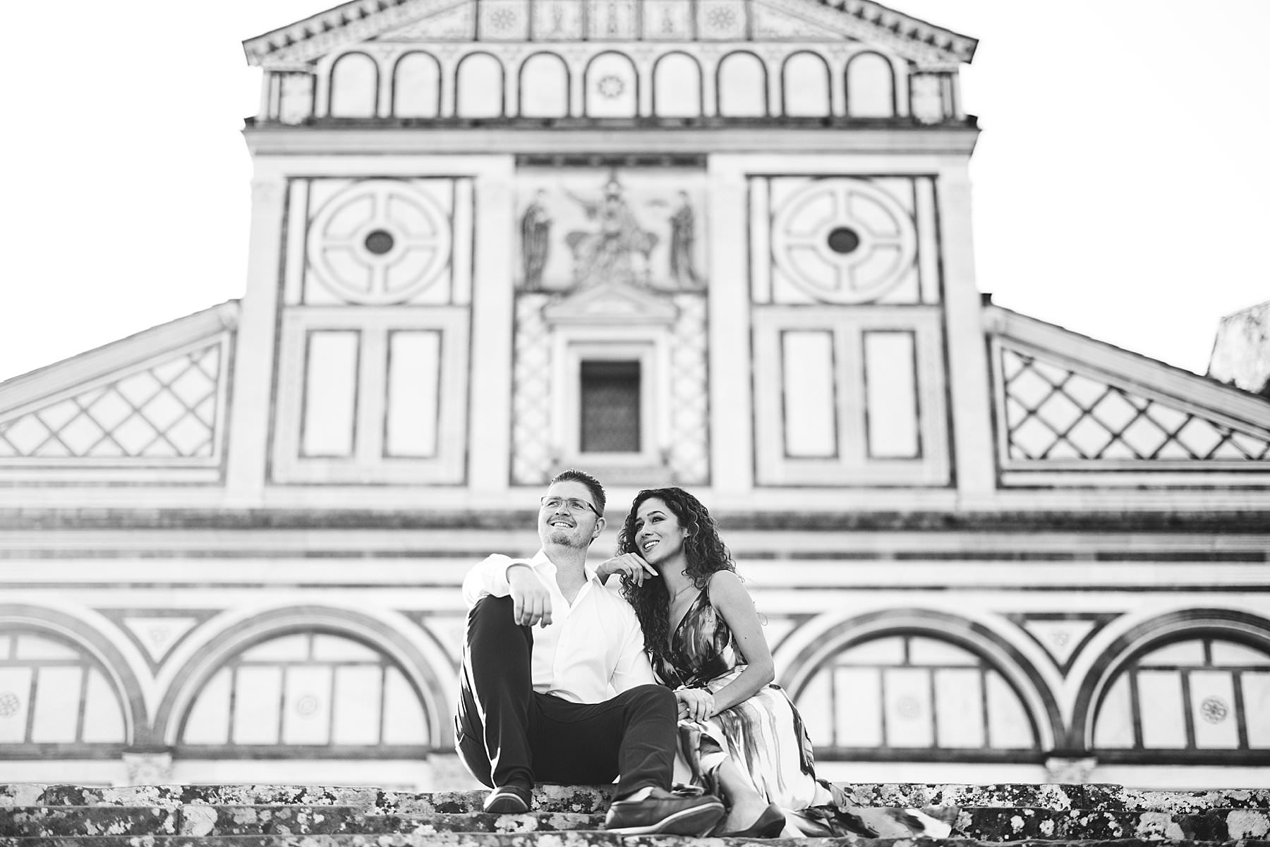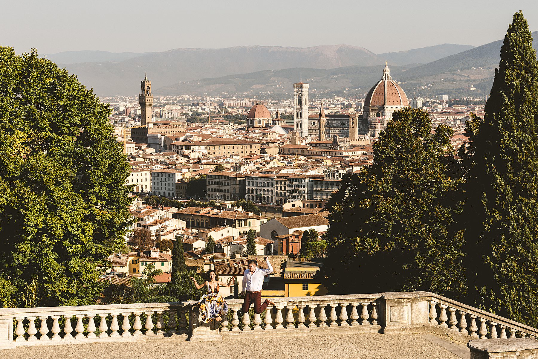Exciting and fun honeymoon photo shoot in the most iconic panoramic spot of Florence near San Miniato al Monte and Piazzale Michelangelo at sunrise. Photo by the Italian elegant creative and modern engagement photographer in Tuscany based in Florence Gabriele Fani