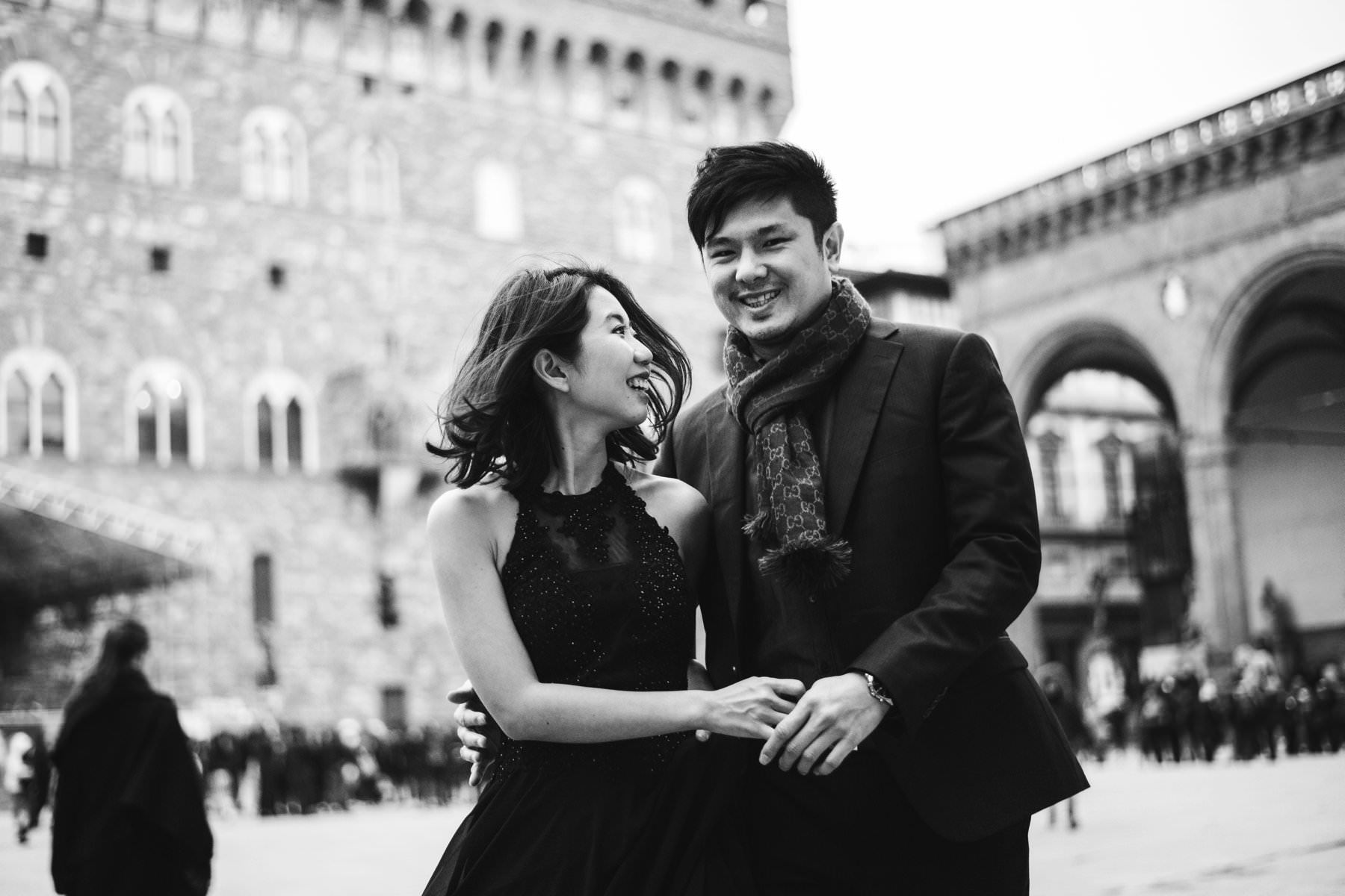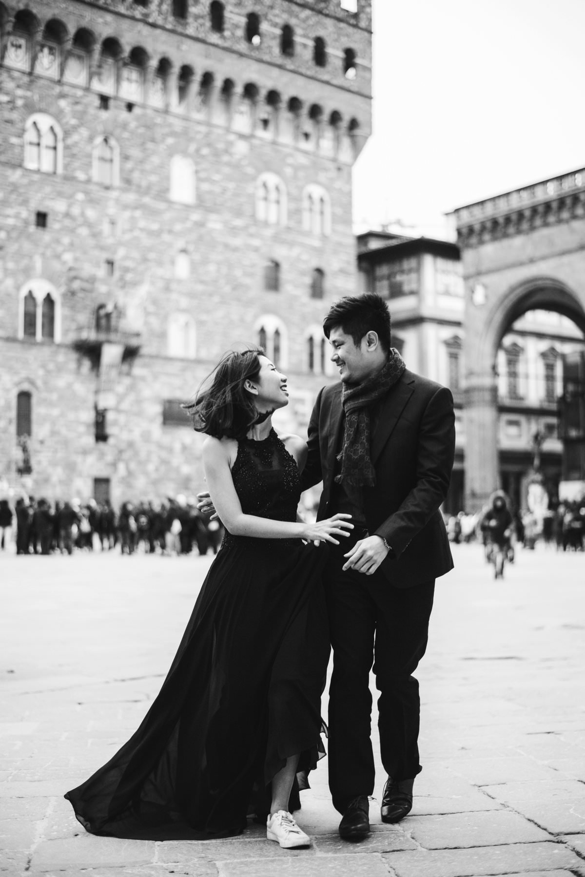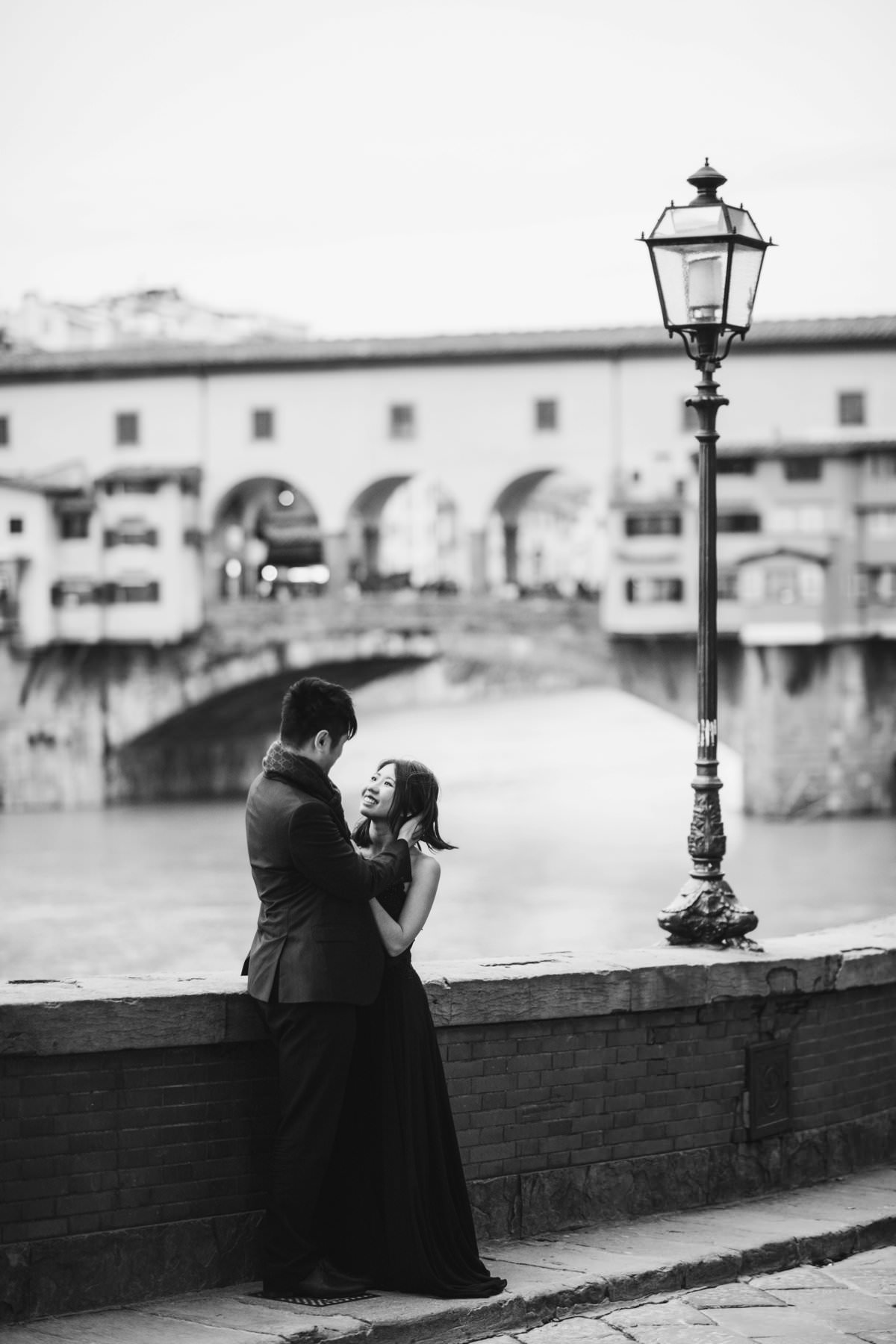 Old Bridge one of the majestic symbol of the city of Florence. Elegant and beautiful couple from Singapore Melissa and Ray in one of the most romantic place to get engagement photos in cradle of the Renaissance city of Florence.