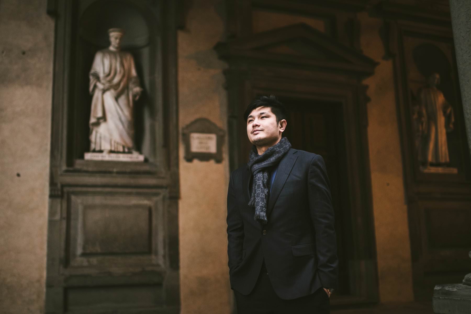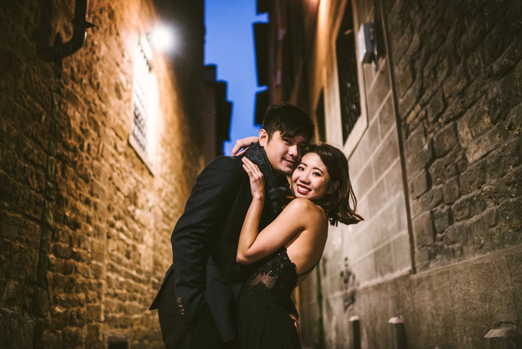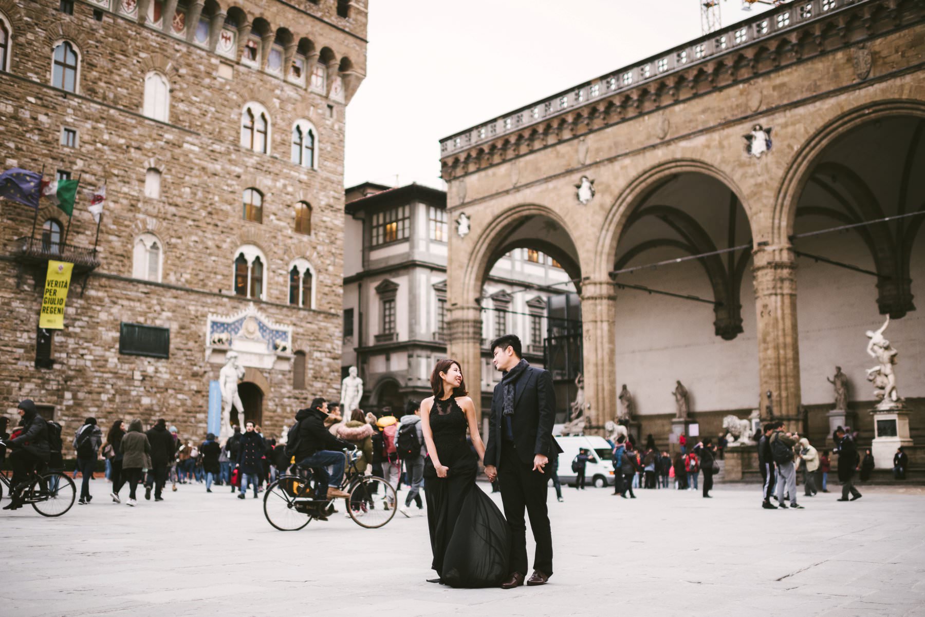 Old Bridge one of the majestic symbol of the city of Florence. Elegant and beautiful couple from Singapore Melissa and Ray in one of the most romantic place to get engagement photos in cradle of the Renaissance city of Florence.