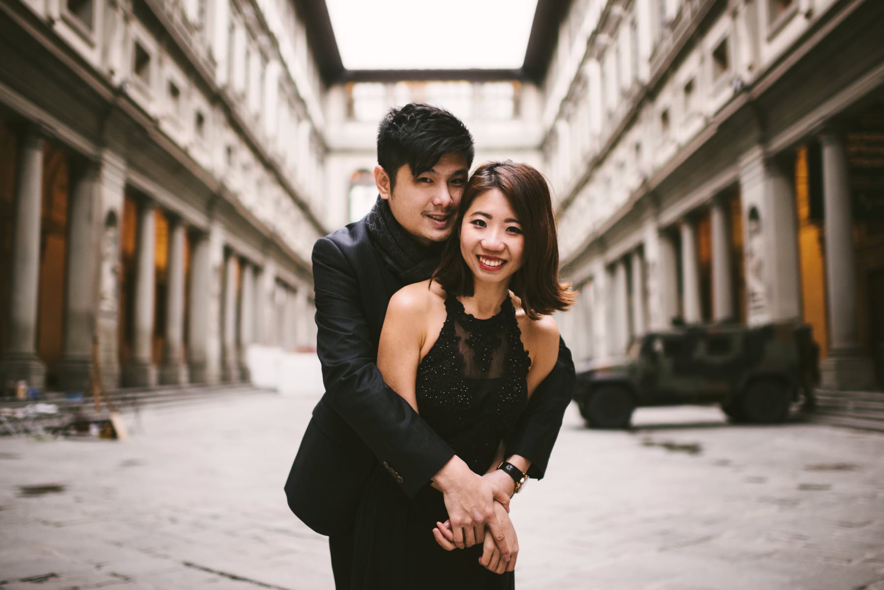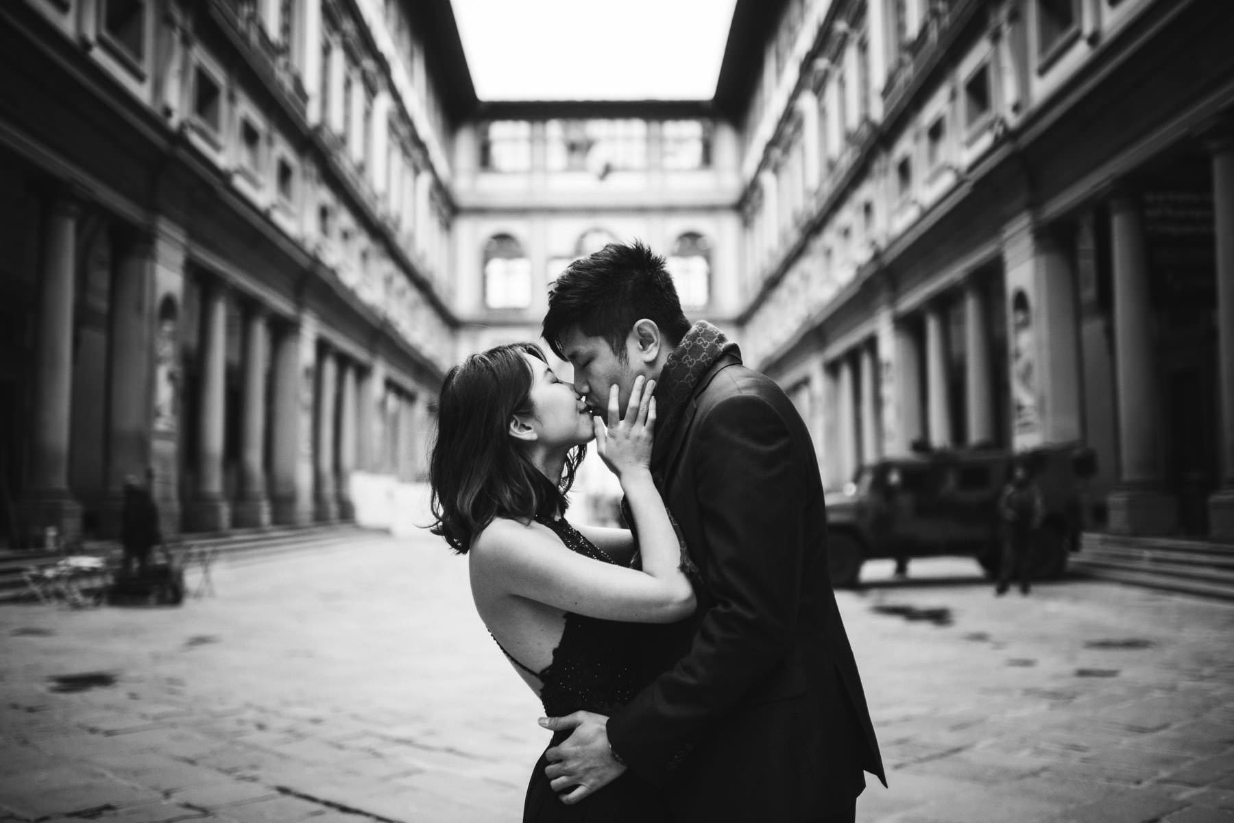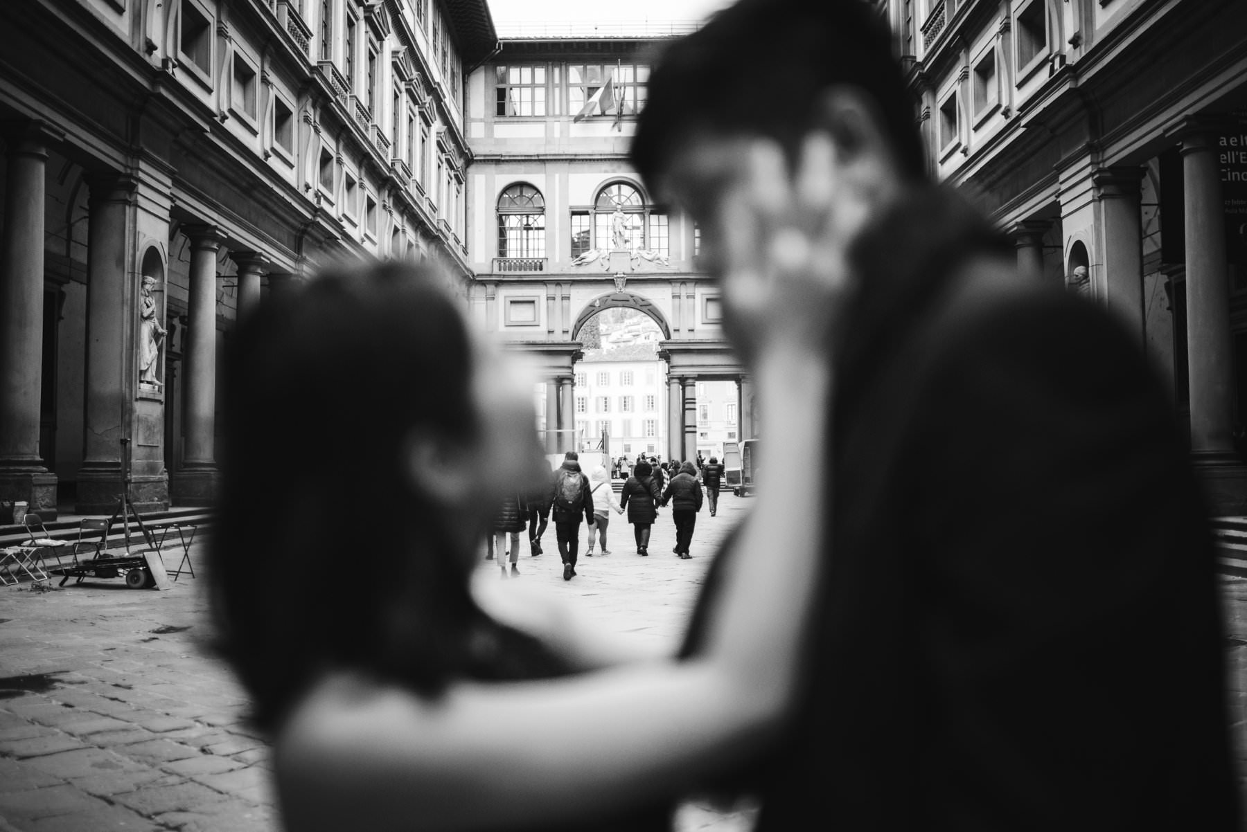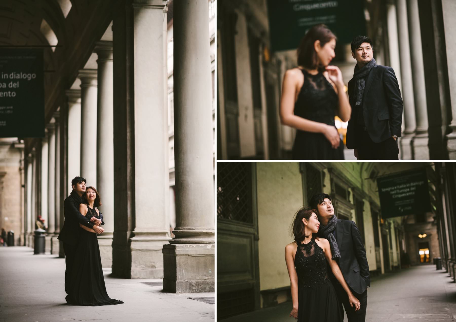 Lovely couple portrait at Uffizi Art Gallery in the heart of the cradle of Renaissance city of Florence. Engagement photo shoot by pre wedding photographer Gabriele Fani.