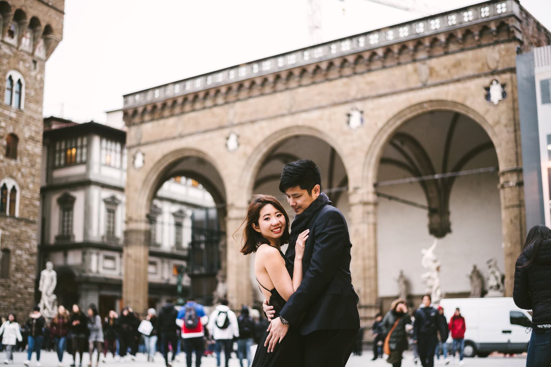 Couple photo shoot in Piazza della Signoria near Loggia dei Lanzi and Palazzo Vecchio in Florence. Photo by engagement photographer in Tuscany Gabriele Fani.
