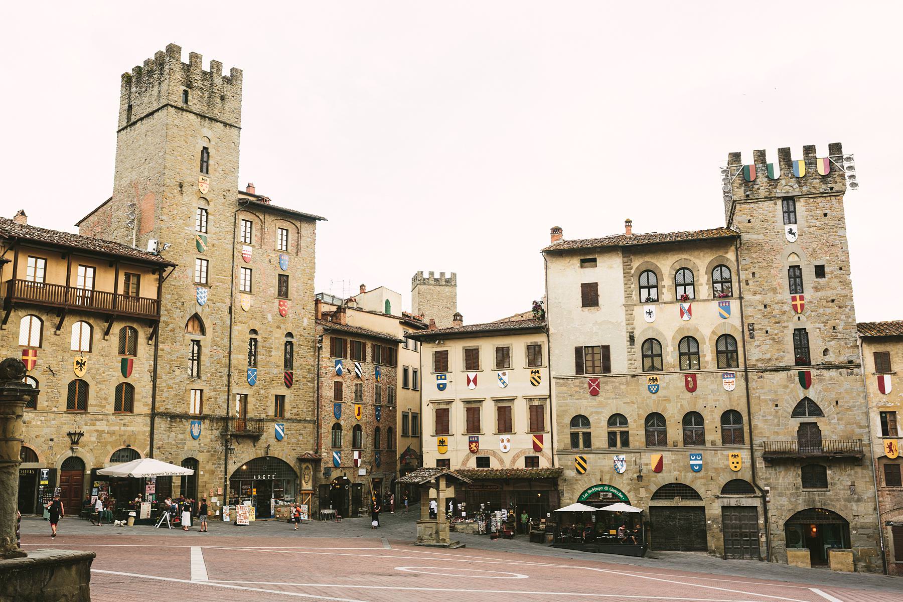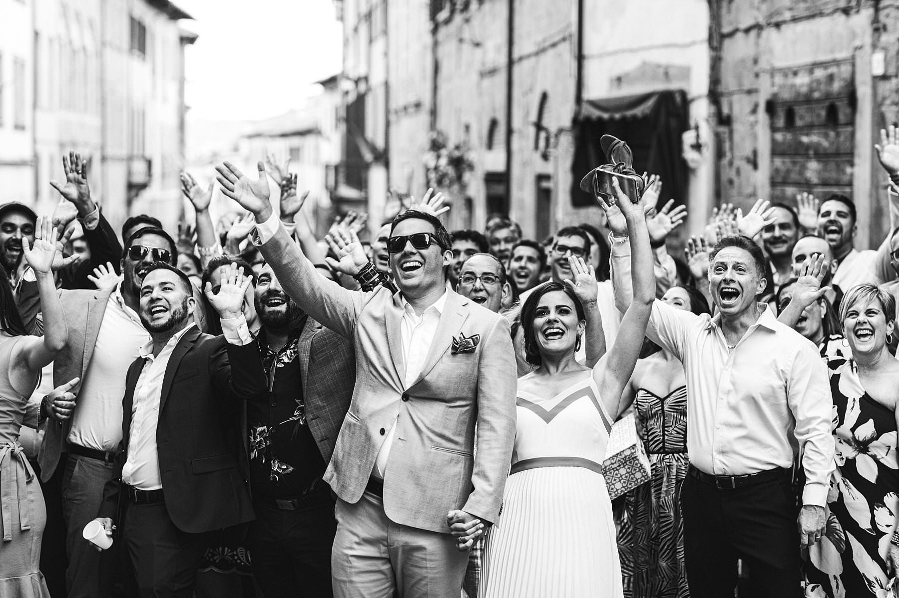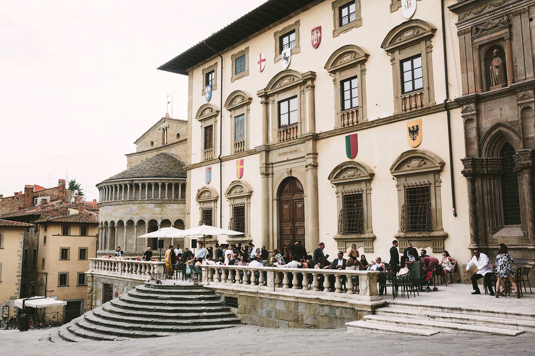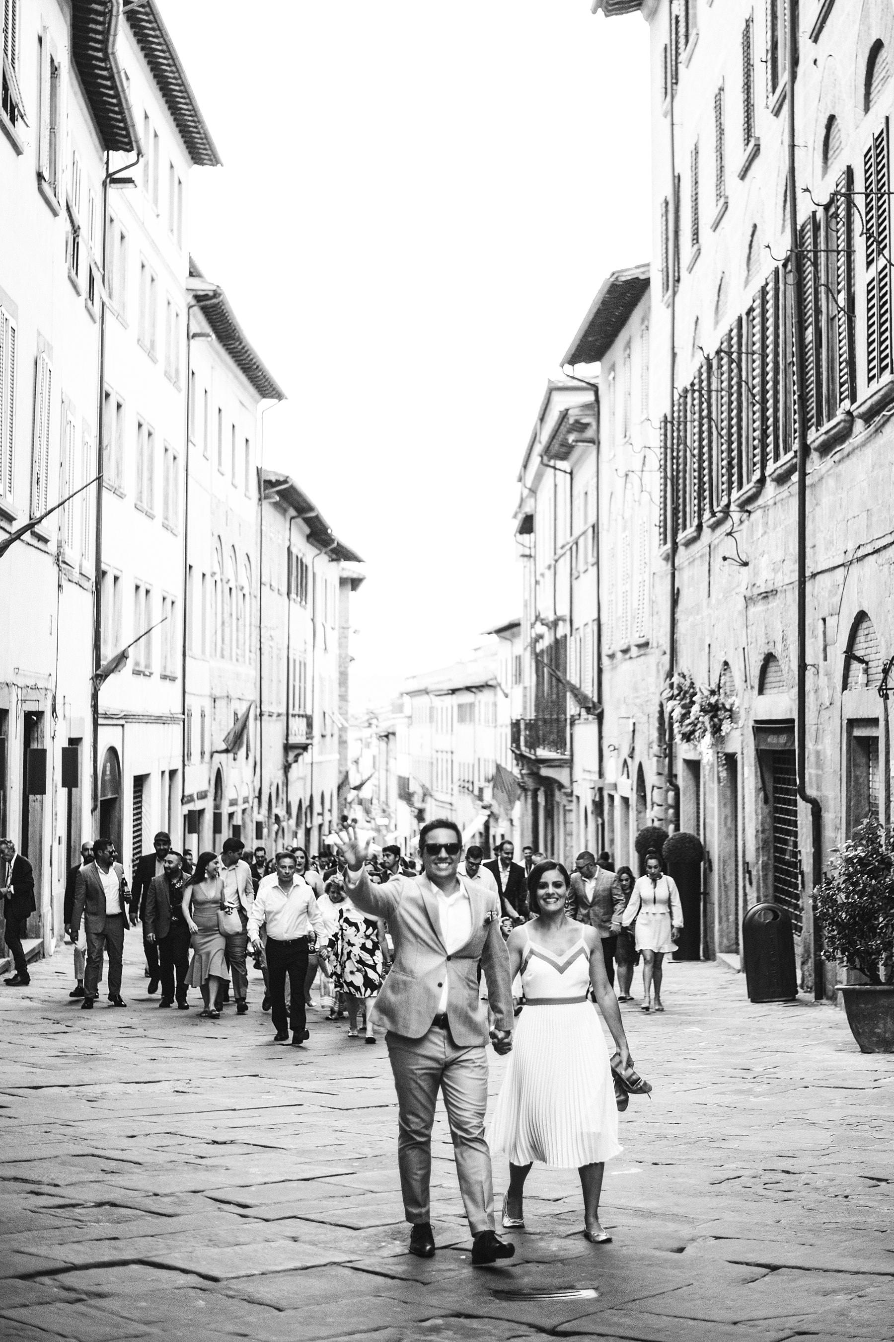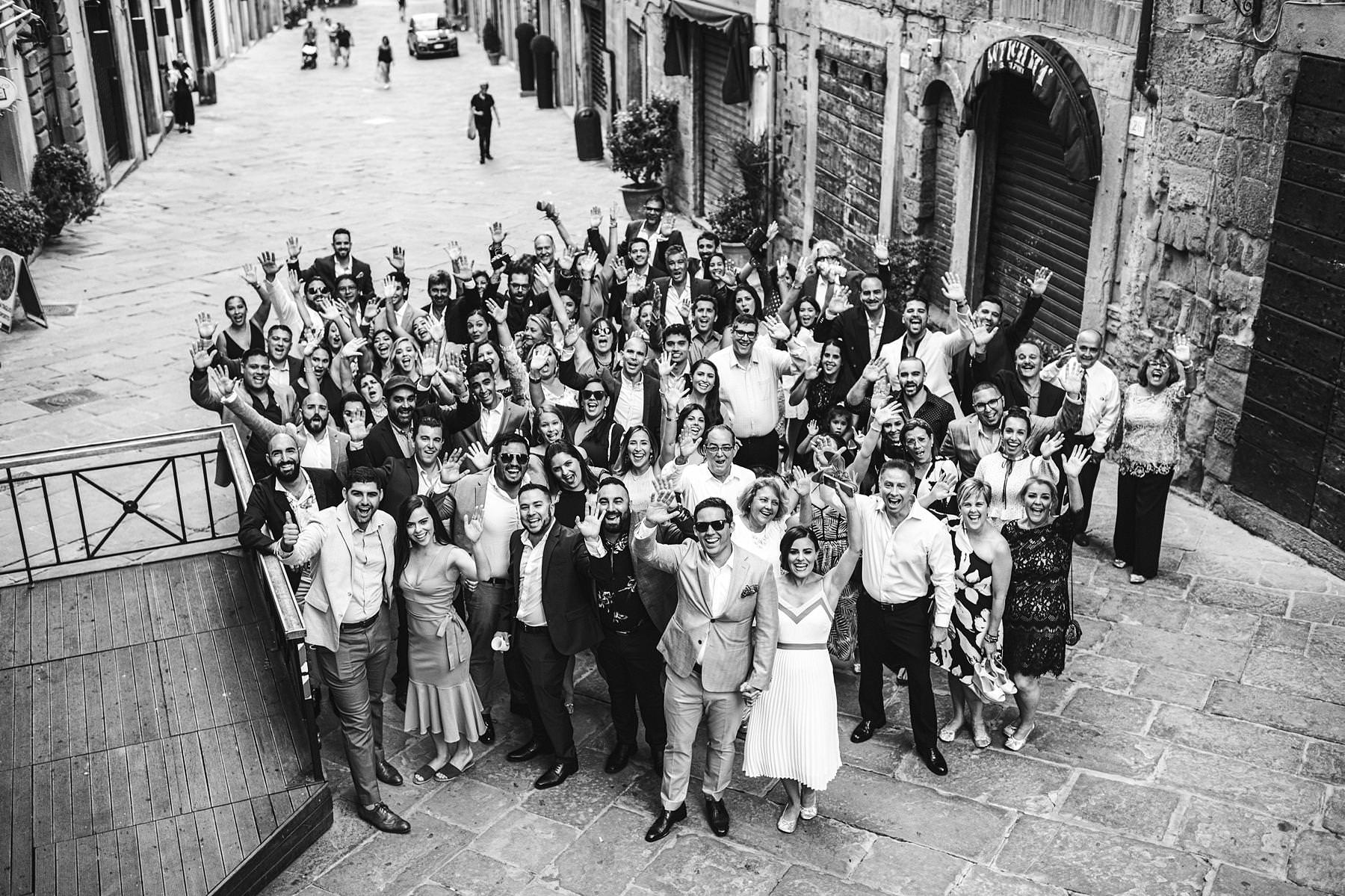 A colorful bunch of lively people turned Piazza Grande into a big dinner table and then party scene, with dances, laughters and a quick photo shooting – of the whole group and of the couple. It was definitely a great way to get to know the future spouses and all of their guests right before the upcoming Tuscany wedding.