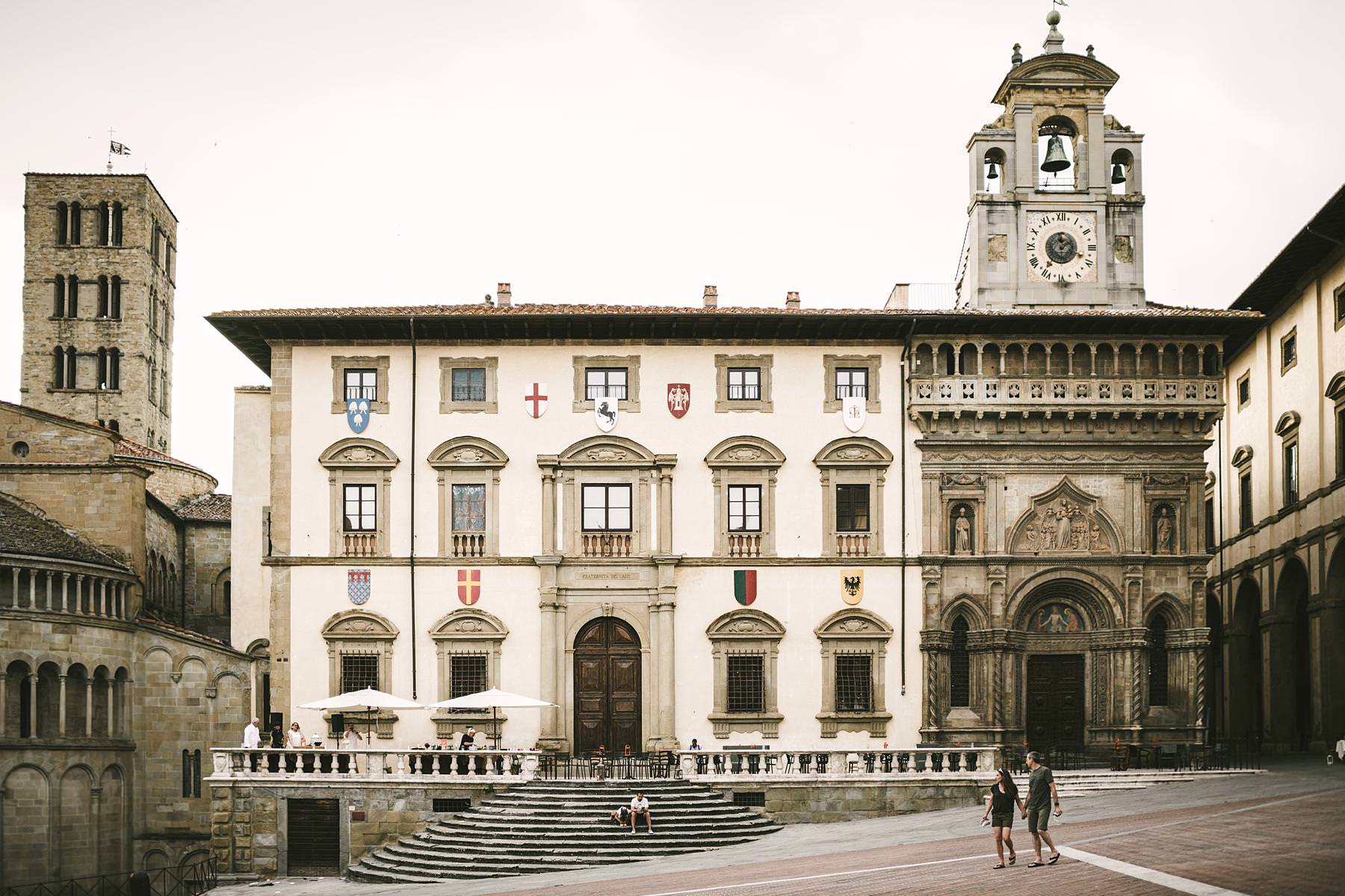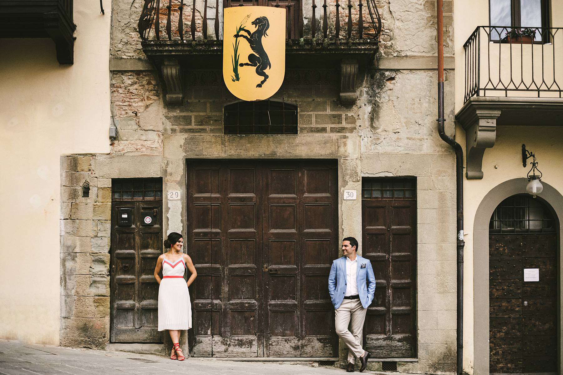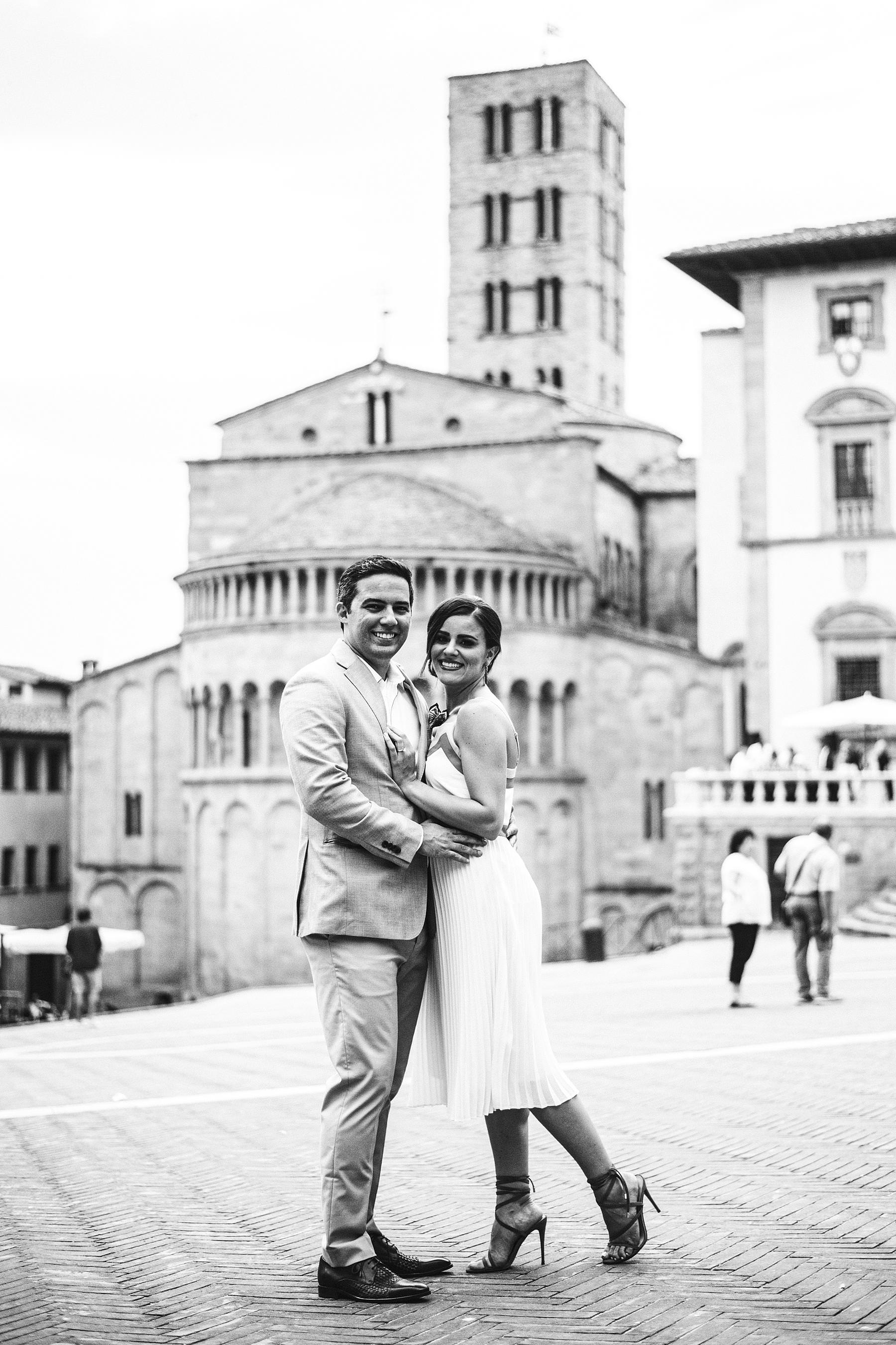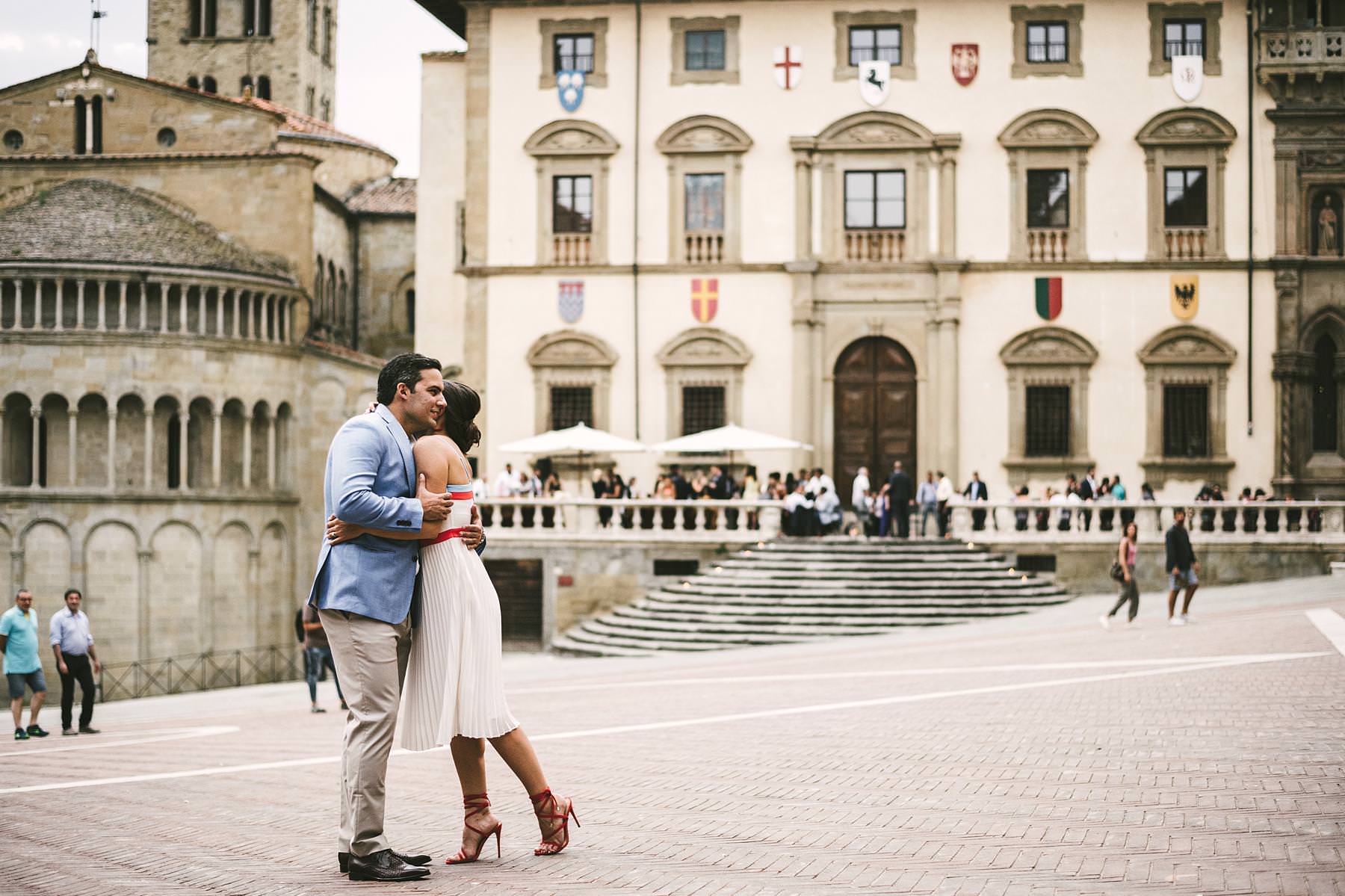 Destination wedding in Arezzo. Bride and groom prewedding couple portrait photo shoot at Piazza Grande during welcome dinner. Photo by the Italian elegant modern wedding photographer in Tuscany based Florence Gabriele Fani
