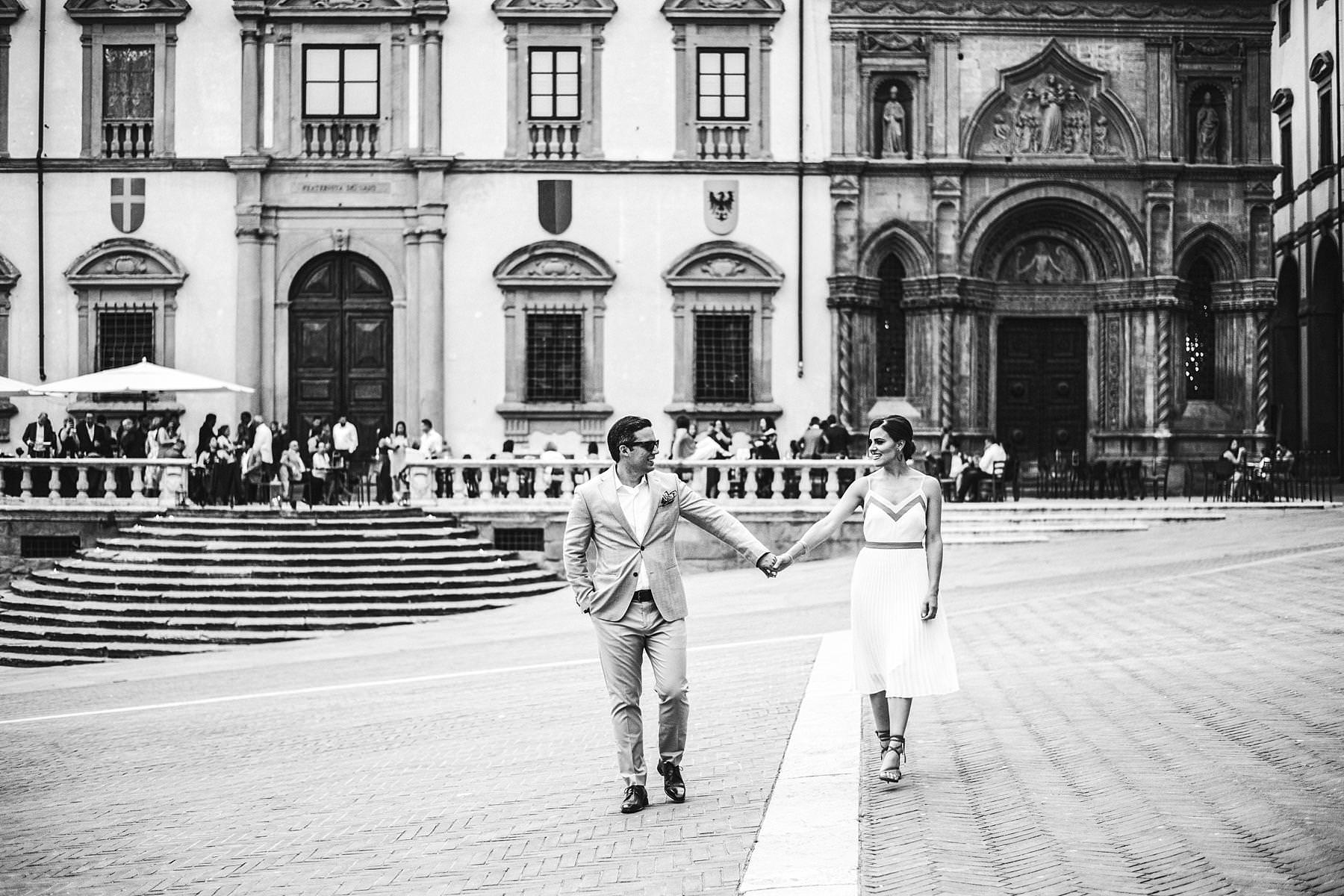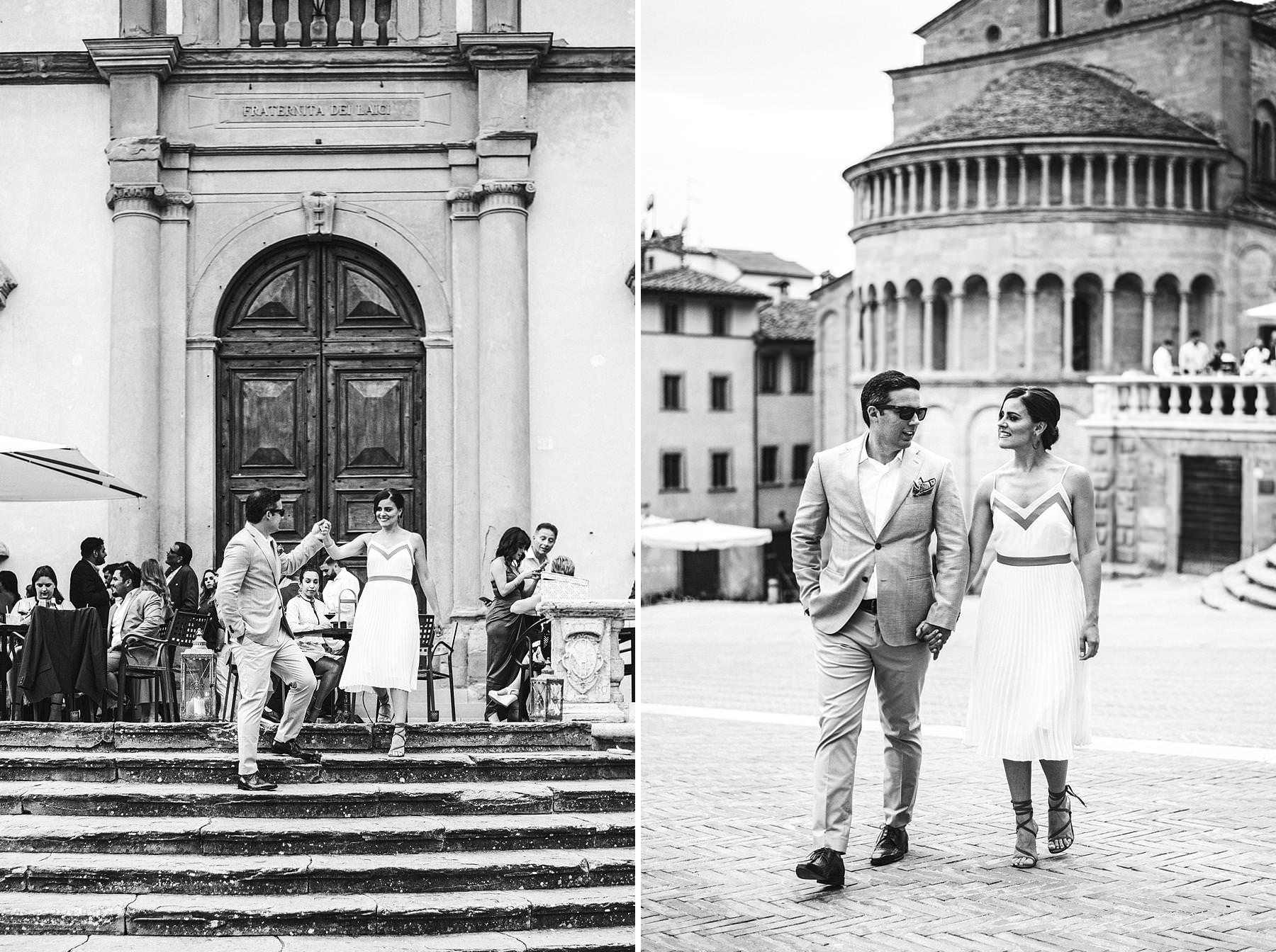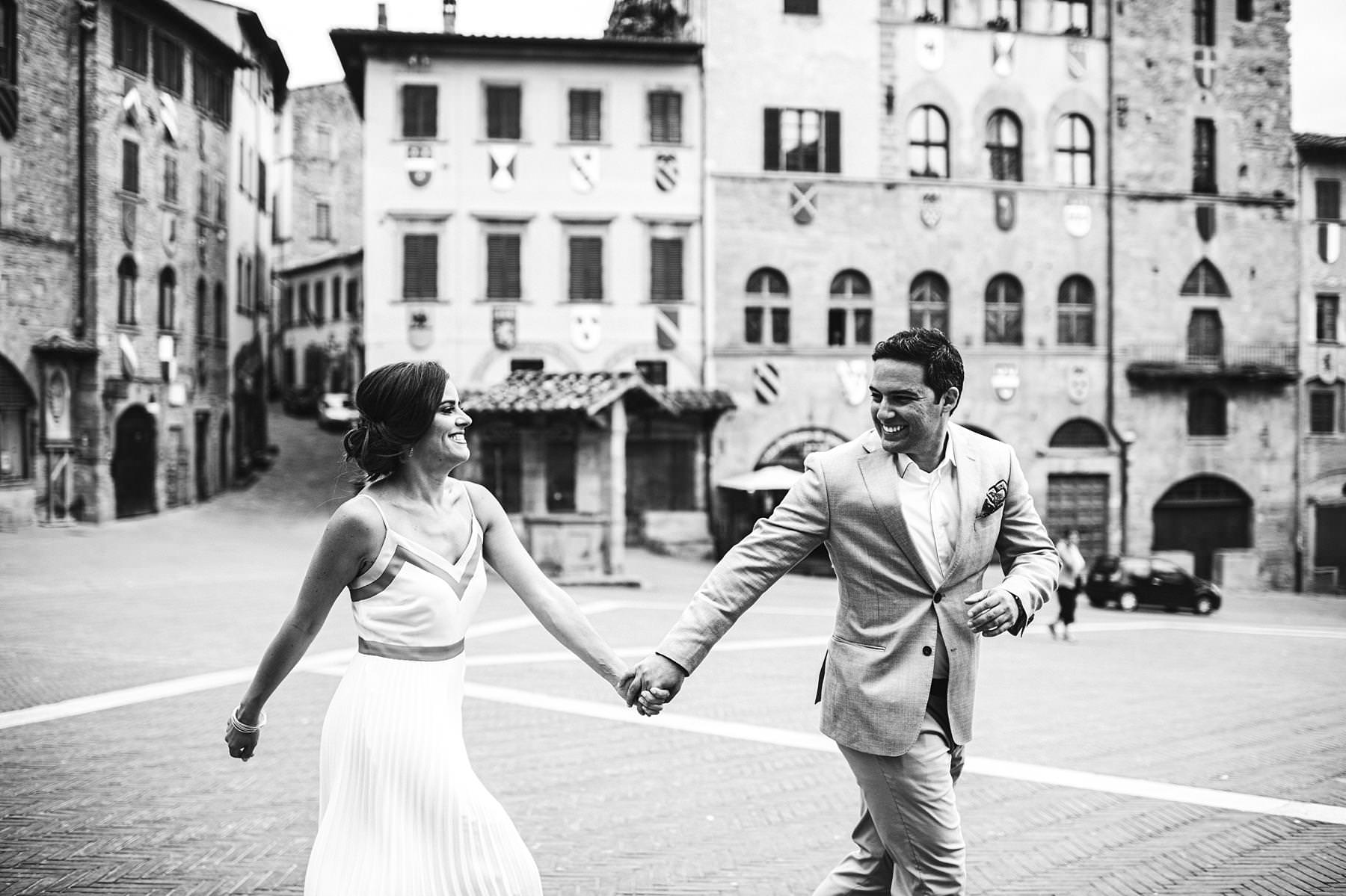 Destination wedding in Arezzo. Exciting bride and groom prewedding portrait session at Piazza Grande during welcome dinner. Photo by the Italian elegant modern wedding photographer in Tuscany based Florence Gabriele Fani