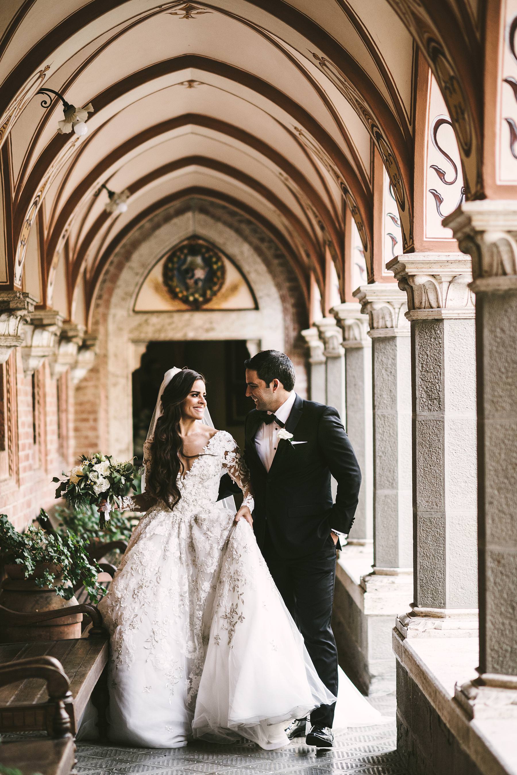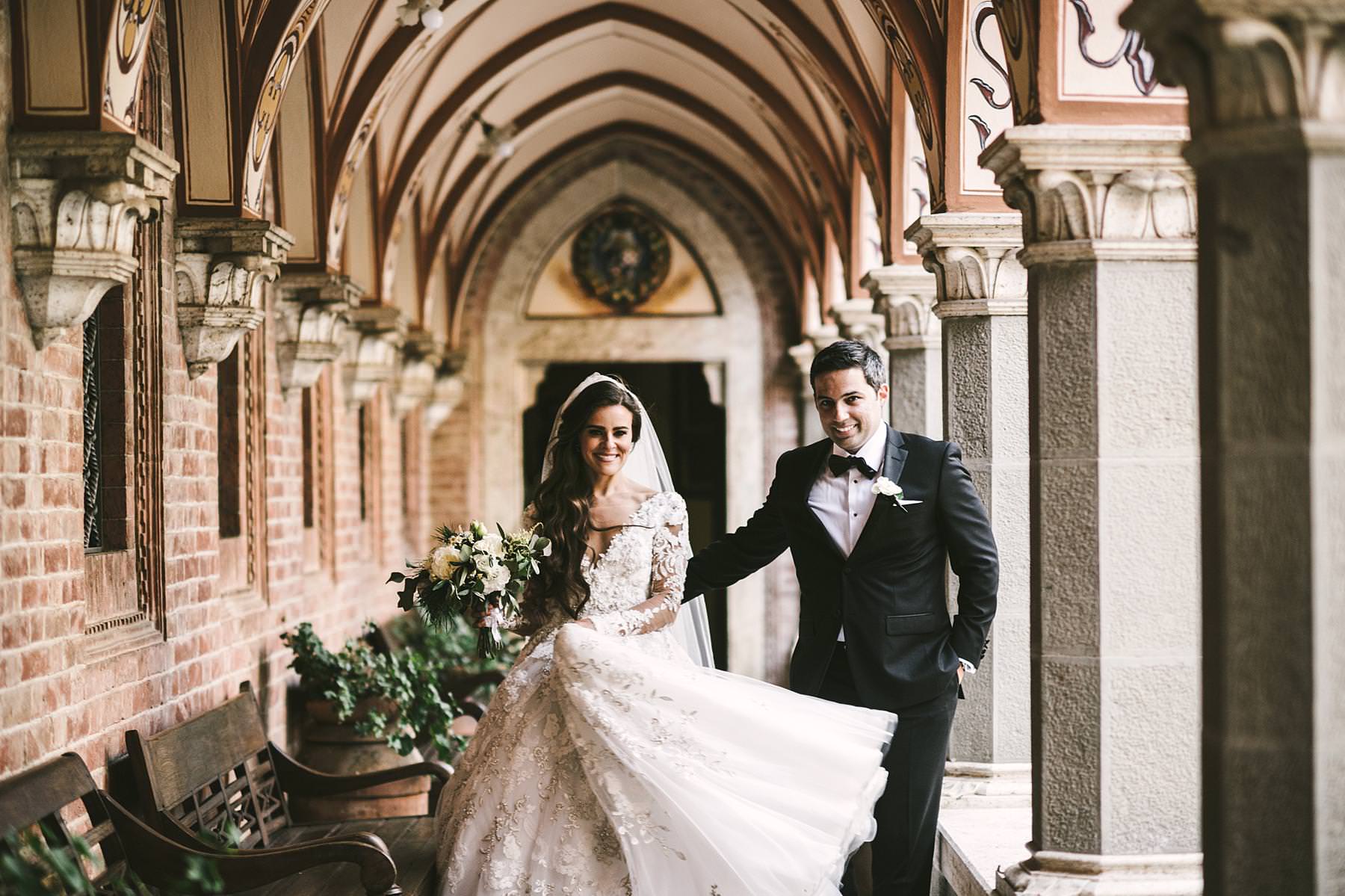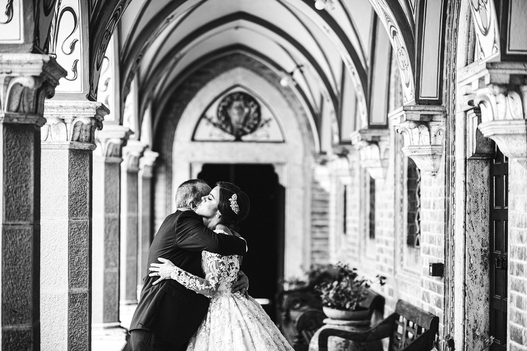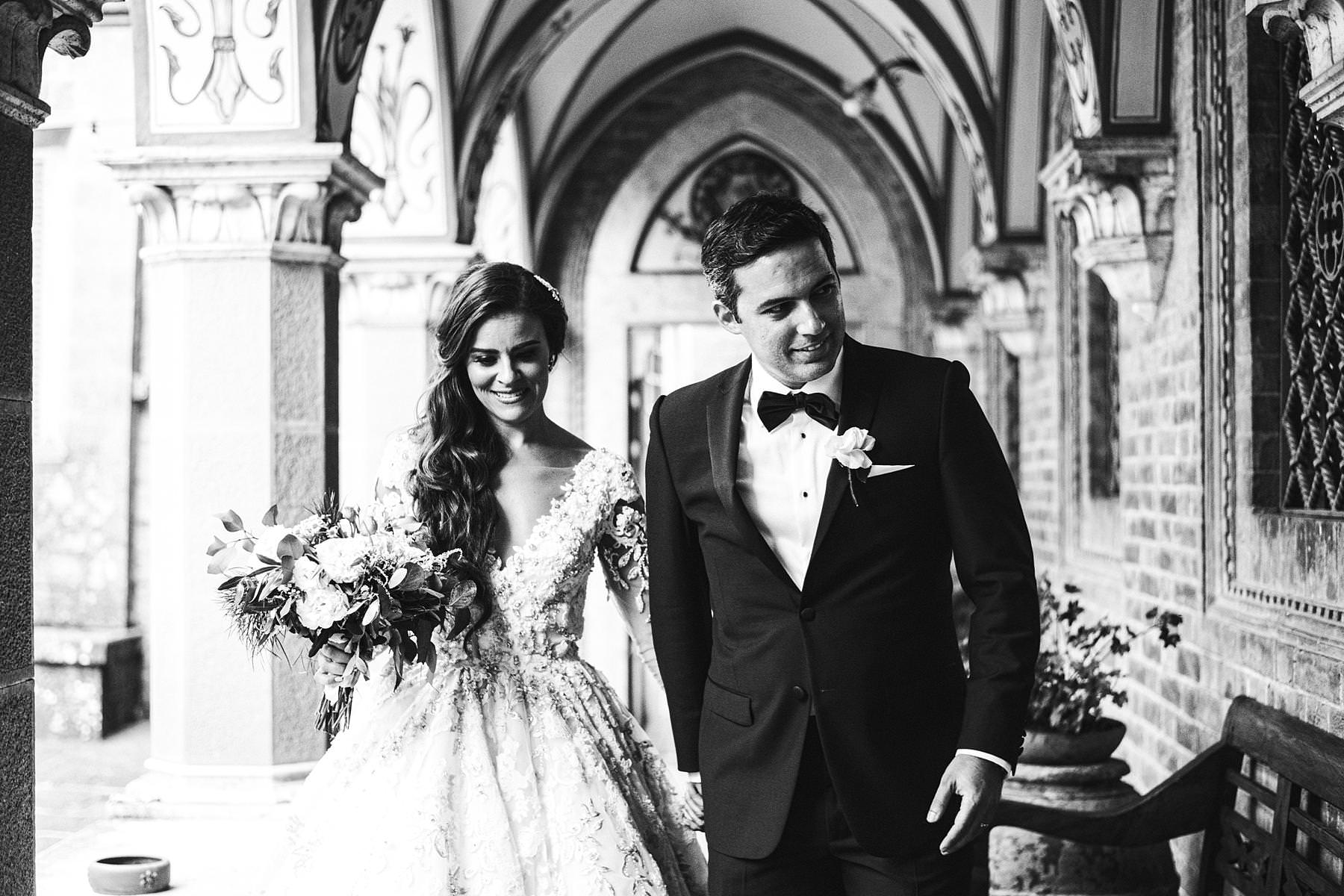 The bride and groom got ready for their big day in the rooms of the Castle, which really seems to come from a different era. Ilyssa was extremely beautiful in her richly decorated dress and her dad’s tears testified it. I couldn’t help shooting photos of her under the arches of the Castle’s hallway: she really looked like a princess.