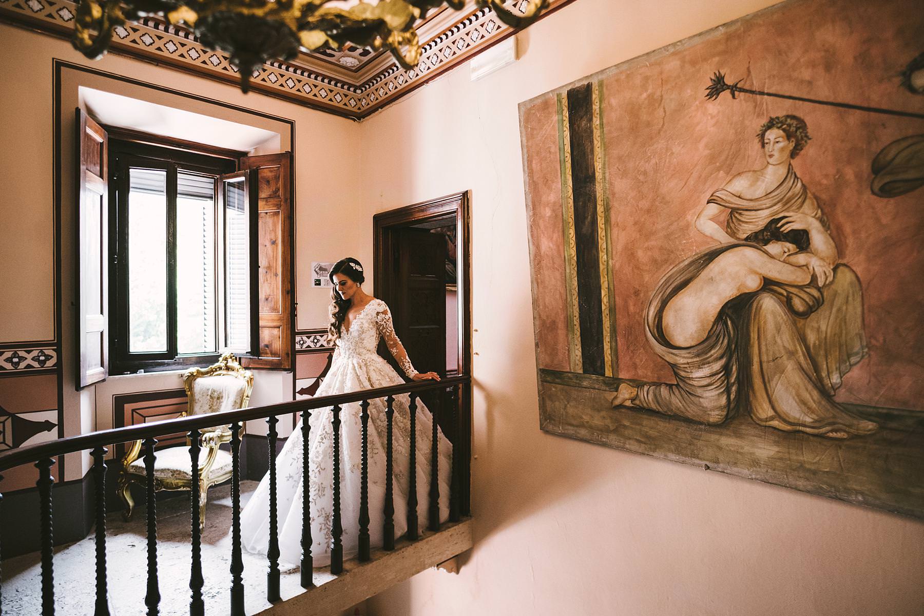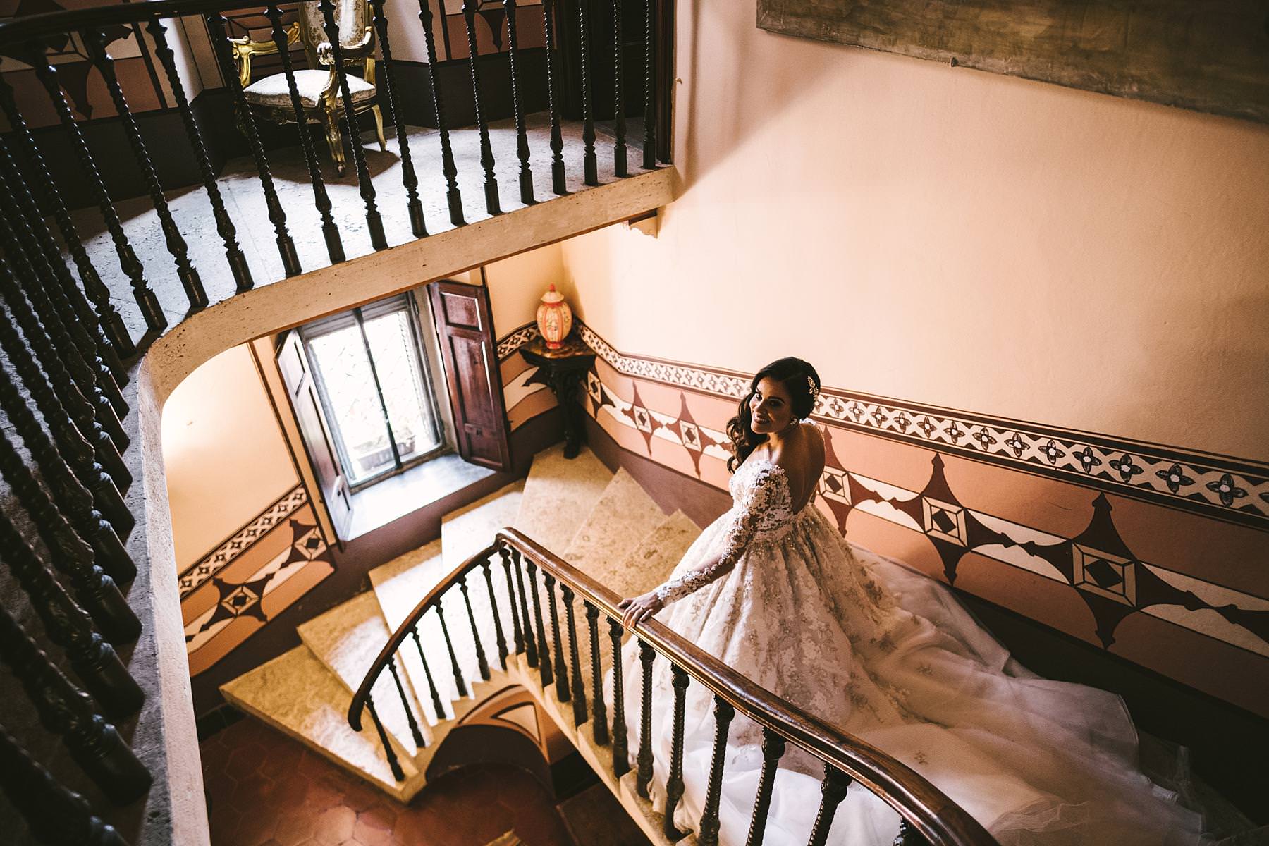 Rippling and sumptuous Tuscany wedding in the elegant Castle of Valenzano. Gorgeous bride Ilyssa in Ysa Makino elegant dress walks down the staircase of the castle. Destination wedding in Tuscany. Photo by the Italian elegant modern wedding photographer in Tuscany based Florence Gabriele Fani