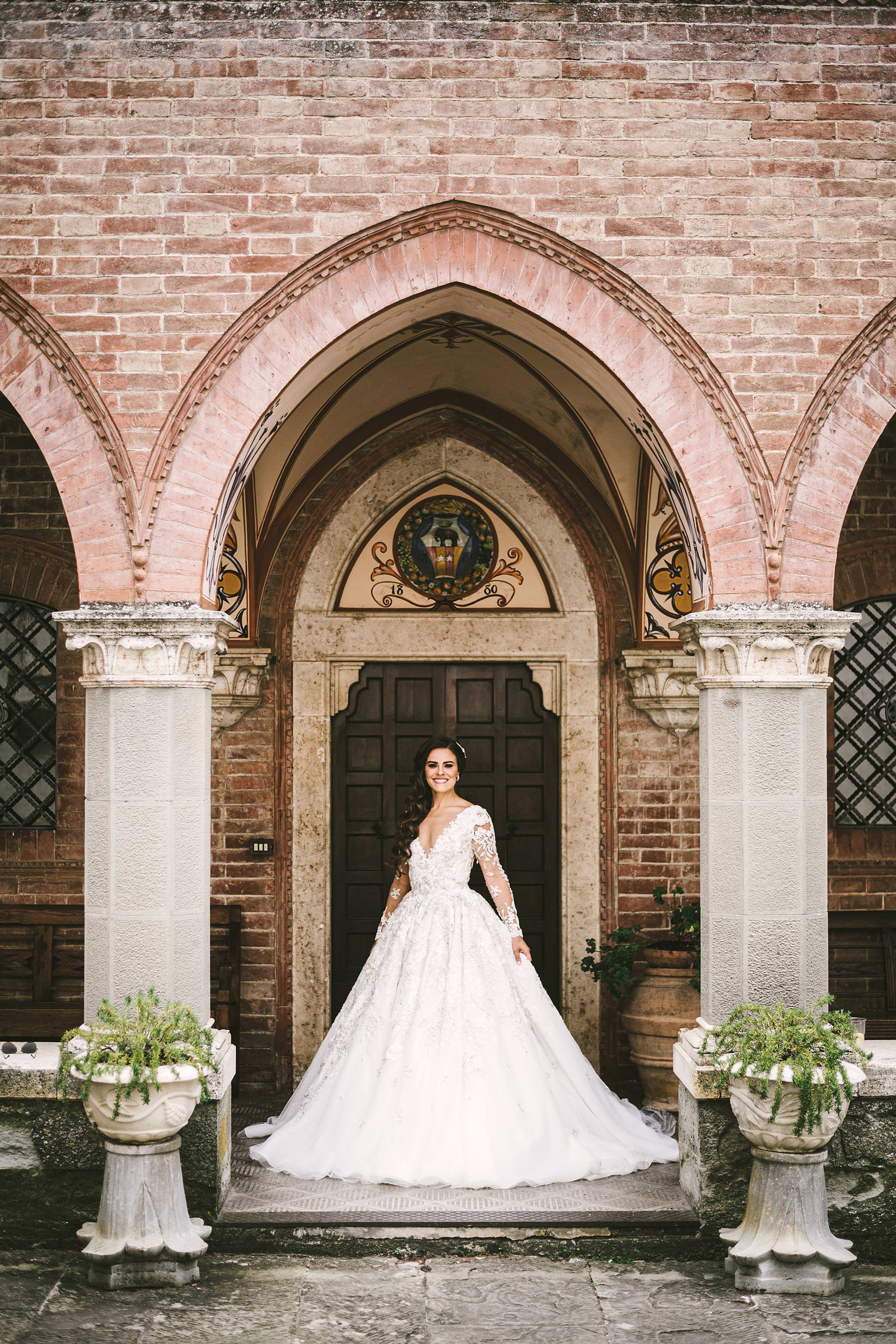 Elegant and gorgeous bride wedding dress by Ysa Makino at Valenzano Castle in Tuscany near Arezzo. Photo by the Italian elegant modern wedding photographer in Tuscany based Florence Gabriele Fani