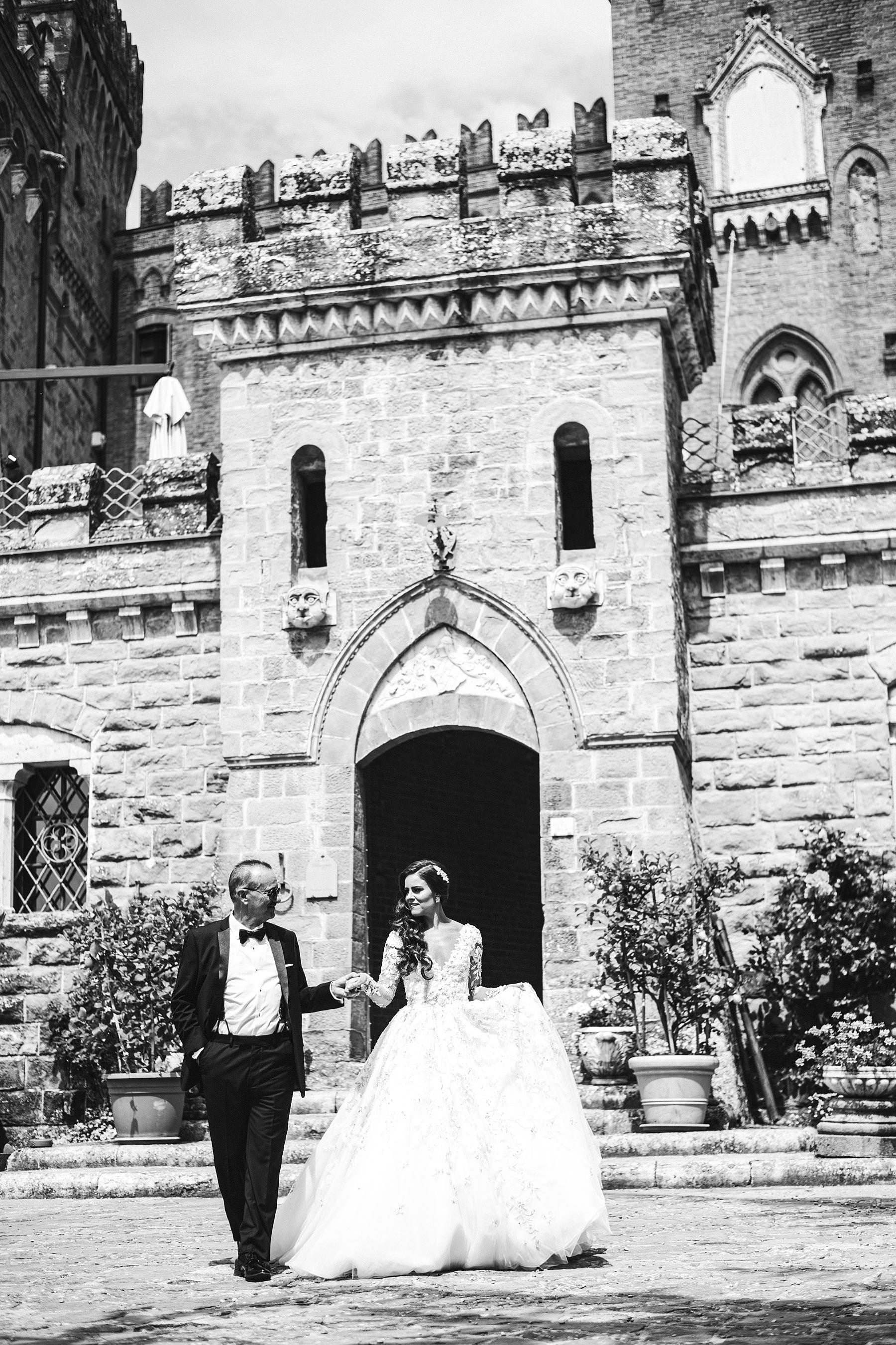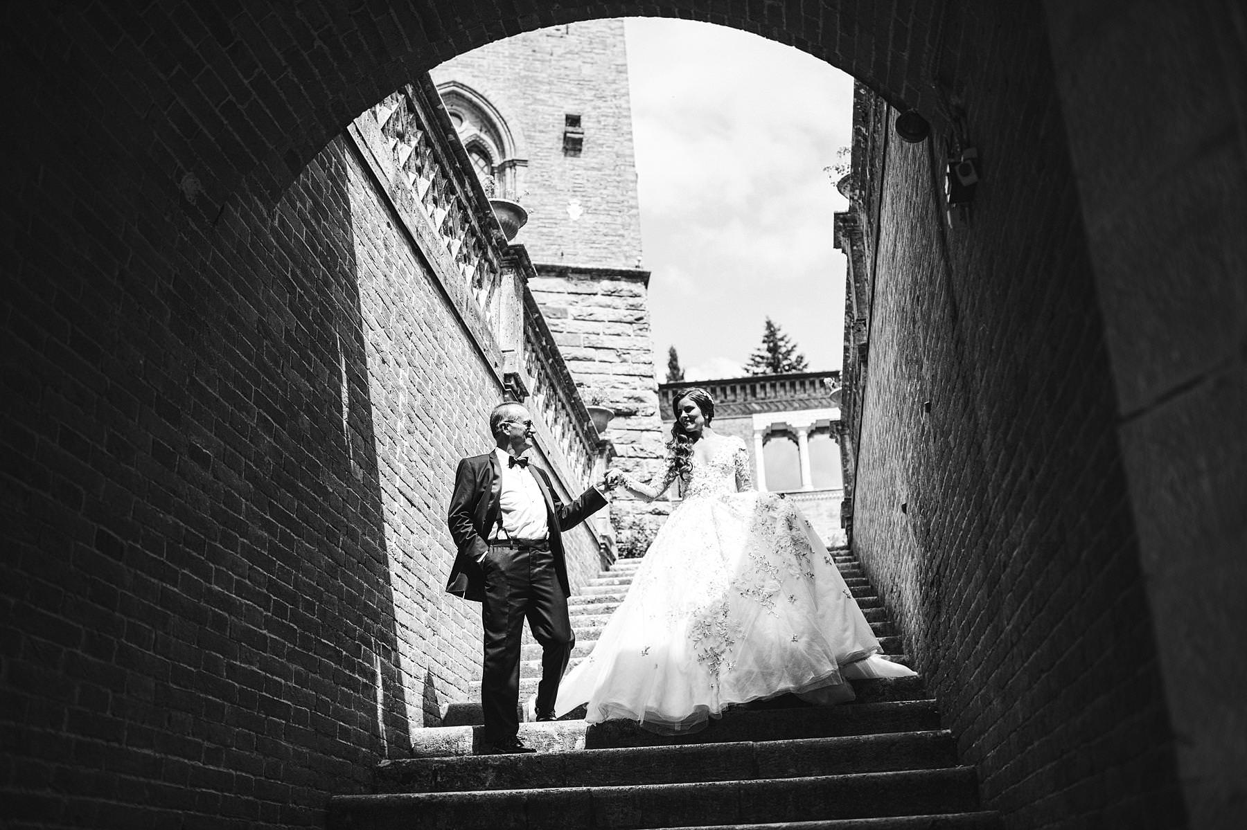 Bride in Ysa Makino wedding gown walks with father in the Valenzano Castle historic staircase. Photo by the Italian elegant modern wedding photographer in Tuscany based Florence Gabriele Fani