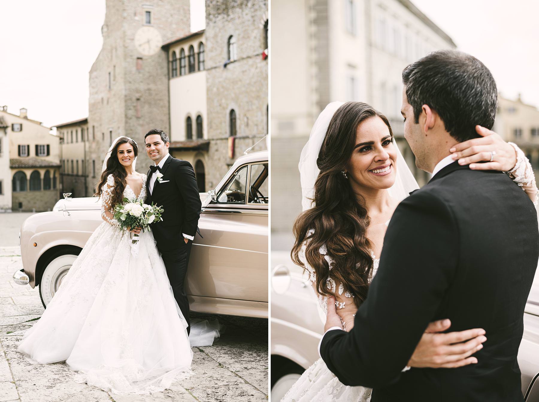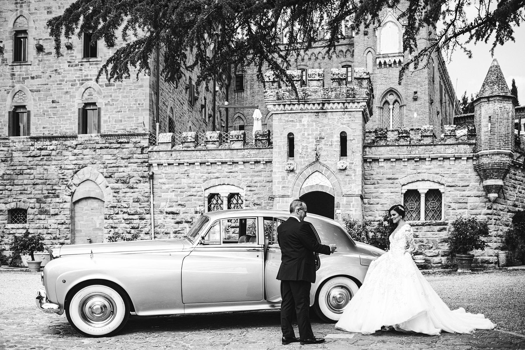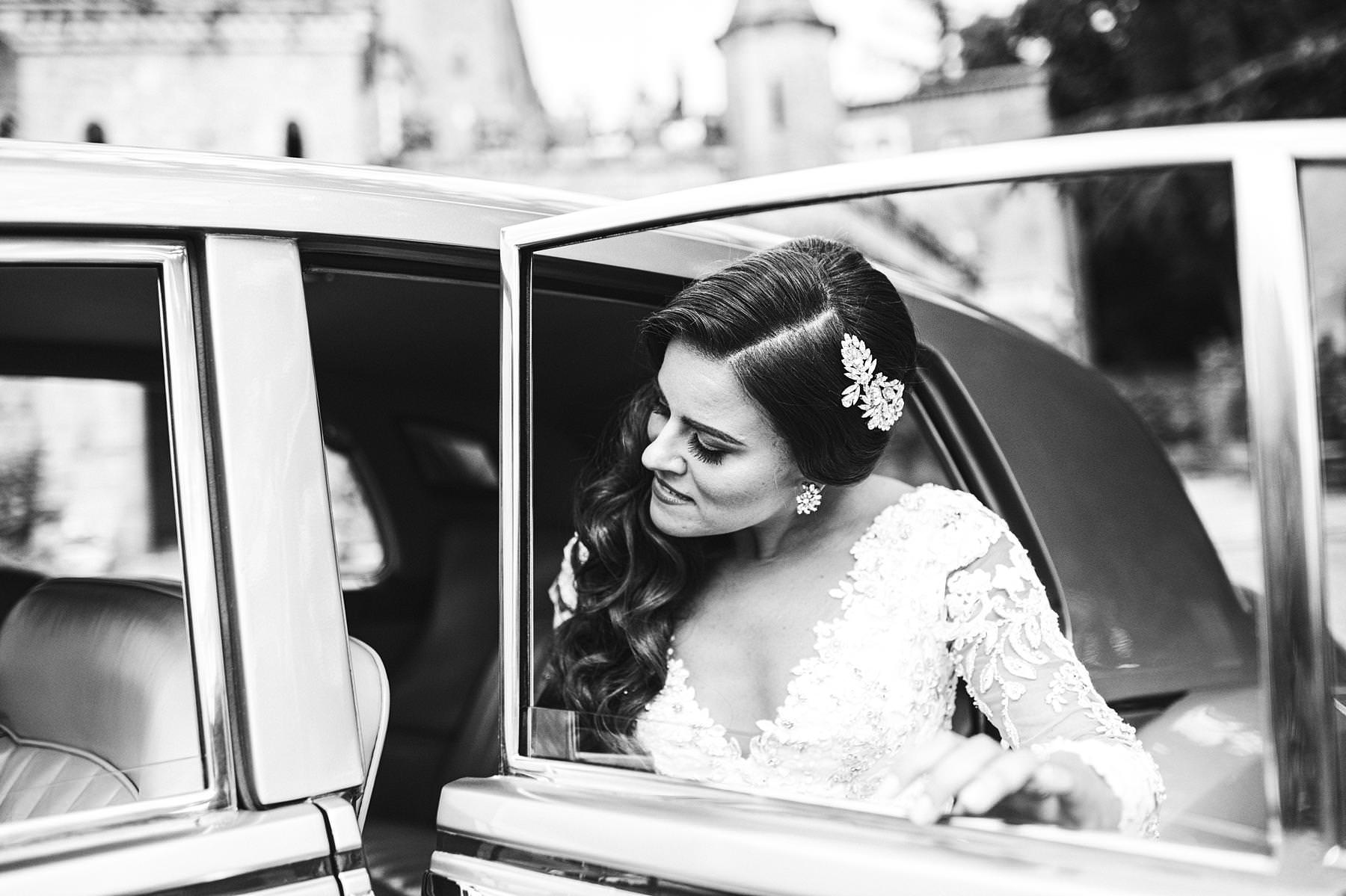 Bride Ilyssa just ready to take the Rolls toward Arezzo Cathedral for the Catholic ceremony. Elegant destination wedding in Tuscany at Valenzano Castle. Photo by the Italian elegant modern wedding photographer in Tuscany based Florence Gabriele Fani