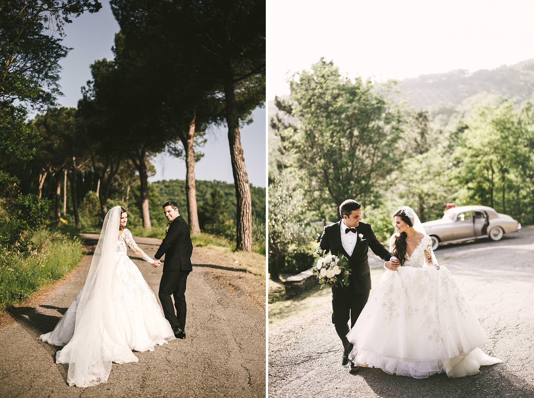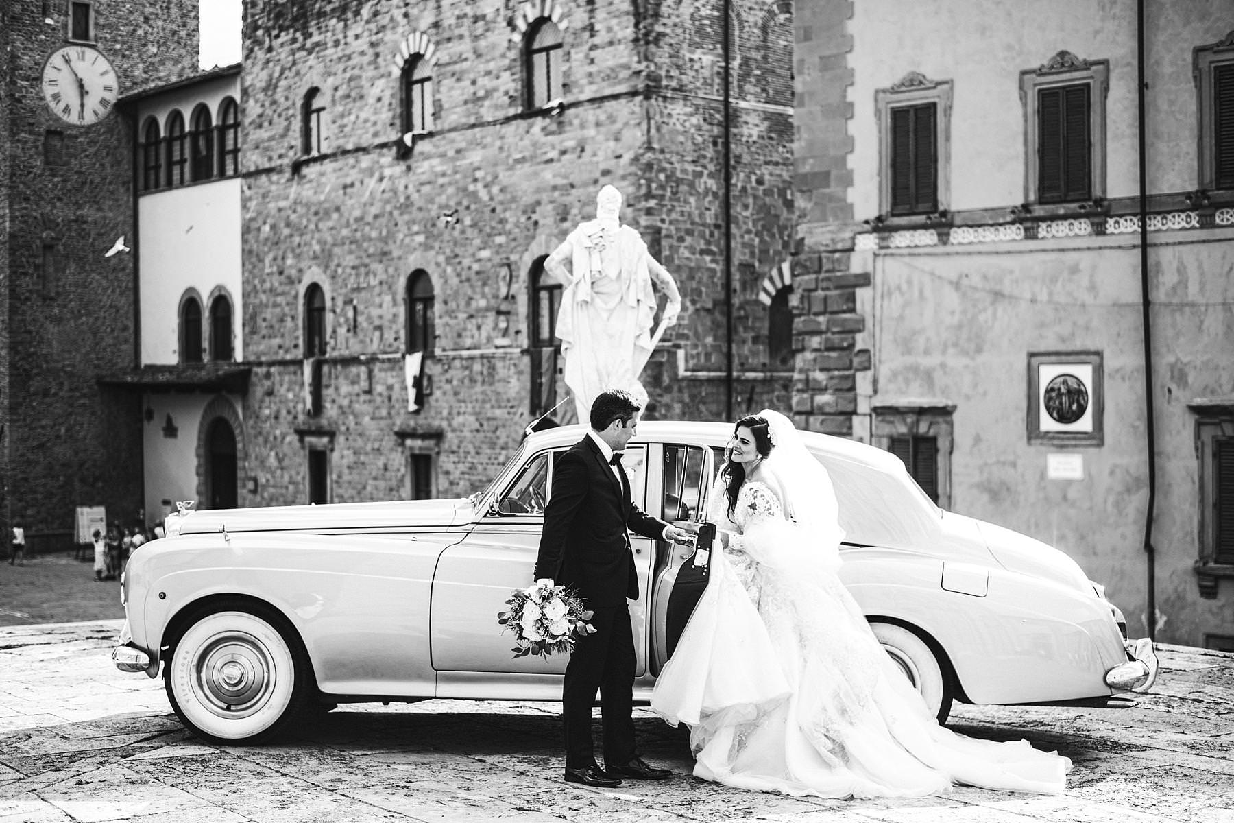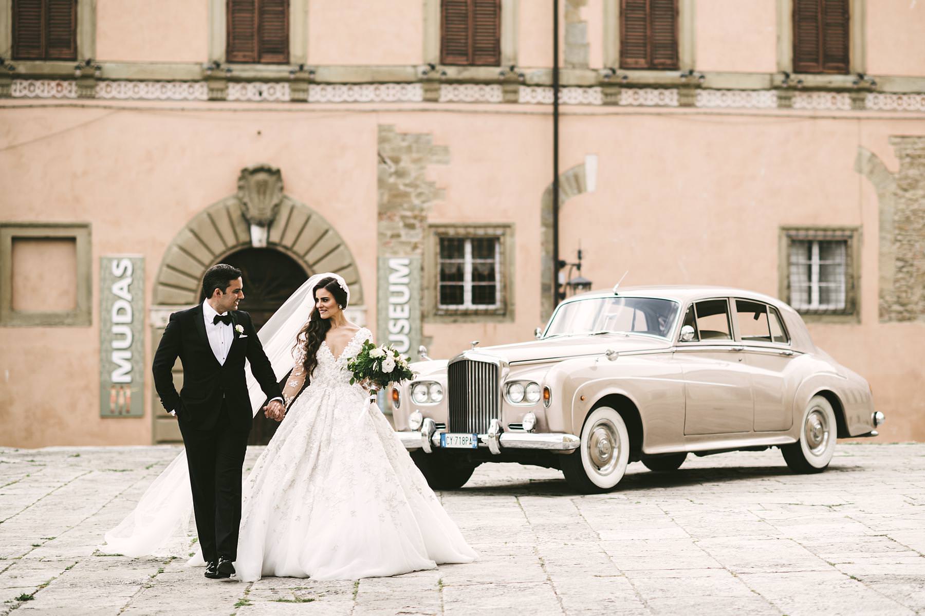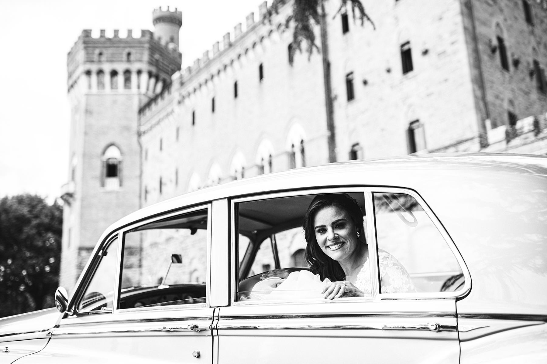 Bride Ilyssa just ready to take the Rolls toward Arezzo Cathedral for the Catholic ceremony. Elegant destination wedding in Tuscany at Valenzano Castle. Photo by the Italian elegant modern wedding photographer in Tuscany based Florence Gabriele Fani