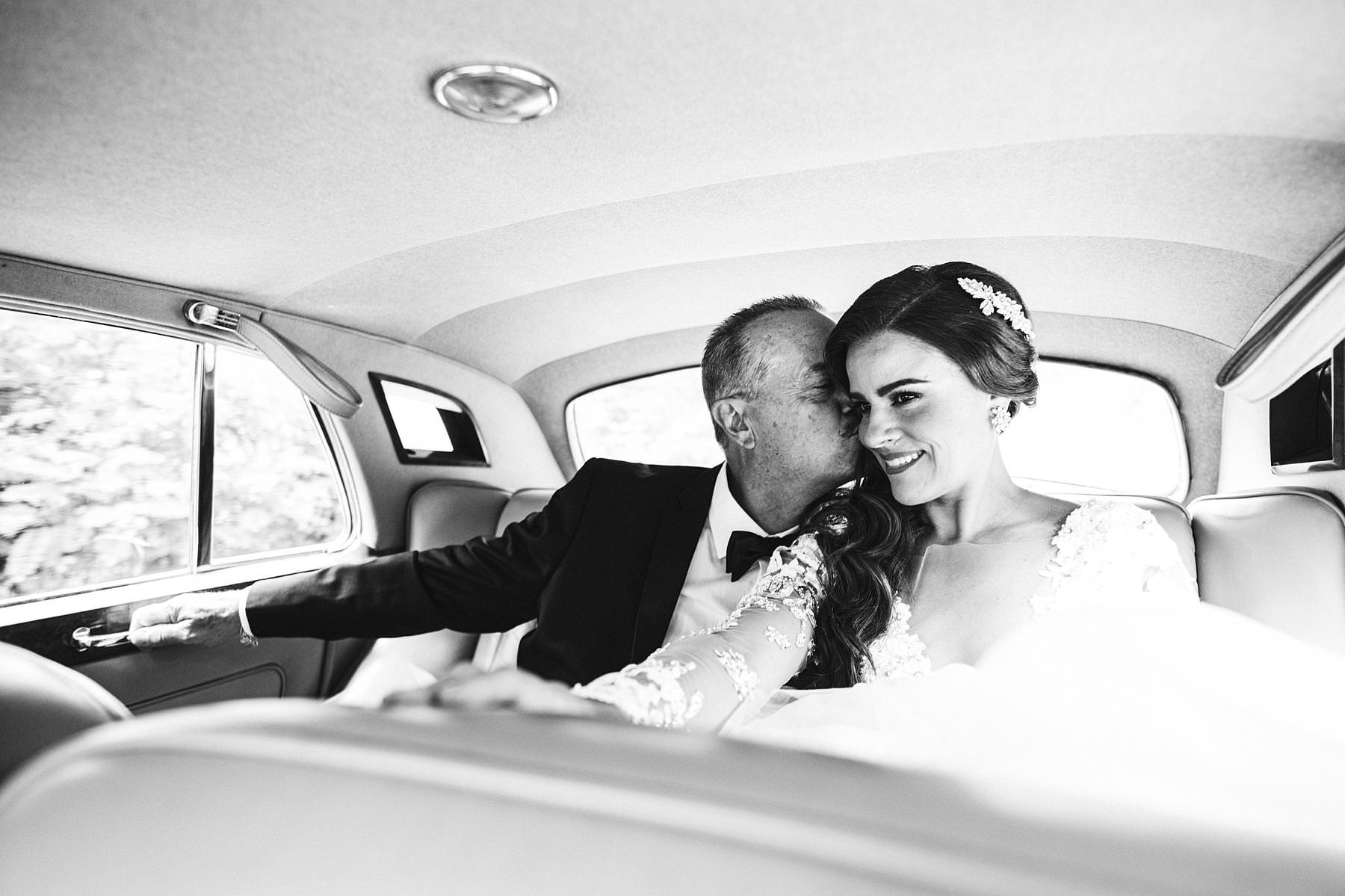Emotional and elegant drive and father first look at Valenzano Castle near Arezzo. Bridel Ilyssa in a gorgeous Ysa Makino wedding dress. Photo by the Italian elegant modern wedding photographer in Tuscany based Florence Gabriele Fani