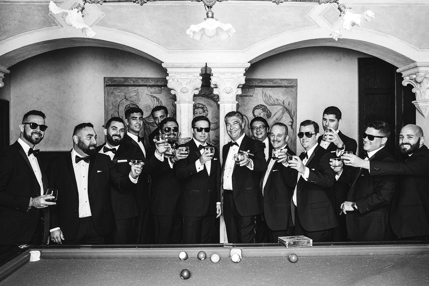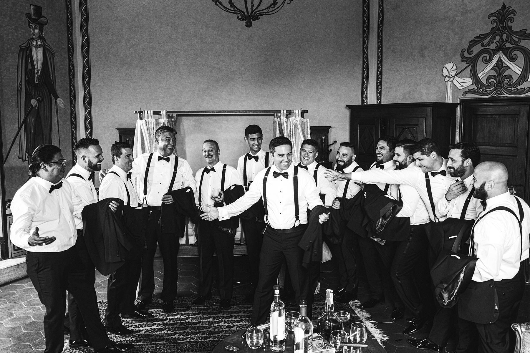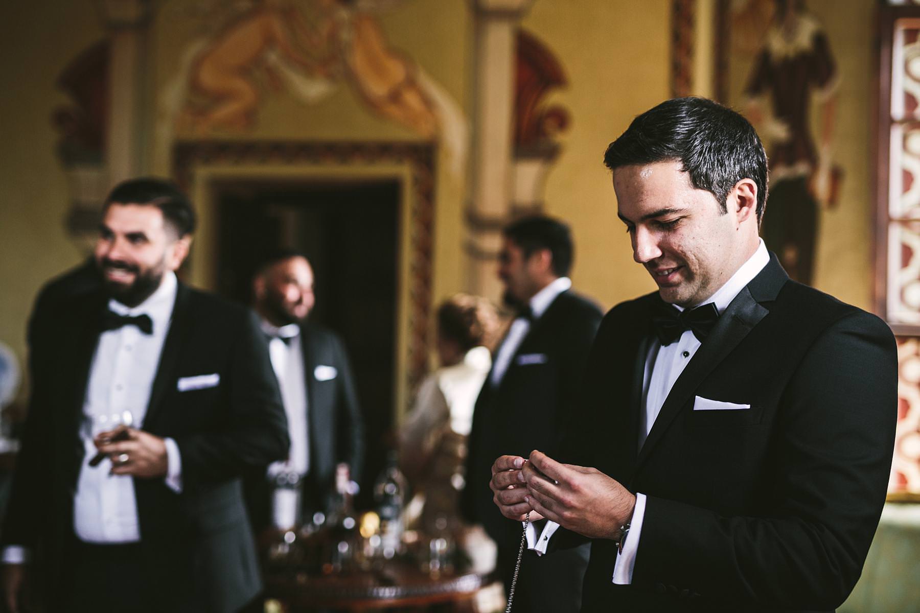 Groom getting ready at Valenzano Castle with groomsmen. Elegant destination wedding in Tuscany. Photo by the Italian elegant modern wedding photographer in Tuscany based Florence Gabriele Fani