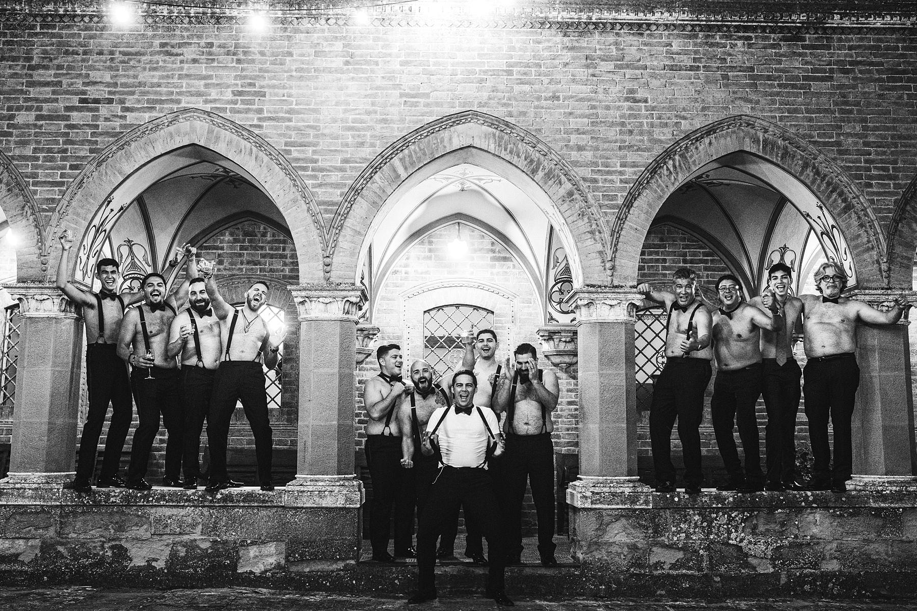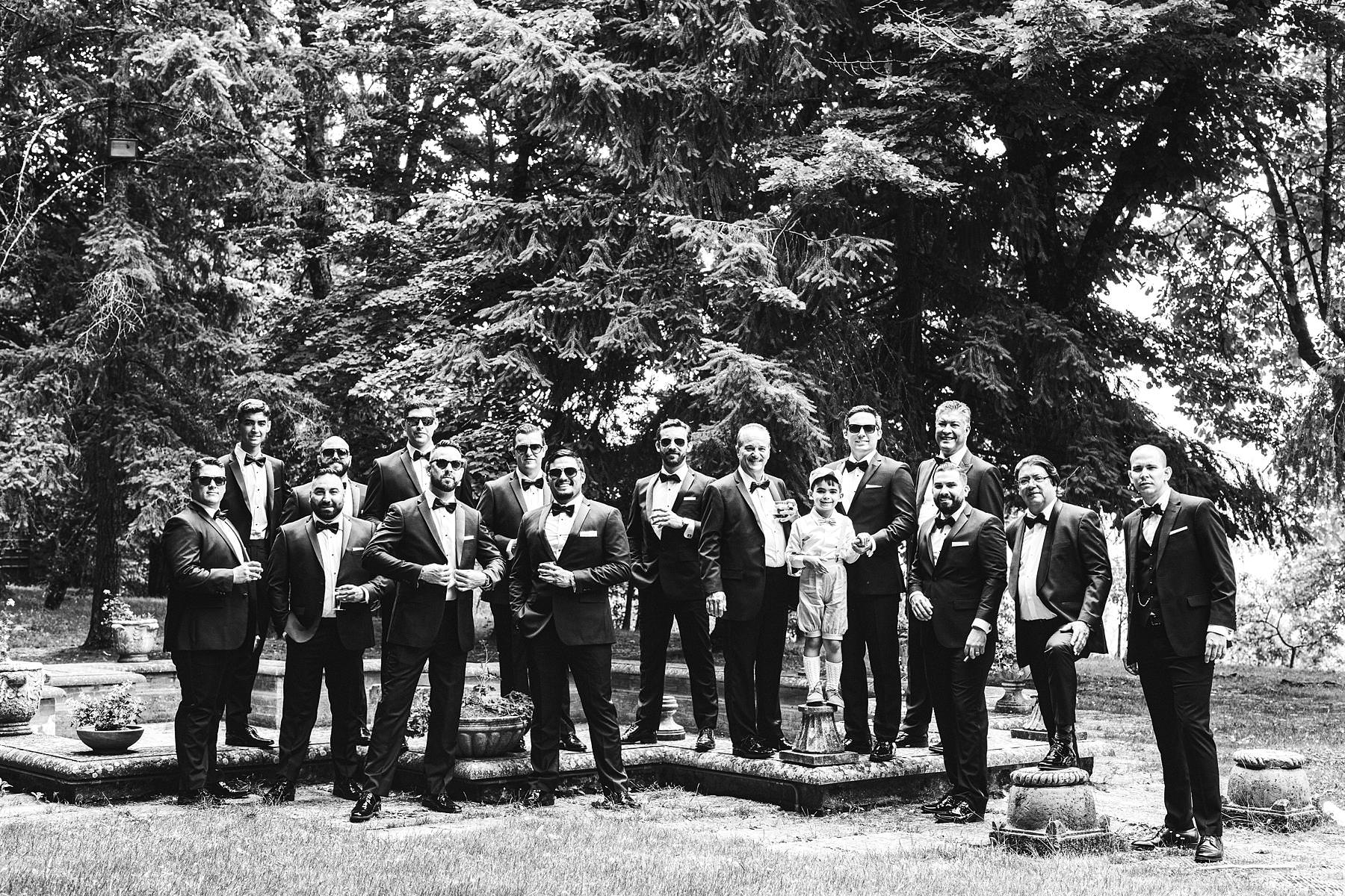 Great groom with groomsmen wedding portrait at Valenzano Castle in Tuscany near Arezzo. Photo by the Italian elegant modern wedding photographer in Tuscany based Florence Gabriele Fani