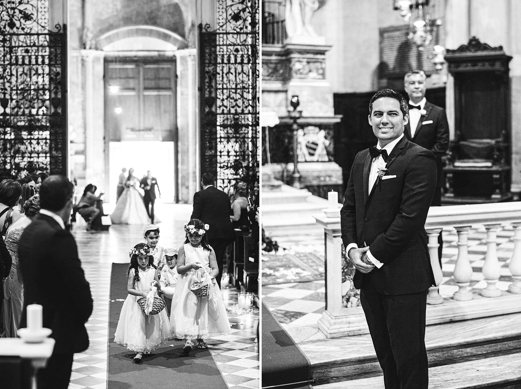 Lovely flower girls walks down the aisle in the Arezzo Cathedral. Elegant destination wedding in Arezzo and Valenzano Castle. Photo by the Italian elegant modern wedding photographer in Tuscany based Florence Gabriele Fani