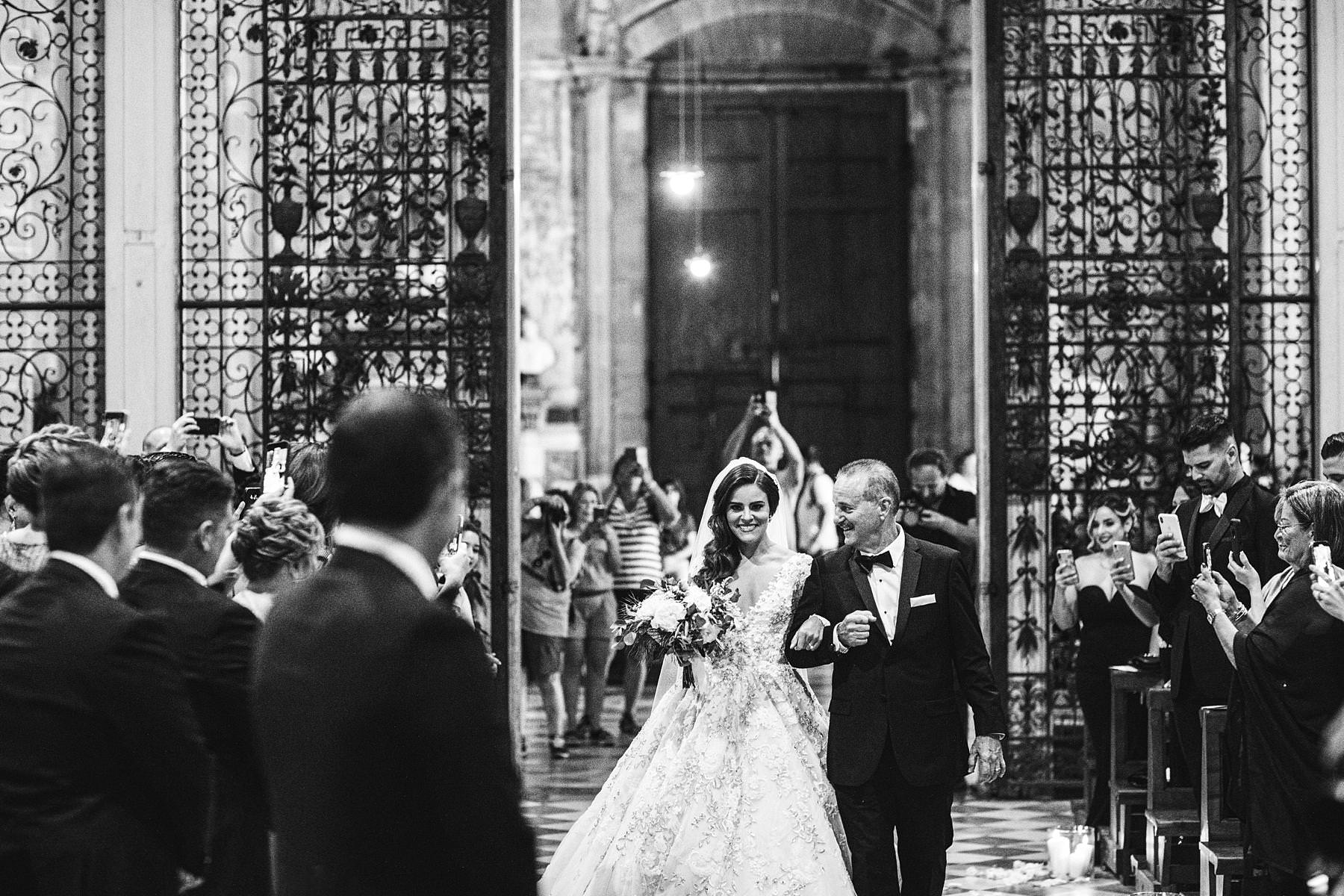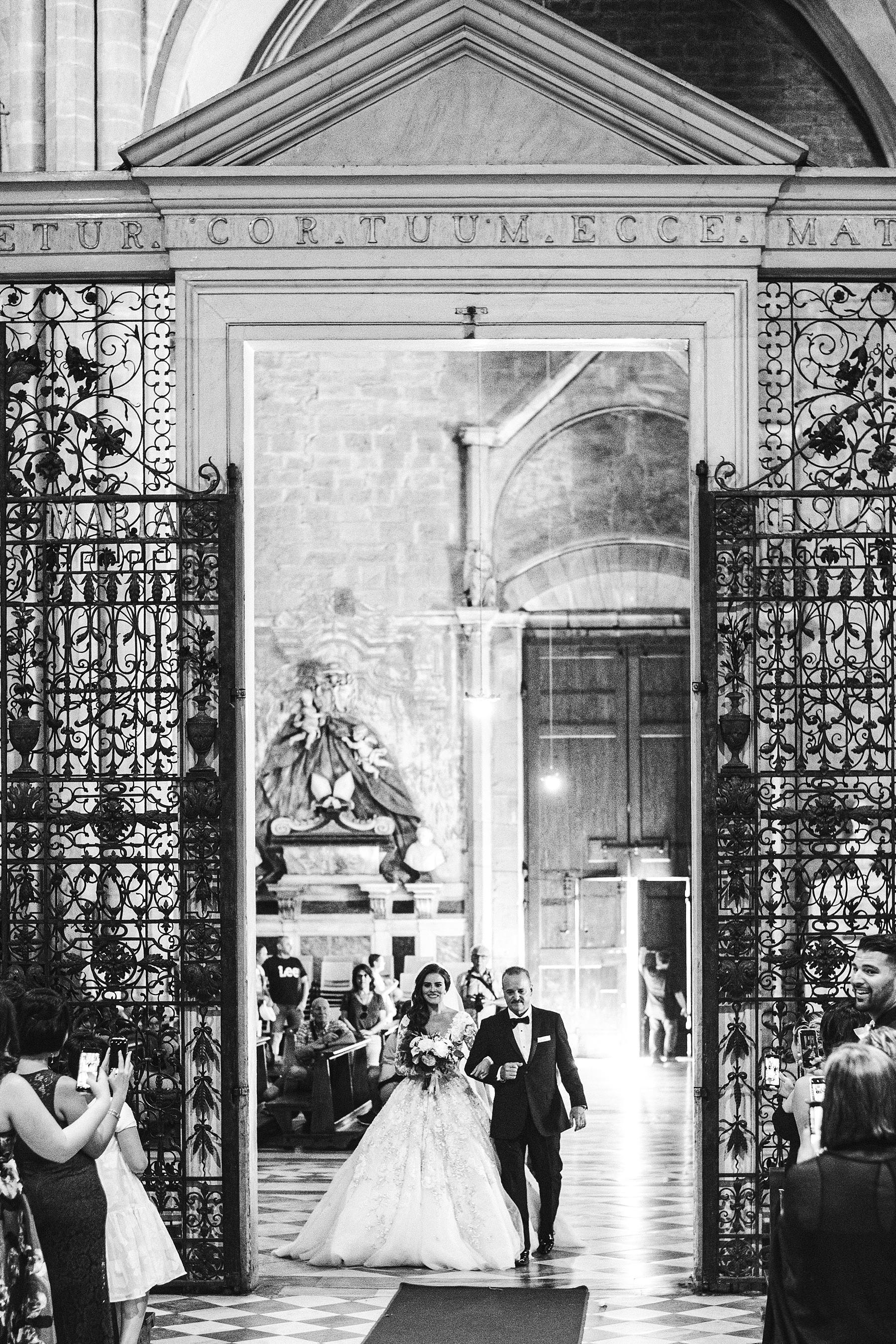 Beautiful bride Ilyssa in her Ysa Makino wedding gown walks down the aisle of Arezzo Cathedral with Father. Elegant destination castle wedding in Tuscany. Photo by the Italian elegant modern wedding photographer in Tuscany based Florence Gabriele Fani