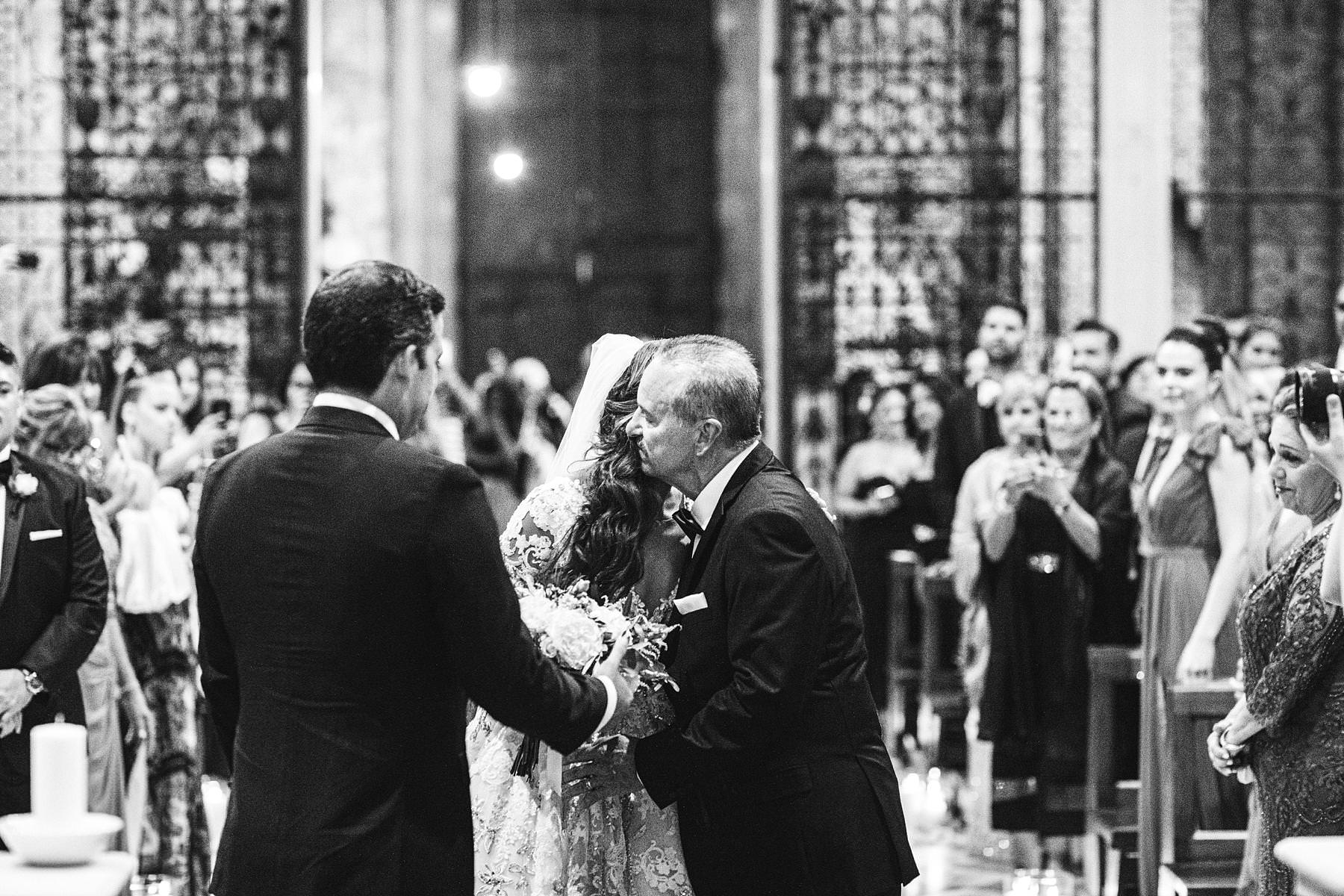 Beautiful bride Ilyssa in her Ysa Makino wedding gown walks down the aisle of Arezzo Cathedral with Father see for the first time the groom Alex. Elegant destination castle wedding in Tuscany with catholic ceremony in Arezzo.Photo by the Italian elegant modern wedding photographer in Tuscany based Florence Gabriele Fani
