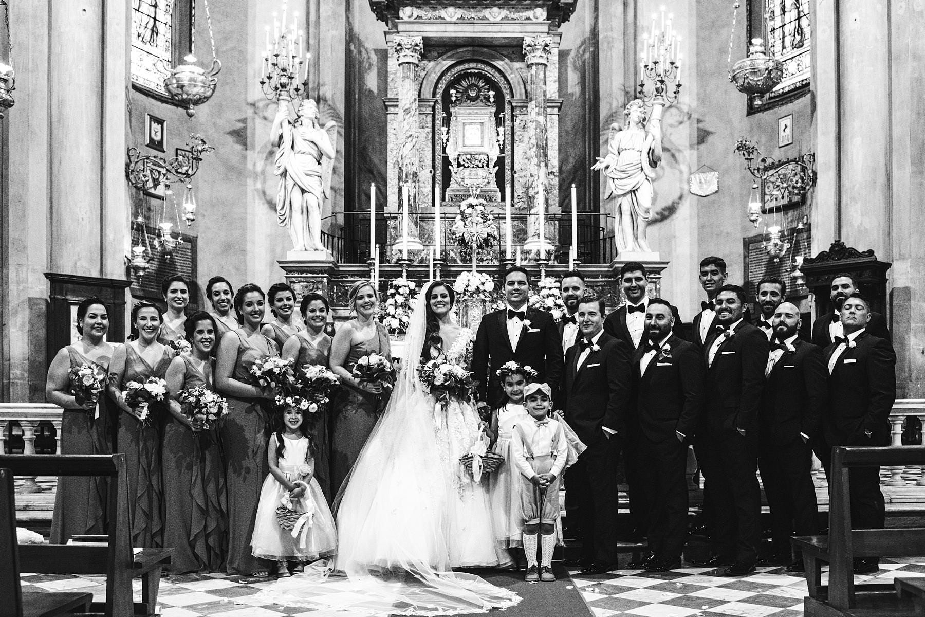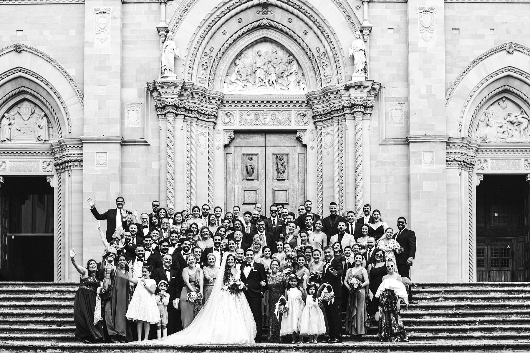 Rippling and sumptuous Tuscany wedding in the elegant Castle of Valenzano. Timeless and charm elegant bride and groom group photo at Arezzo Cathedral. Photo by the Italian elegant modern wedding photographer in Tuscany based Florence Gabriele Fani