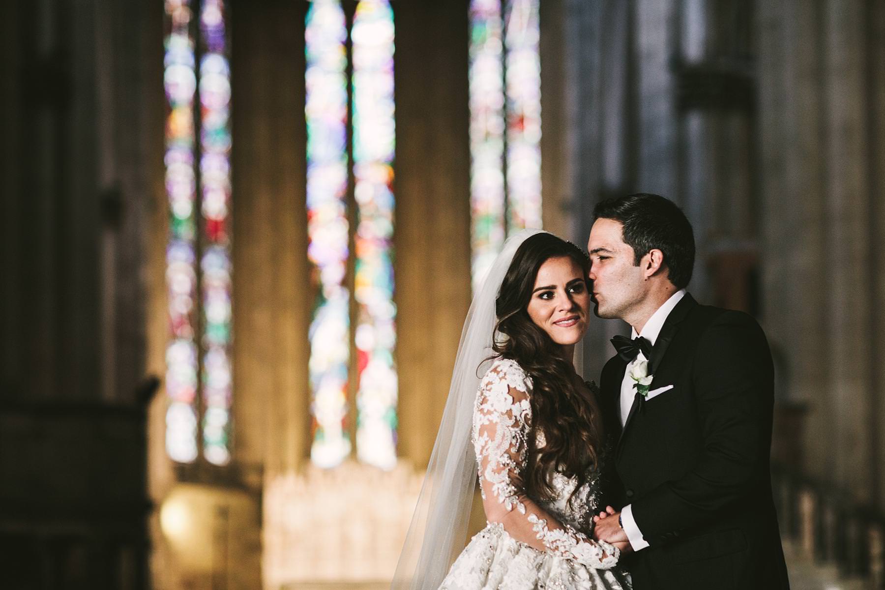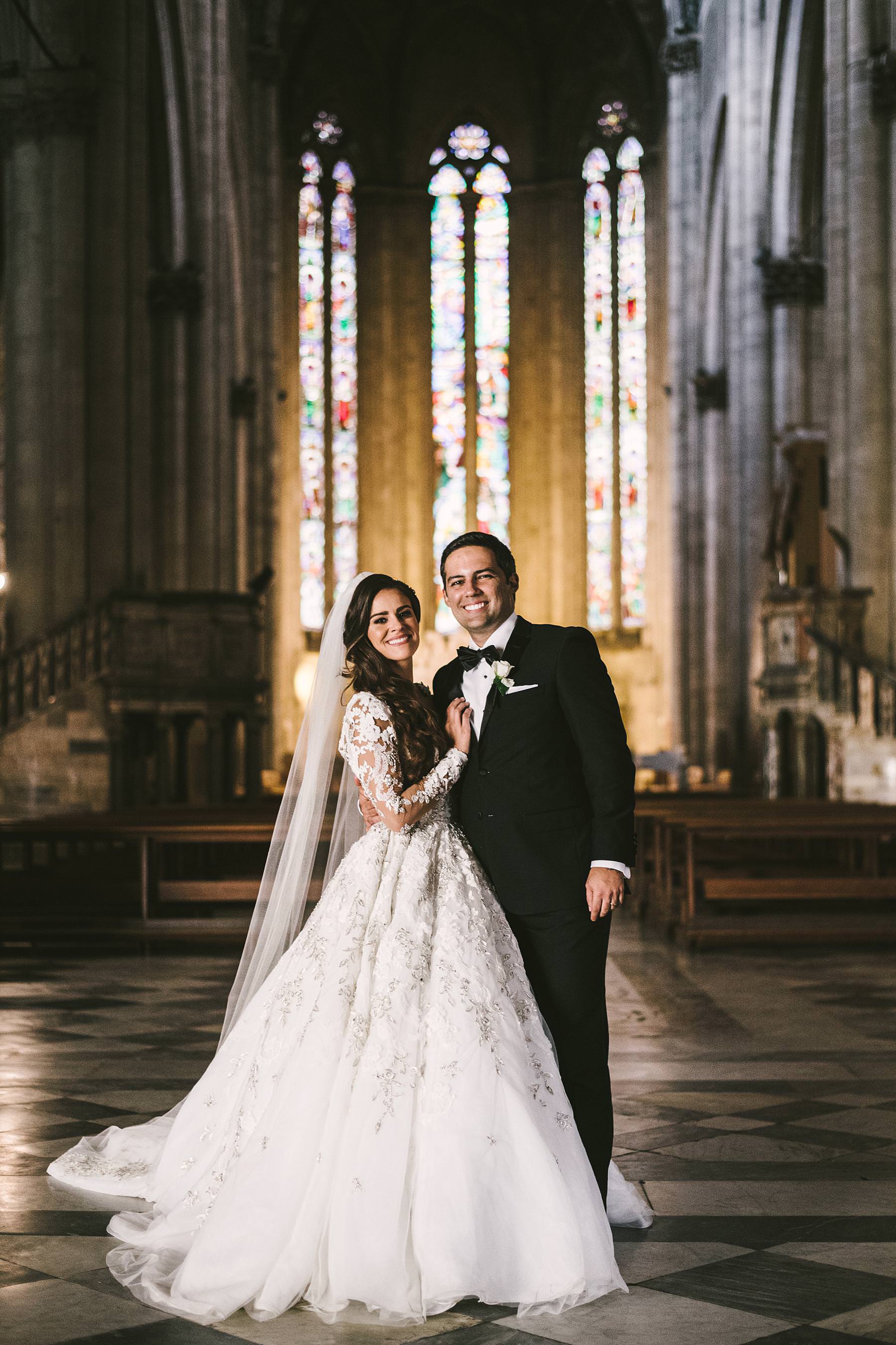 Lovely bride and groom wedding portrait inside the gorgeous Cathedral of Arezzo. Photo by the Italian elegant modern wedding photographer in Tuscany based Florence Gabriele Fani