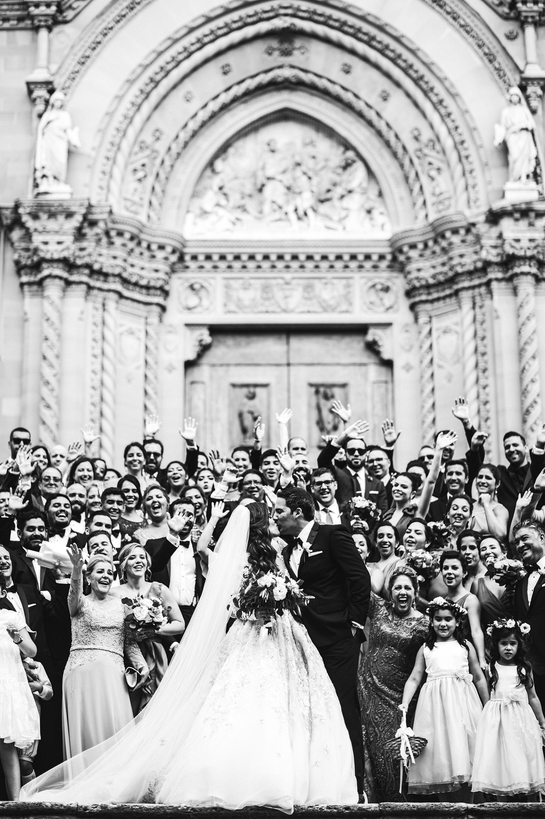 Rippling and sumptuous Tuscany wedding in the elegant Castle of Valenzano. Elegant and exciting bride and groom group photo at Arezzo Cathedral. Photo by the Italian elegant modern wedding photographer in Tuscany based Florence Gabriele Fani