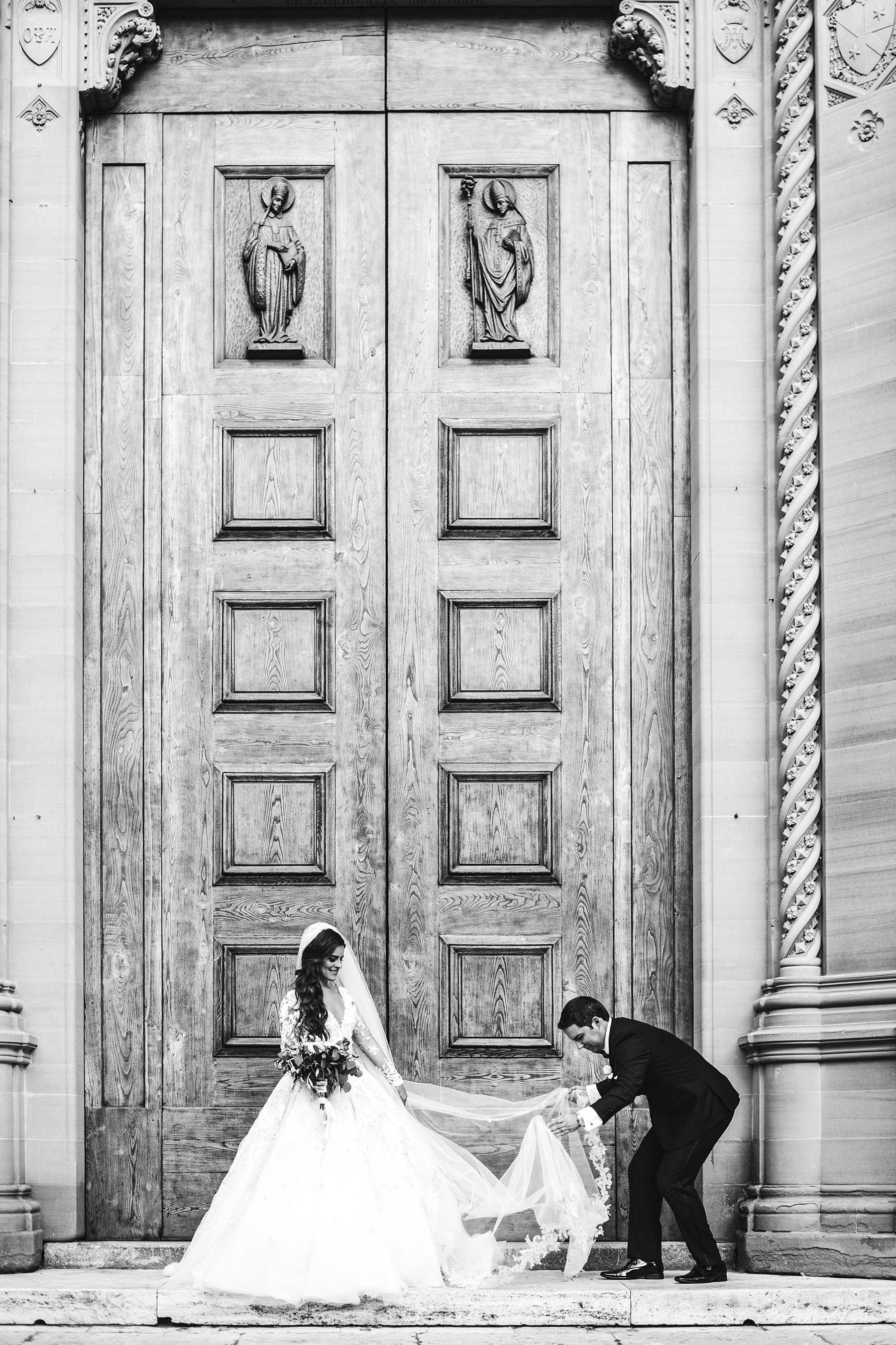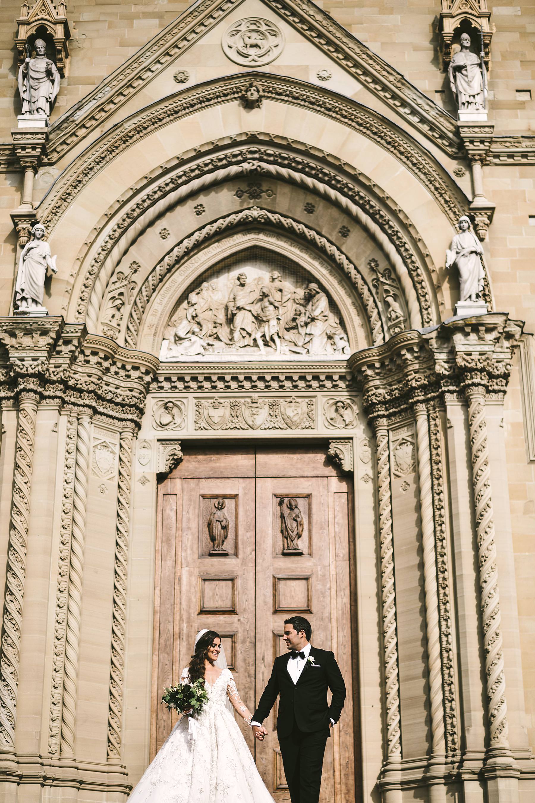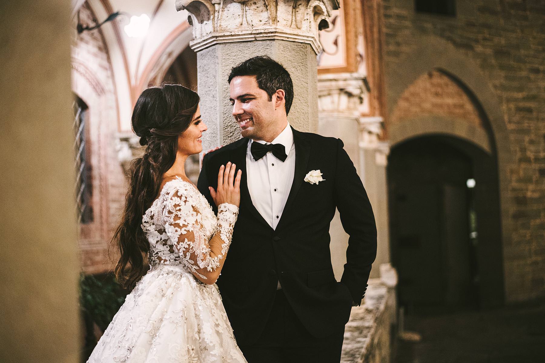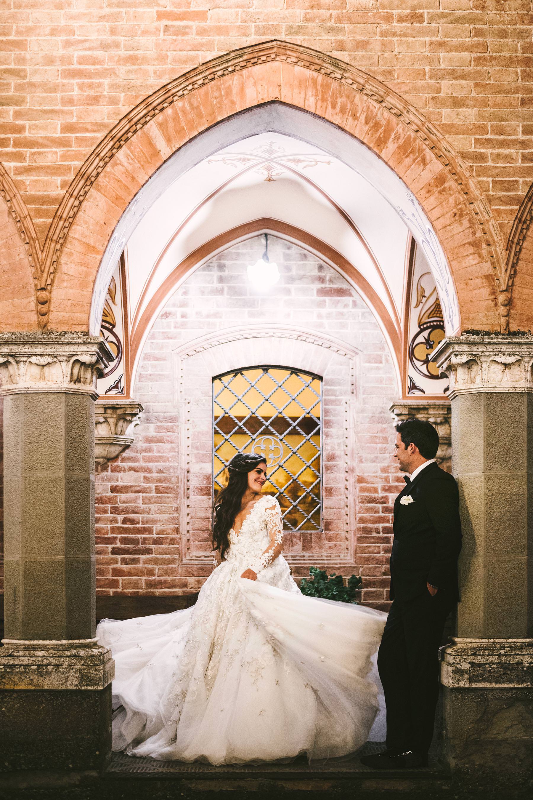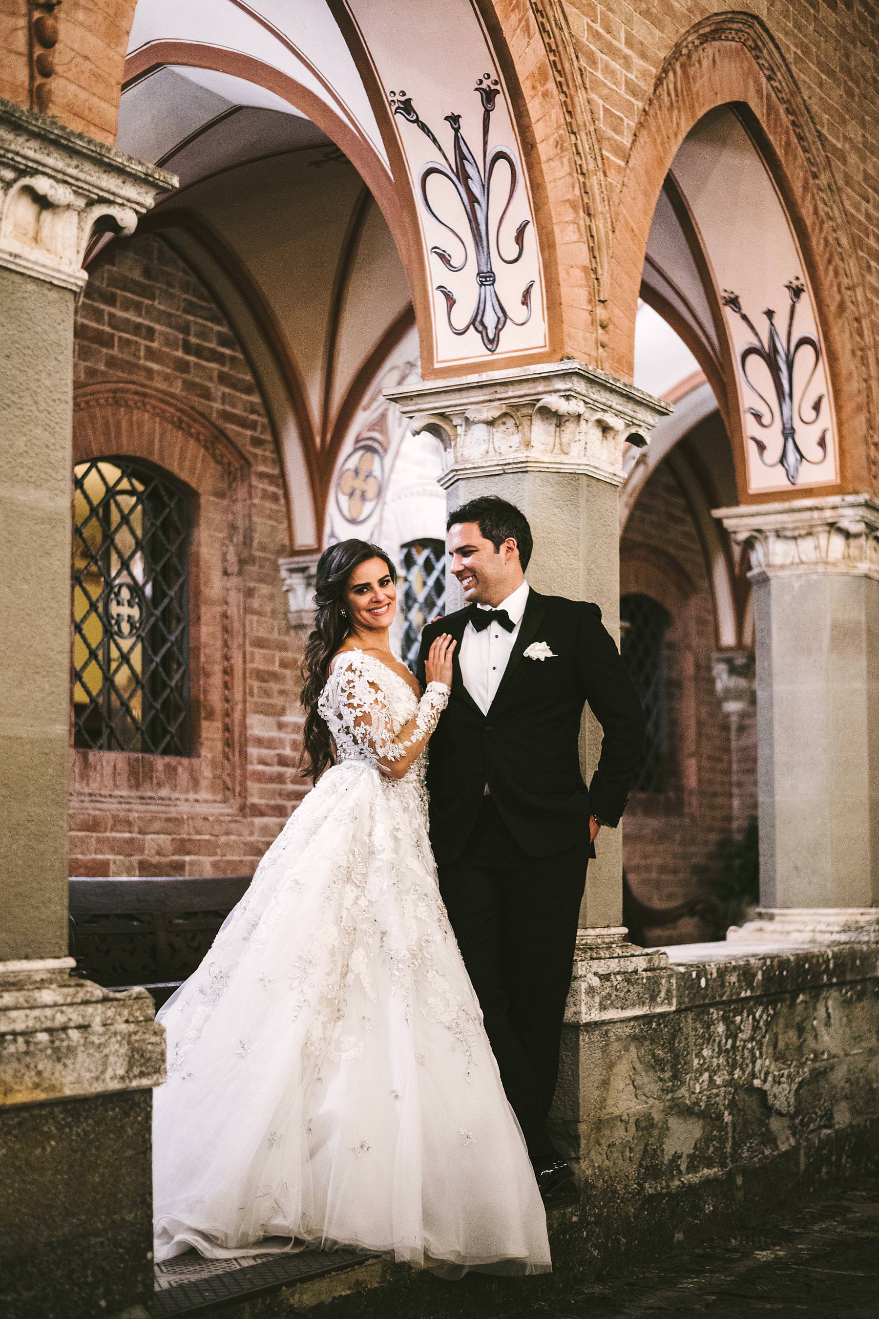Elegant bride Ilyssa and groom Alex portrait session in Arezzo at Cathedral. Destination wedding in Tuscany at Arezzo and Valenzano Castle. Photo by the Italian elegant modern wedding photographer in Tuscany based Florence Gabriele Fani